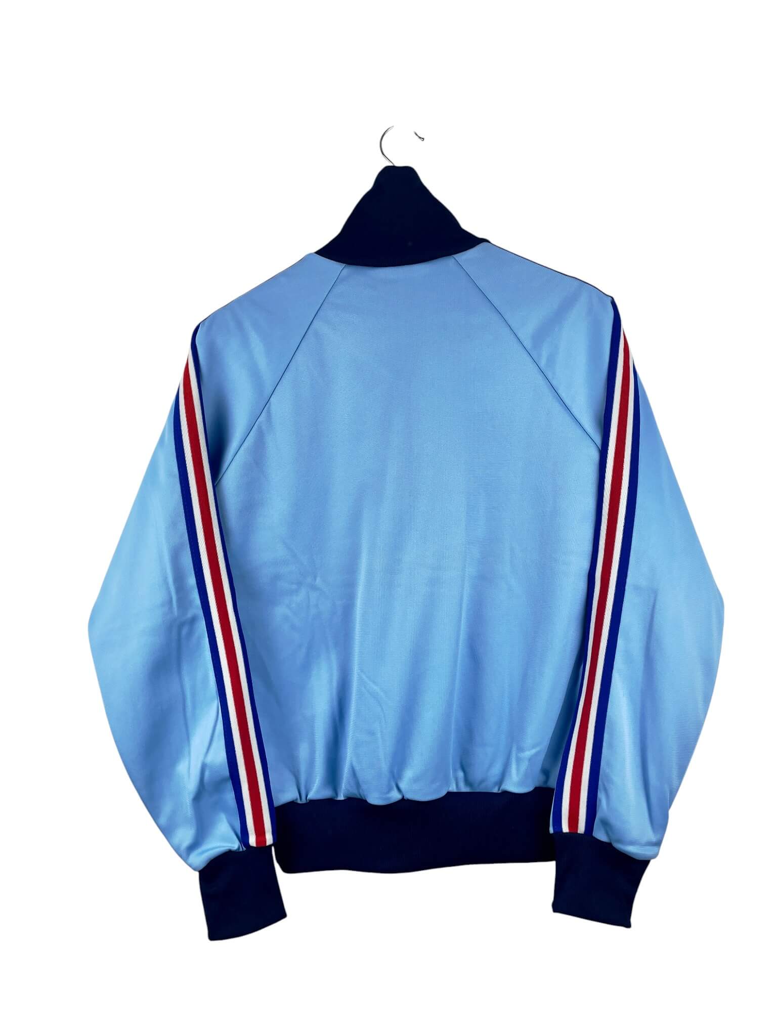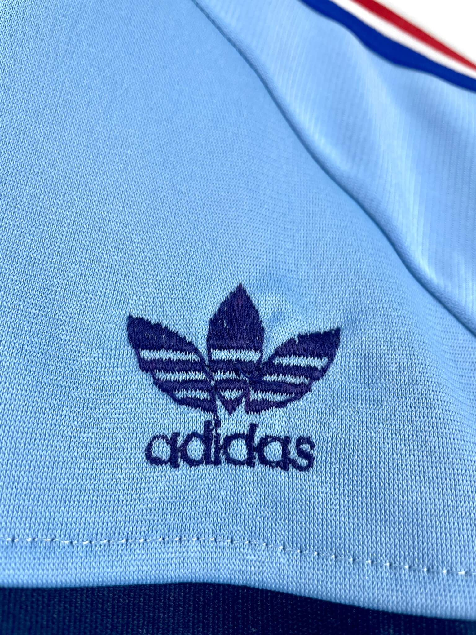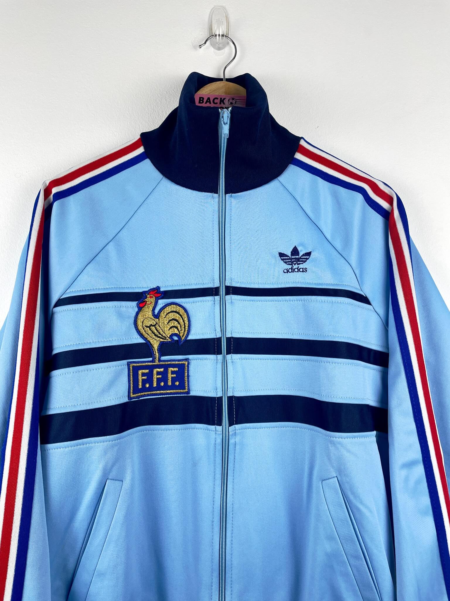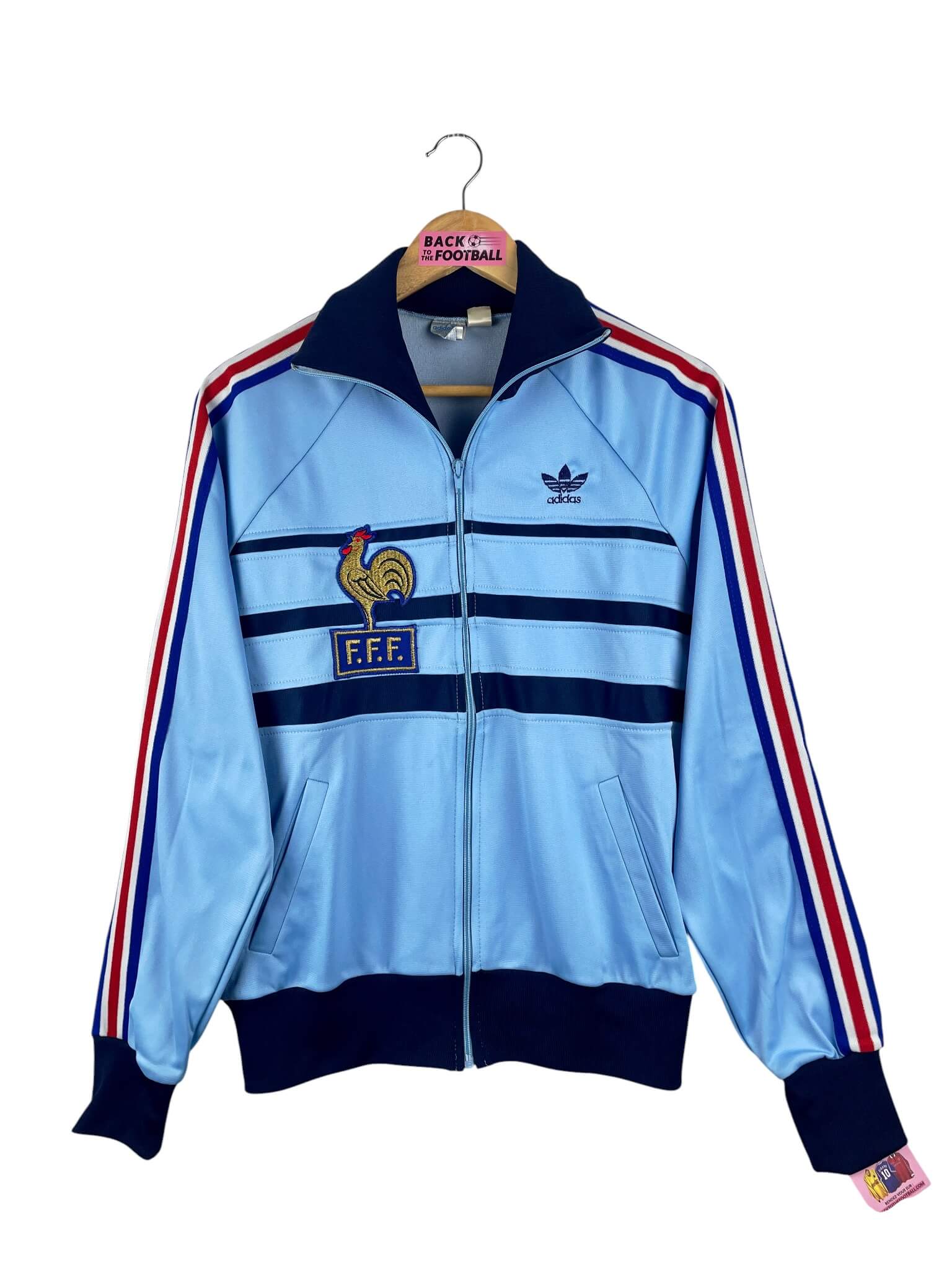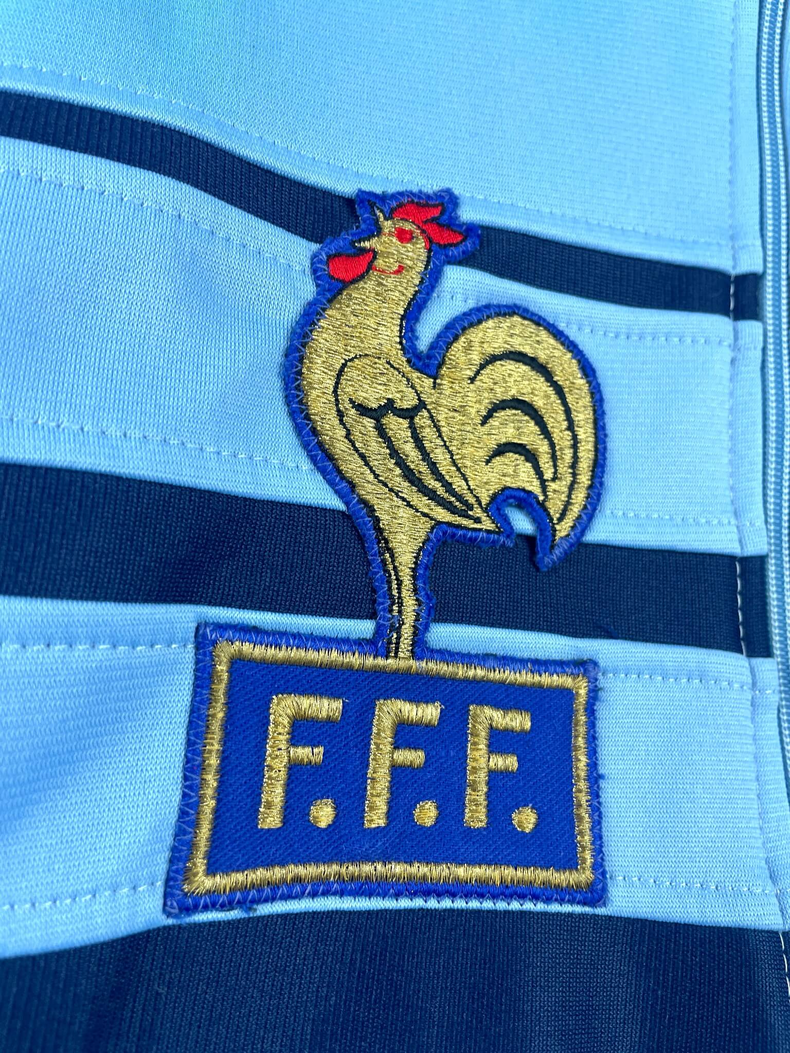 La veste : veste vintage de l’équipe de France 1982. L’écusson et le logo Adidas à trèfle sont brodés. Il y a 2 poches latérales. Production Ventex made in France. Très belle veste rétro de l’équipe de France !
