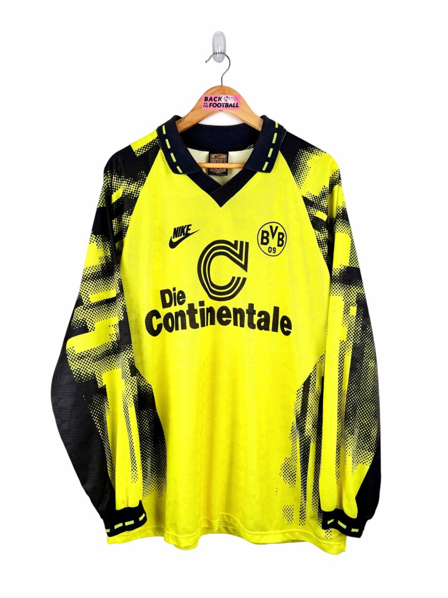 Le maillot : maillot vintage domicile du Borussia Dortmund 1992/1993 en manches longues. L’écusson, le logo Nike Futura et le sponsor Die Continentale sont incrustés au maillot. Quel design ! Très beau maillot rétro du Borussia Dortmund.