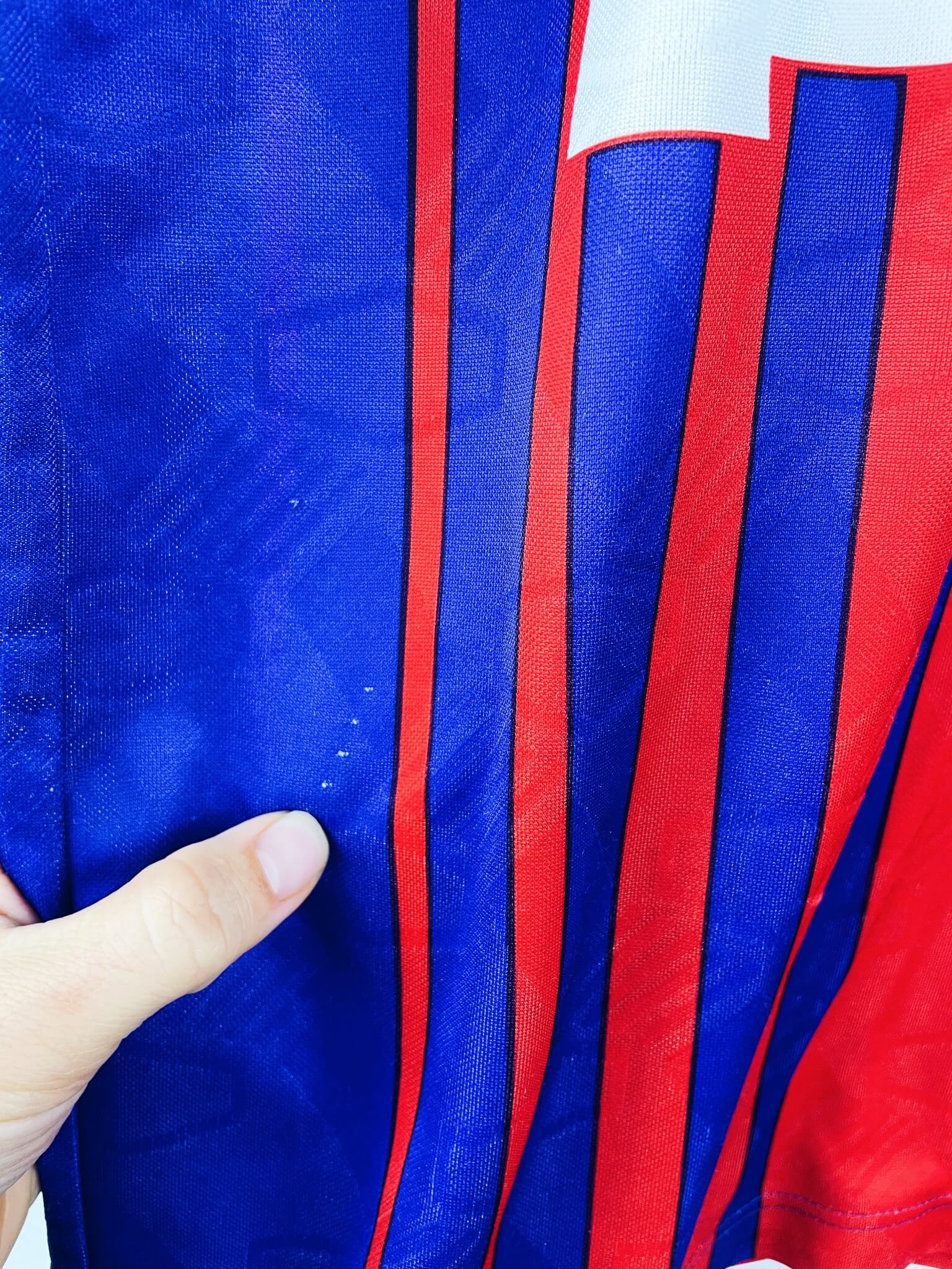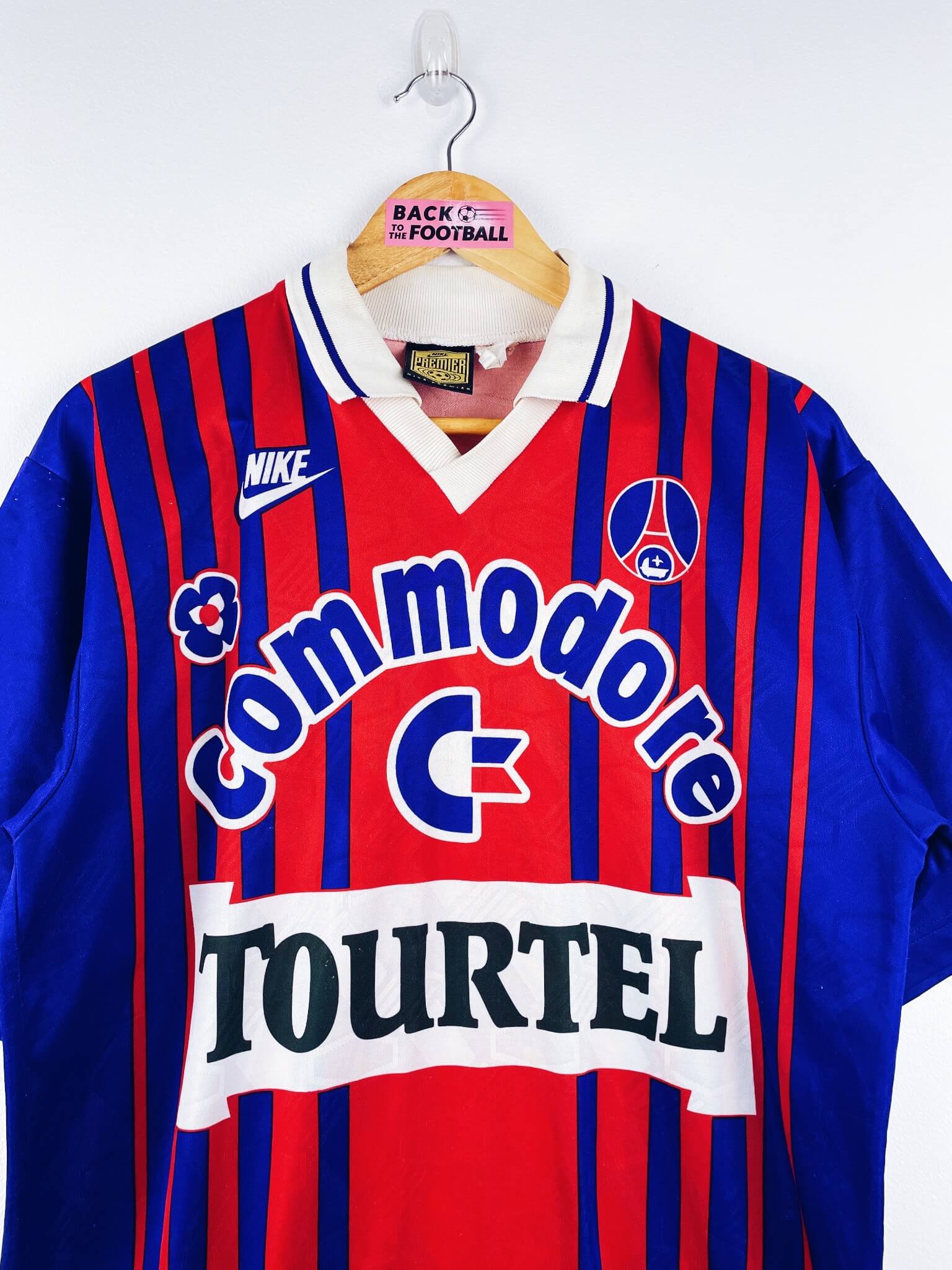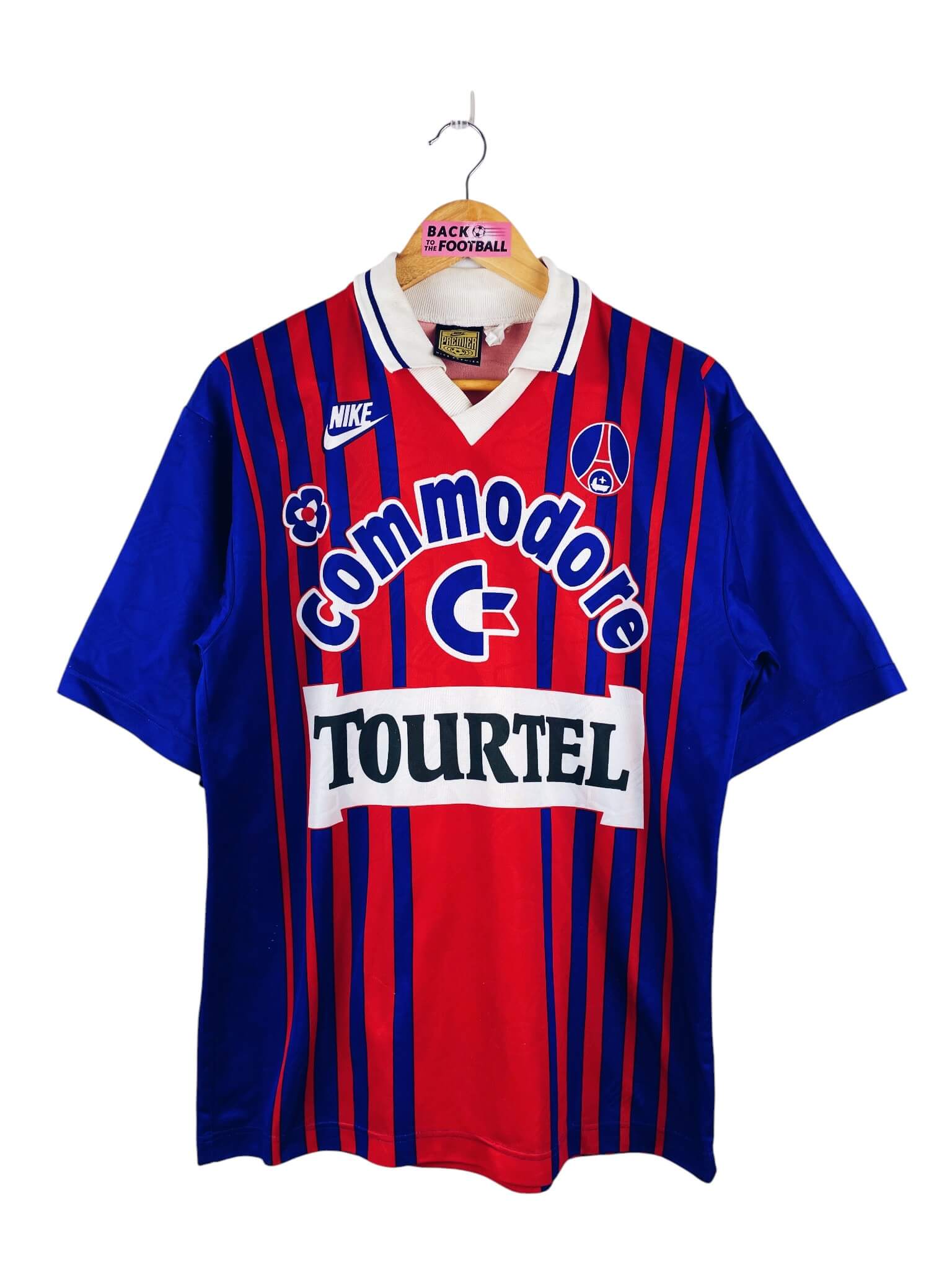 Le maillot : maillot vintage domicile du PSG 1993/1994. L’écusson, le logo Nike et les sponsors Commodore et Tourtel sont incrustés au maillot. Très beau maillot rétro du PSG !