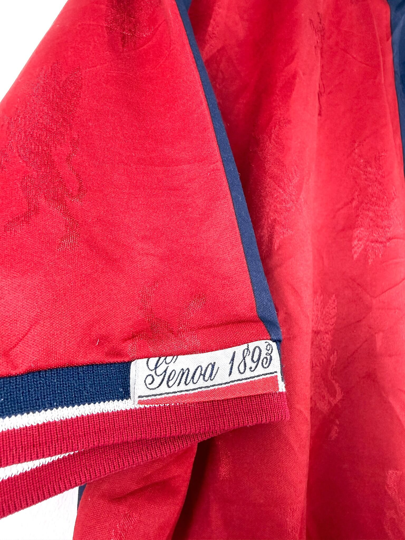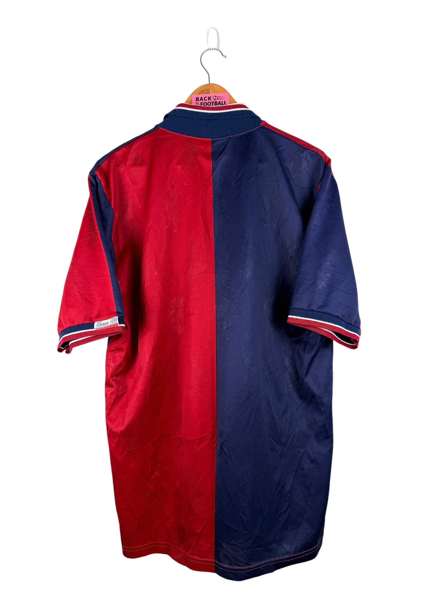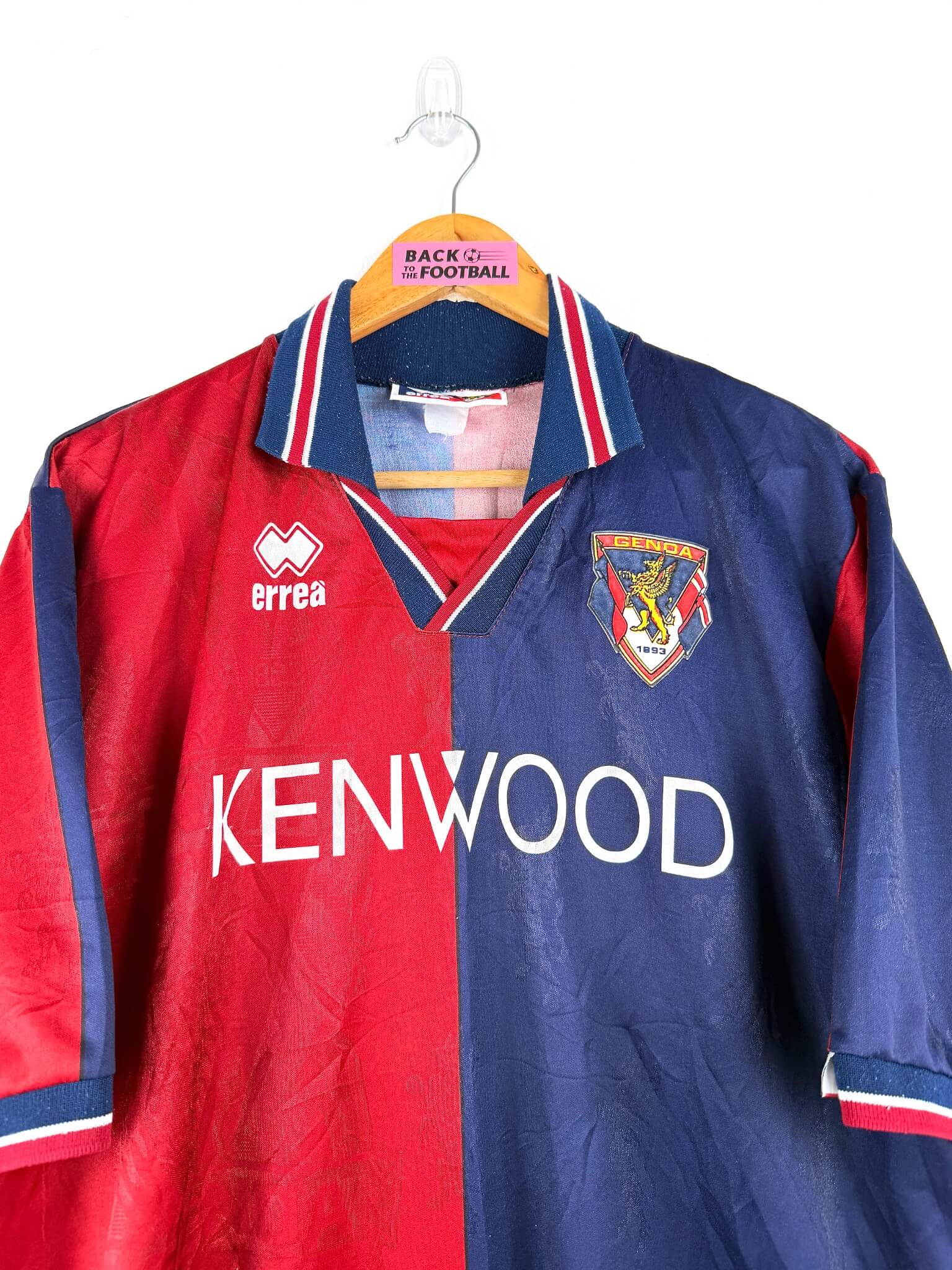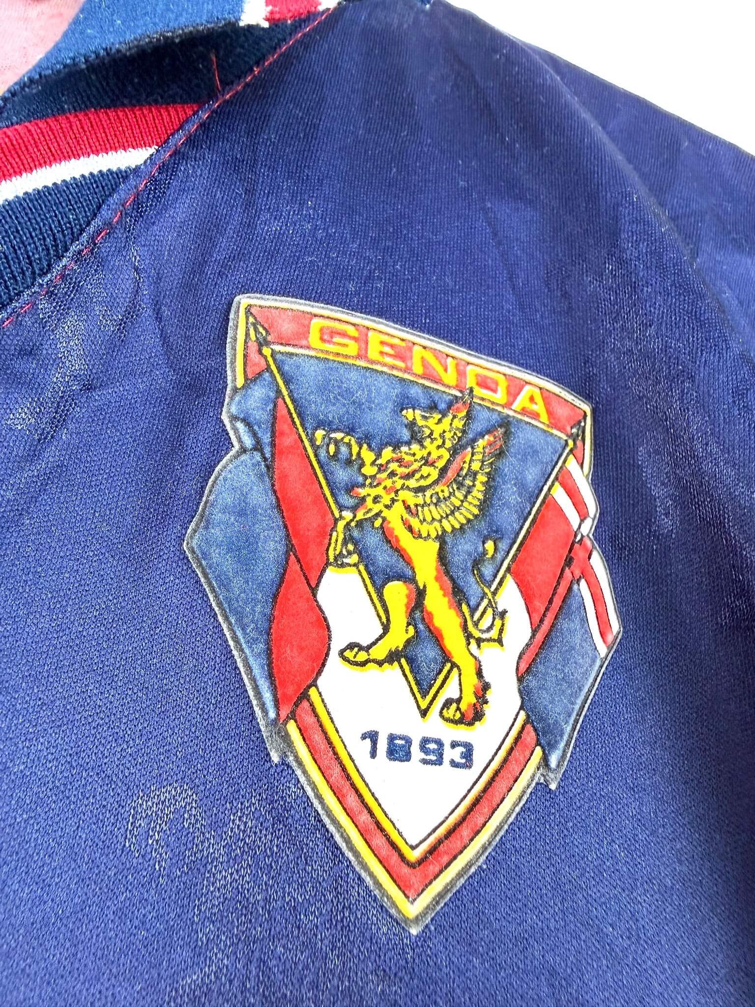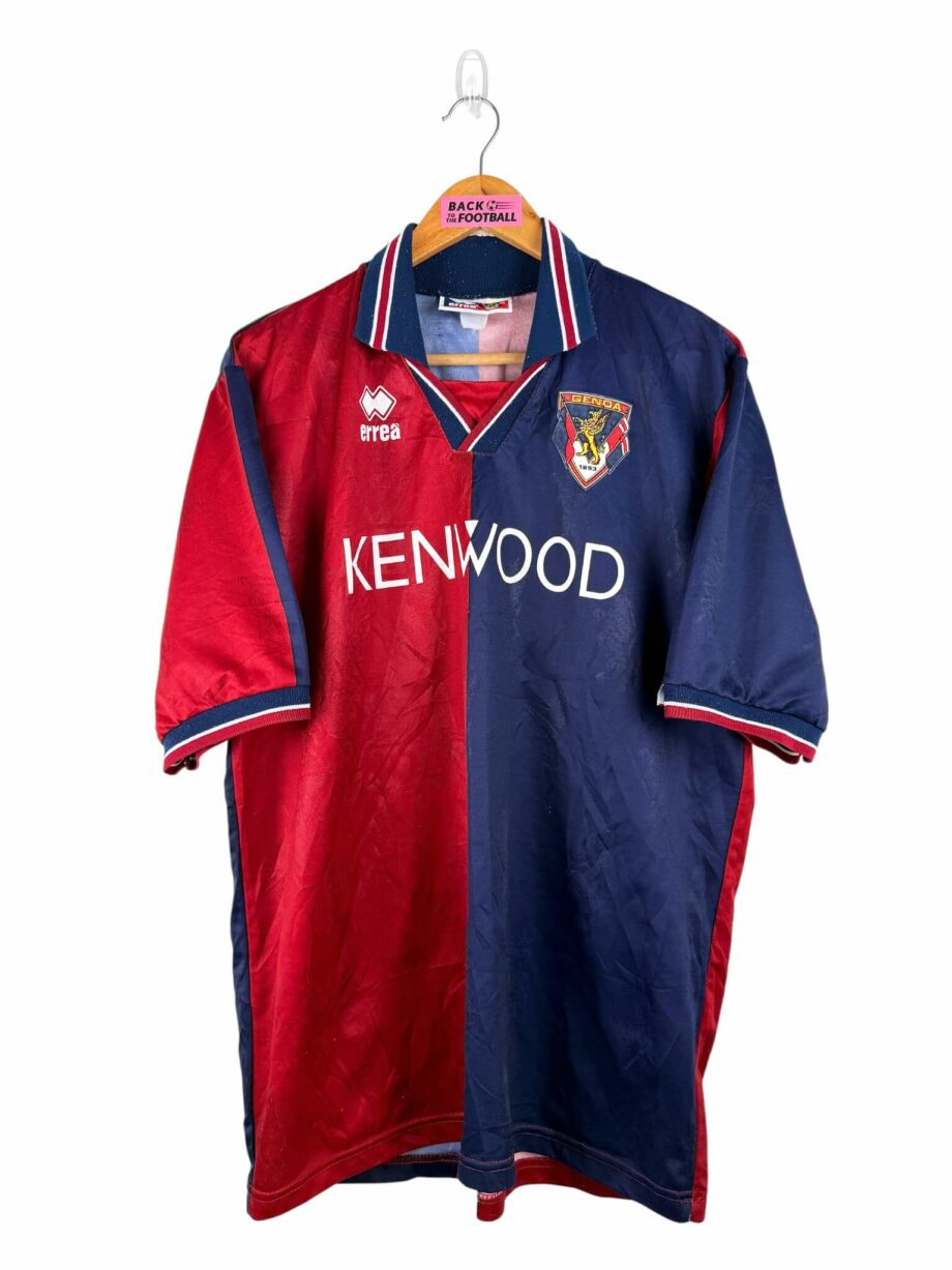 Le maillot : maillot vintage domicile du Genoa 1994/1995. L’écusson est en feutrine, le logo Errea et le sponsor Kenwood sont incrustés. Joli maillot rétro du Genoa !