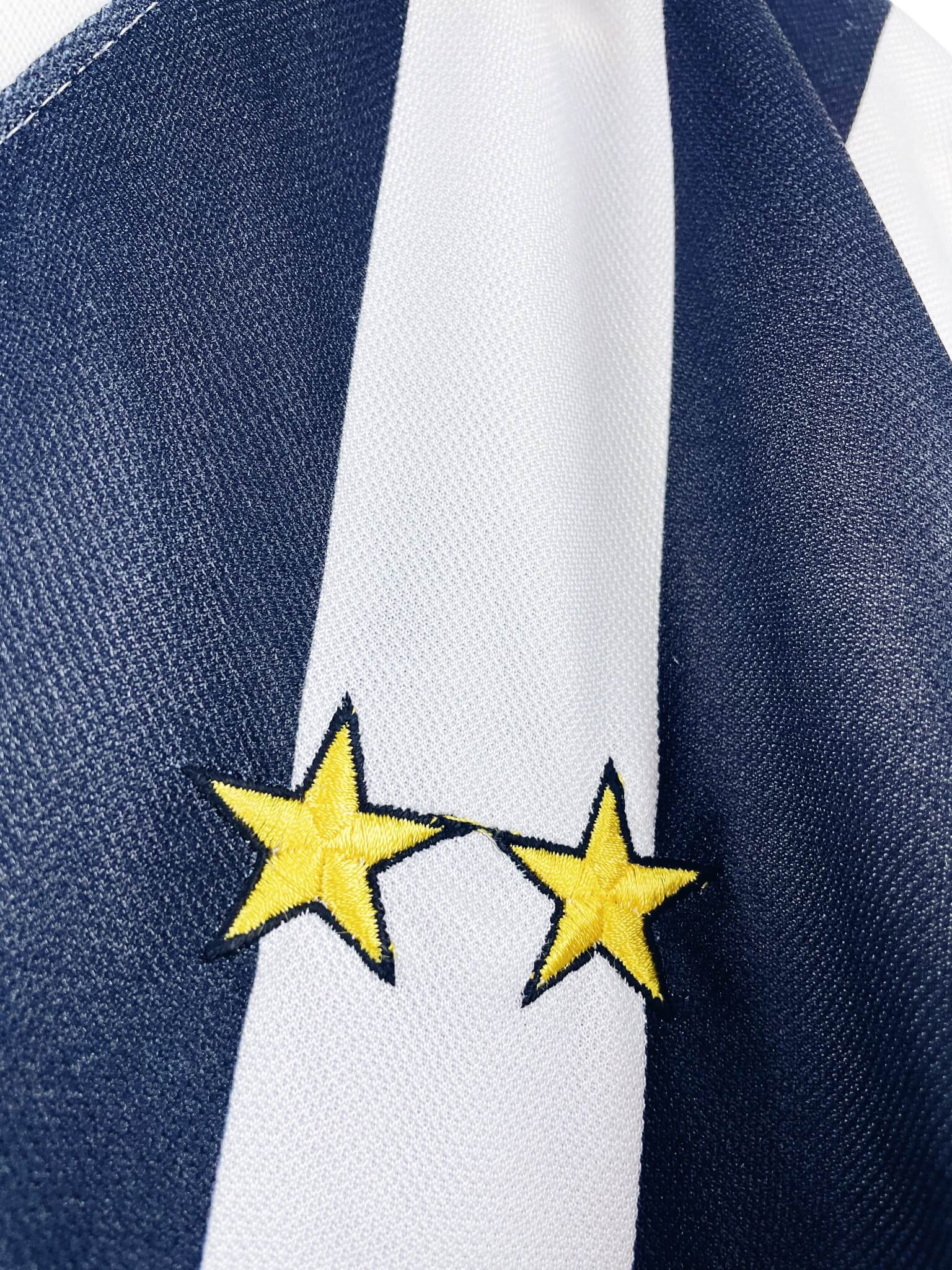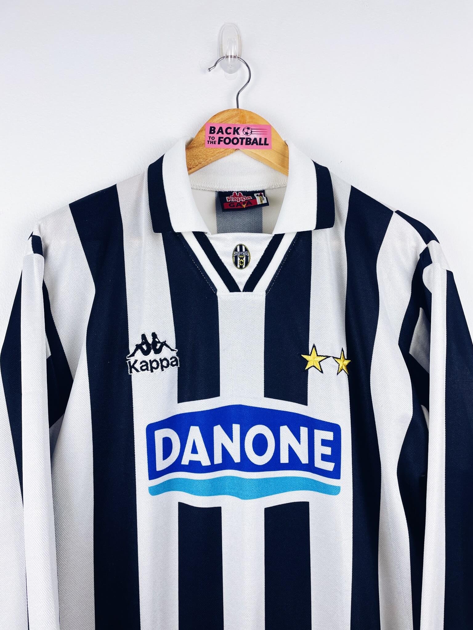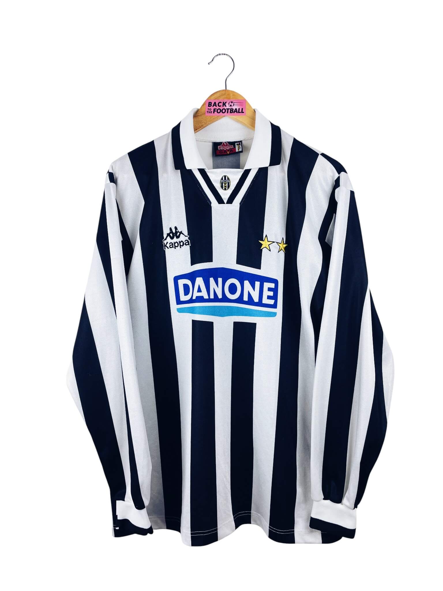 Le maillot : maillot vintage domicile de la Juventus 1994/1995 manches longues. L’écusson de la Juve est incrusté au niveau du col, laissant place aux deux étoiles brodées sur le coeur. Le logo Kappa est brodé et le sponsor Danone est incrusté. Très beau maillot rétro de la Juventus !