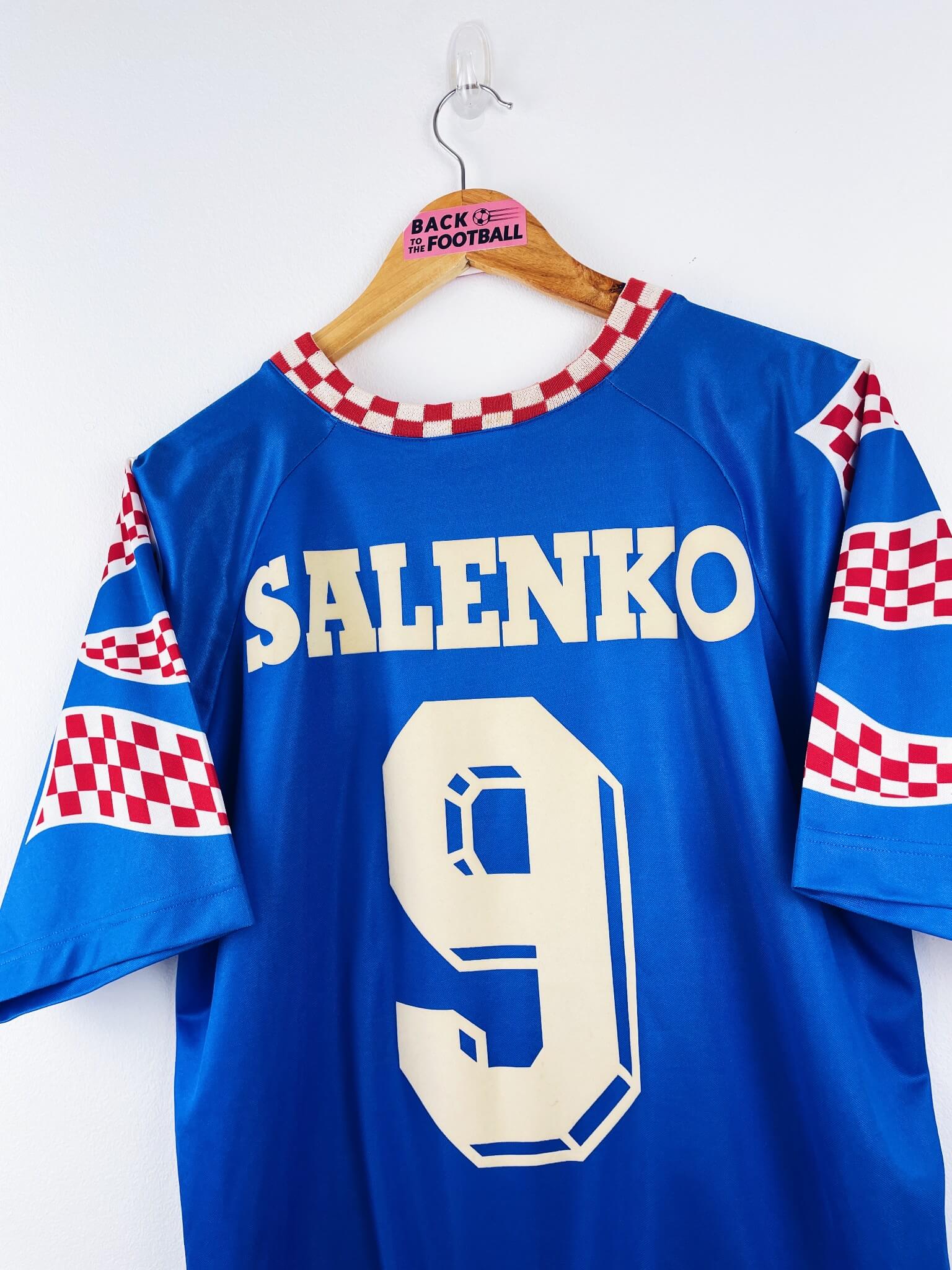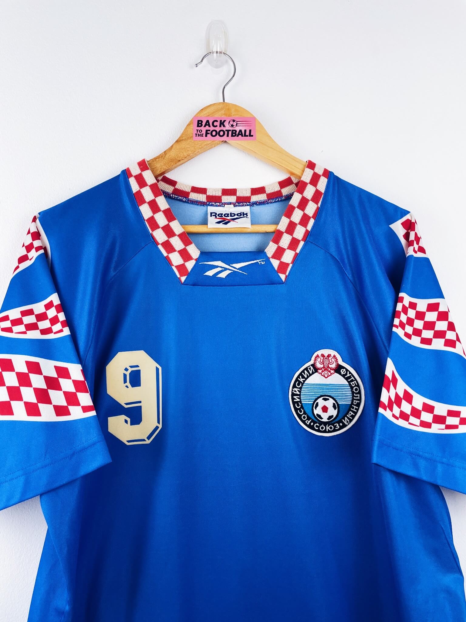 Le maillot : maillot vintage extérieur de la Russie 1994 floqué Salenko #9. L’écusson et le logo Reebok sont brodés, Salenko #9 est en feutrine. Très beau maillot rétro de la Russie !