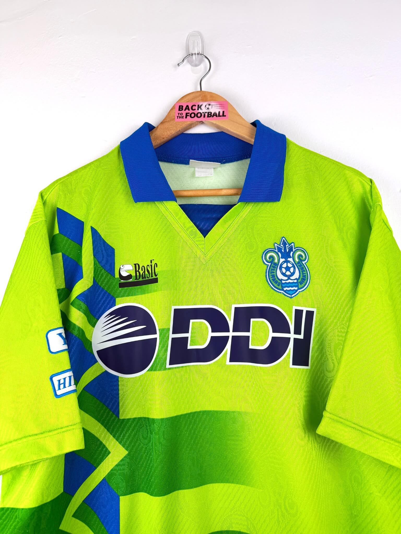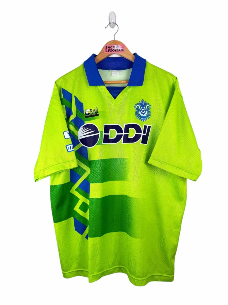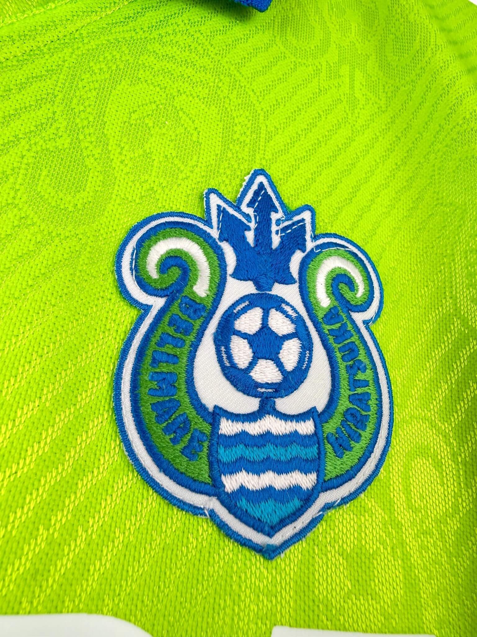 Le maillot : maillot vintage du Shonan Bellmare 1995 spécial Coupe. L’écusson est brodé, le logo Basic et le sponsor DDI sont floqués. Les patchs sur la manche sont brodés. On peut voir l’écusson en tramé. Très beau maillot rétro du Shonan Bellmare !