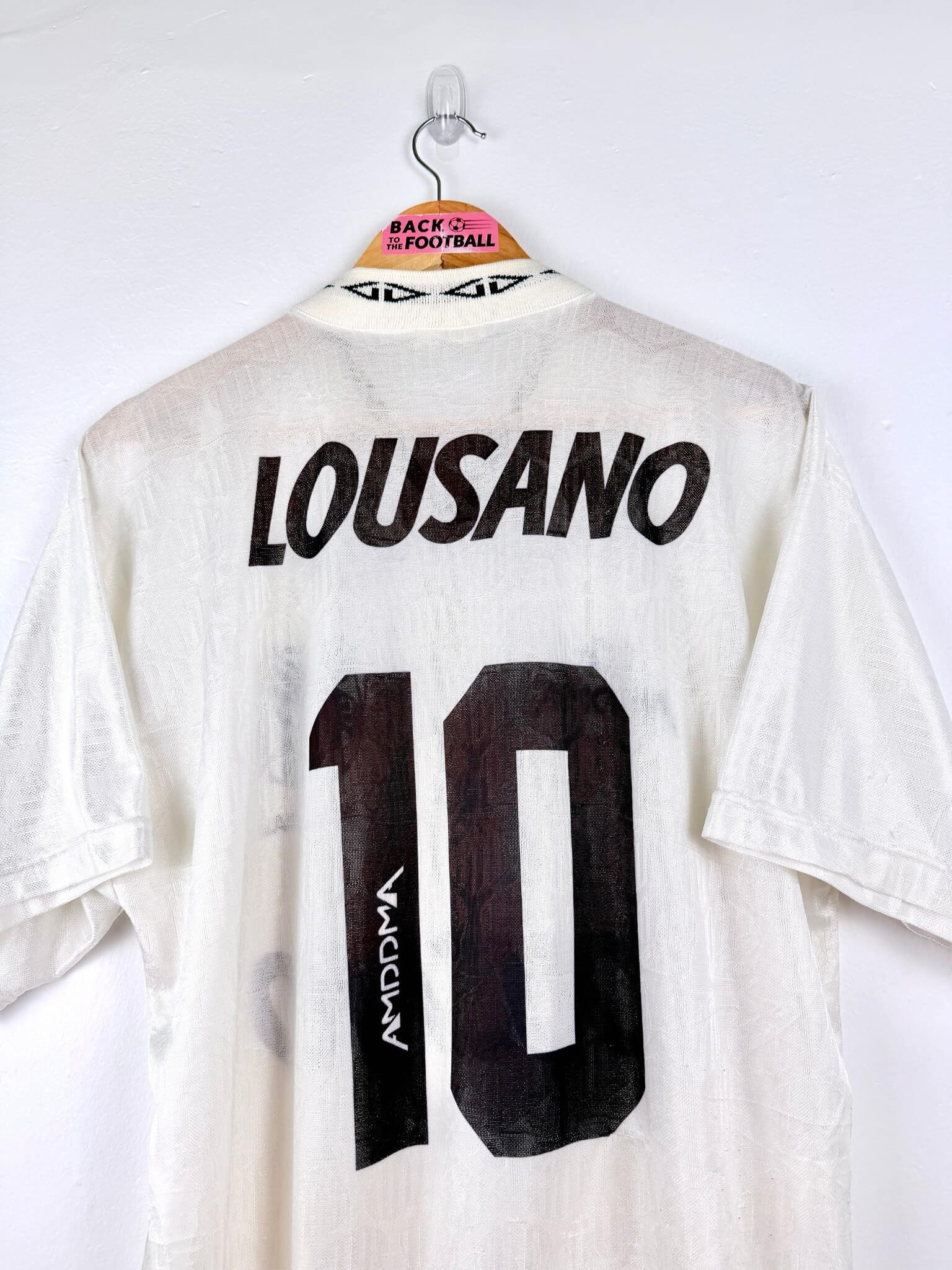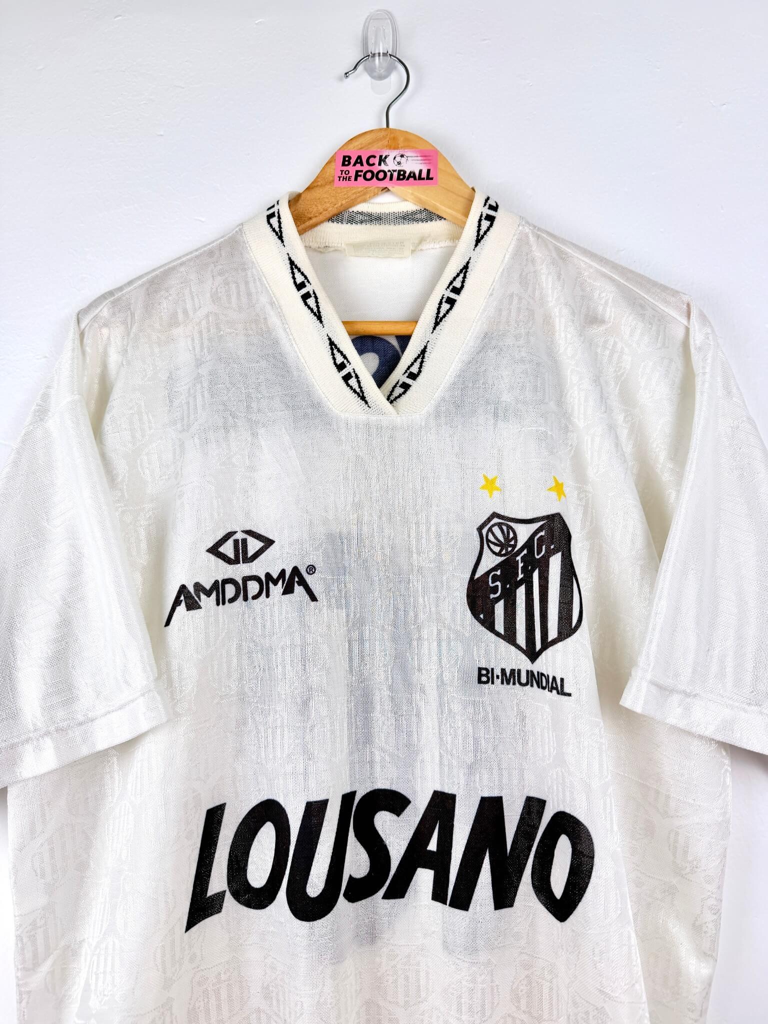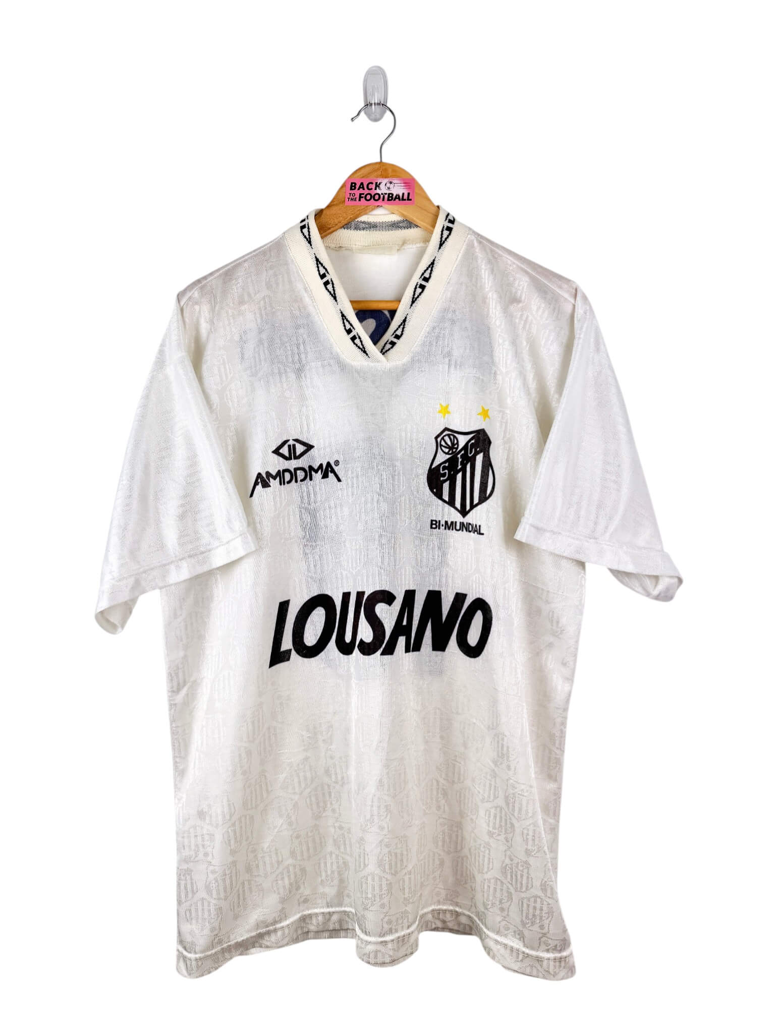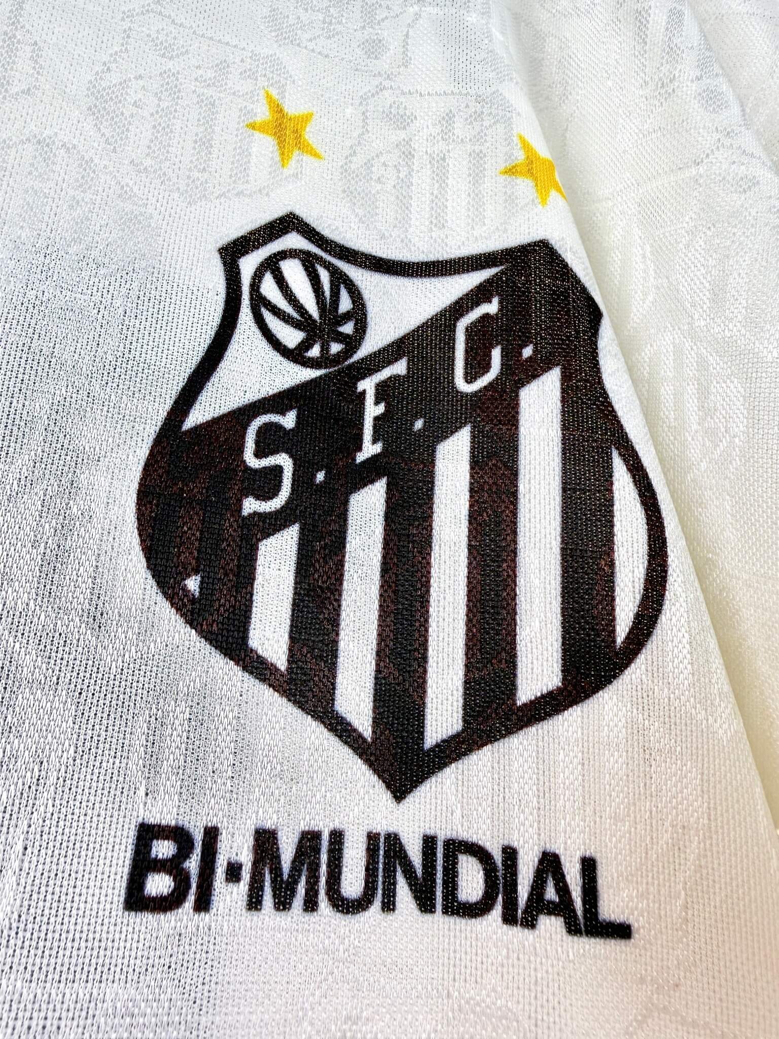 Le maillot : maillot vintage domicile Santos 1995 floqué du numéro 10. L’écusson, le logo Amddma, le sponsor Lousano et le numéro 10 sont incrustés. On peut voir l’écusson en tramé sur le tissu. Très beau maillot rétro de Santos !