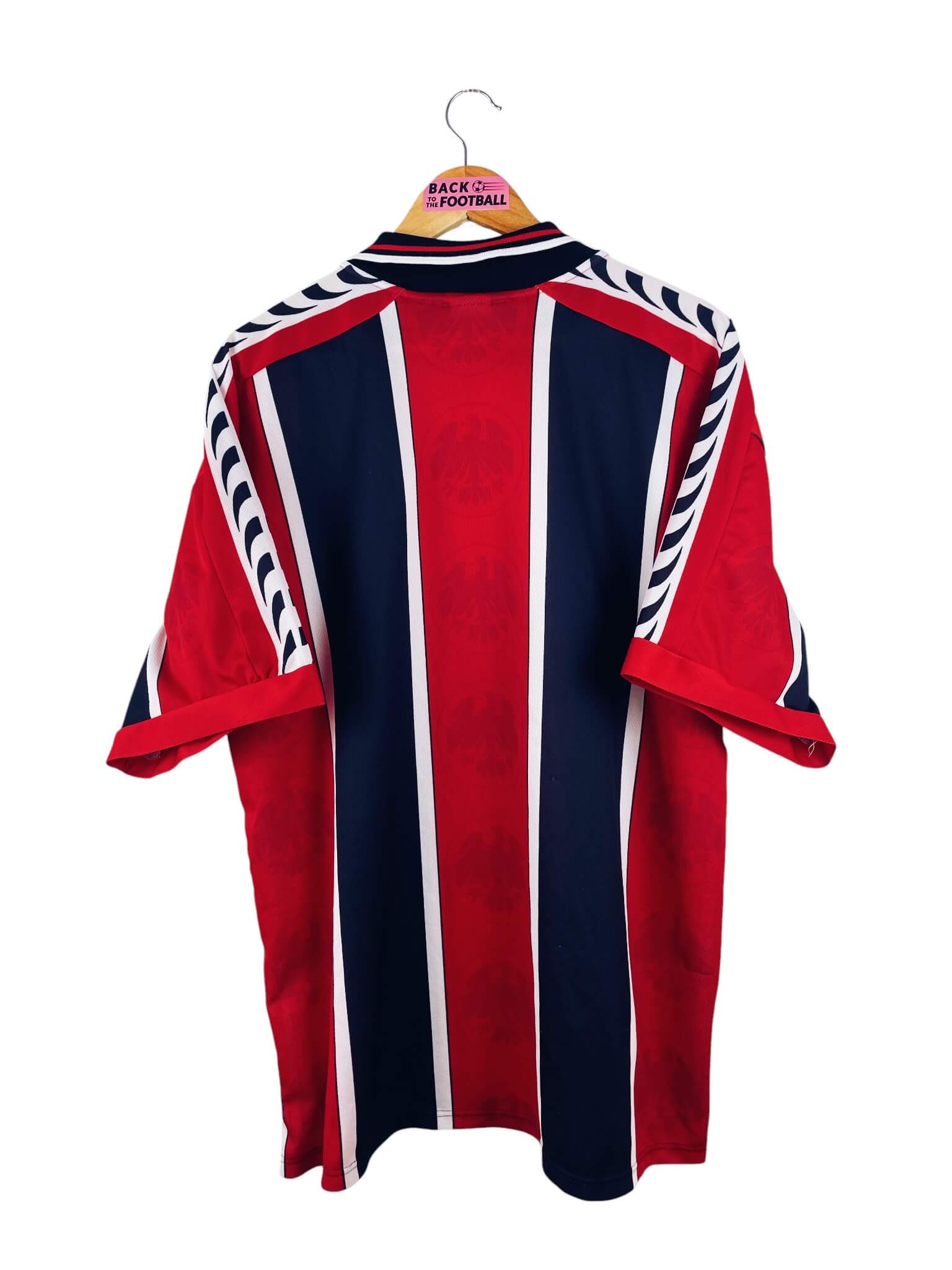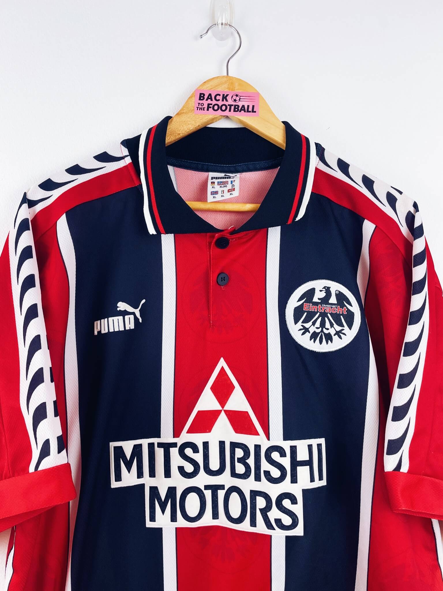 Le maillot : maillot vintage domicile de l’Eintracht Frankfurt 1996/1998. L’écusson est brodé, le logo Puma et le sponsor Mitshubishi Motors sont en feutrine. Très beau maillot rétro de Francfort !