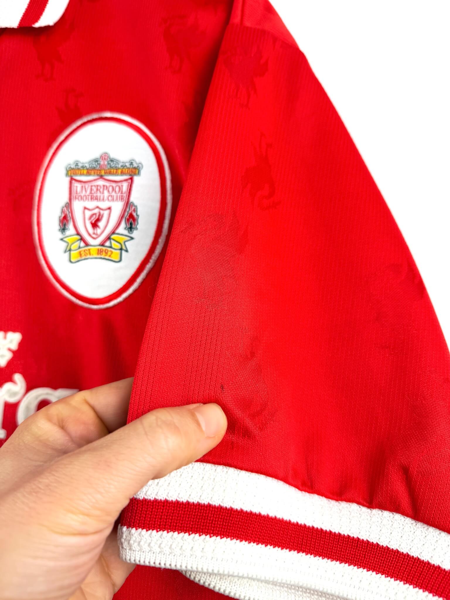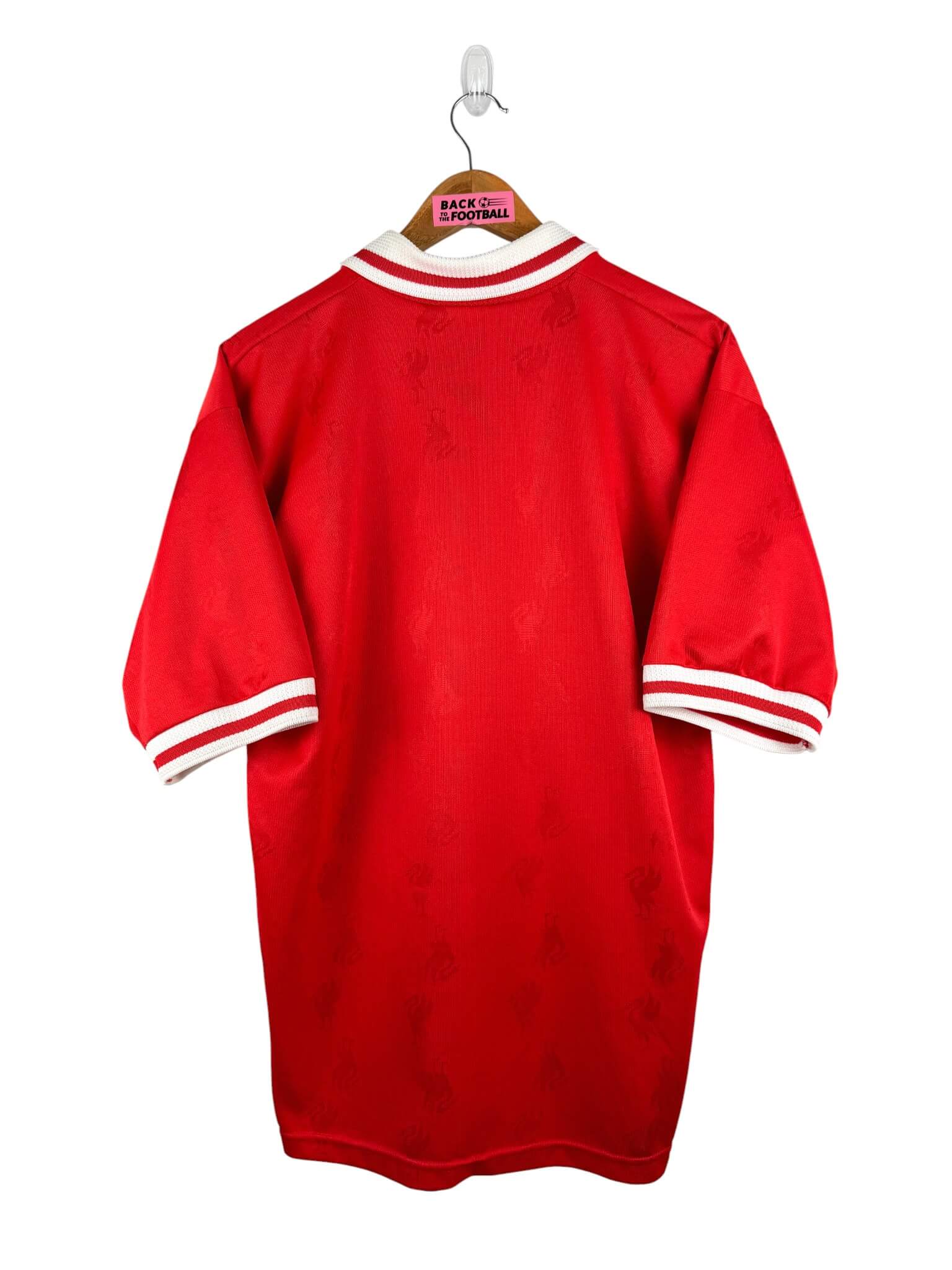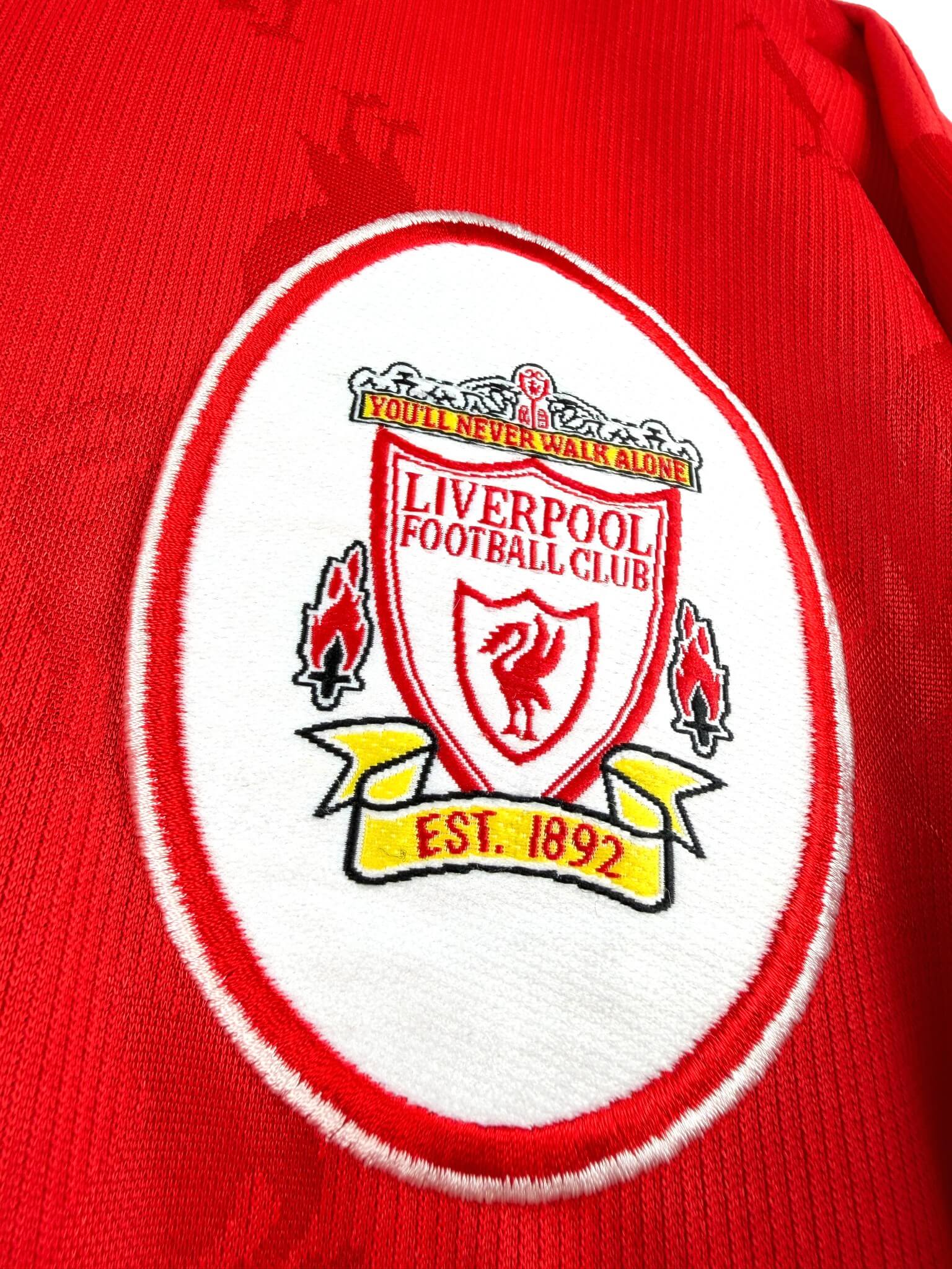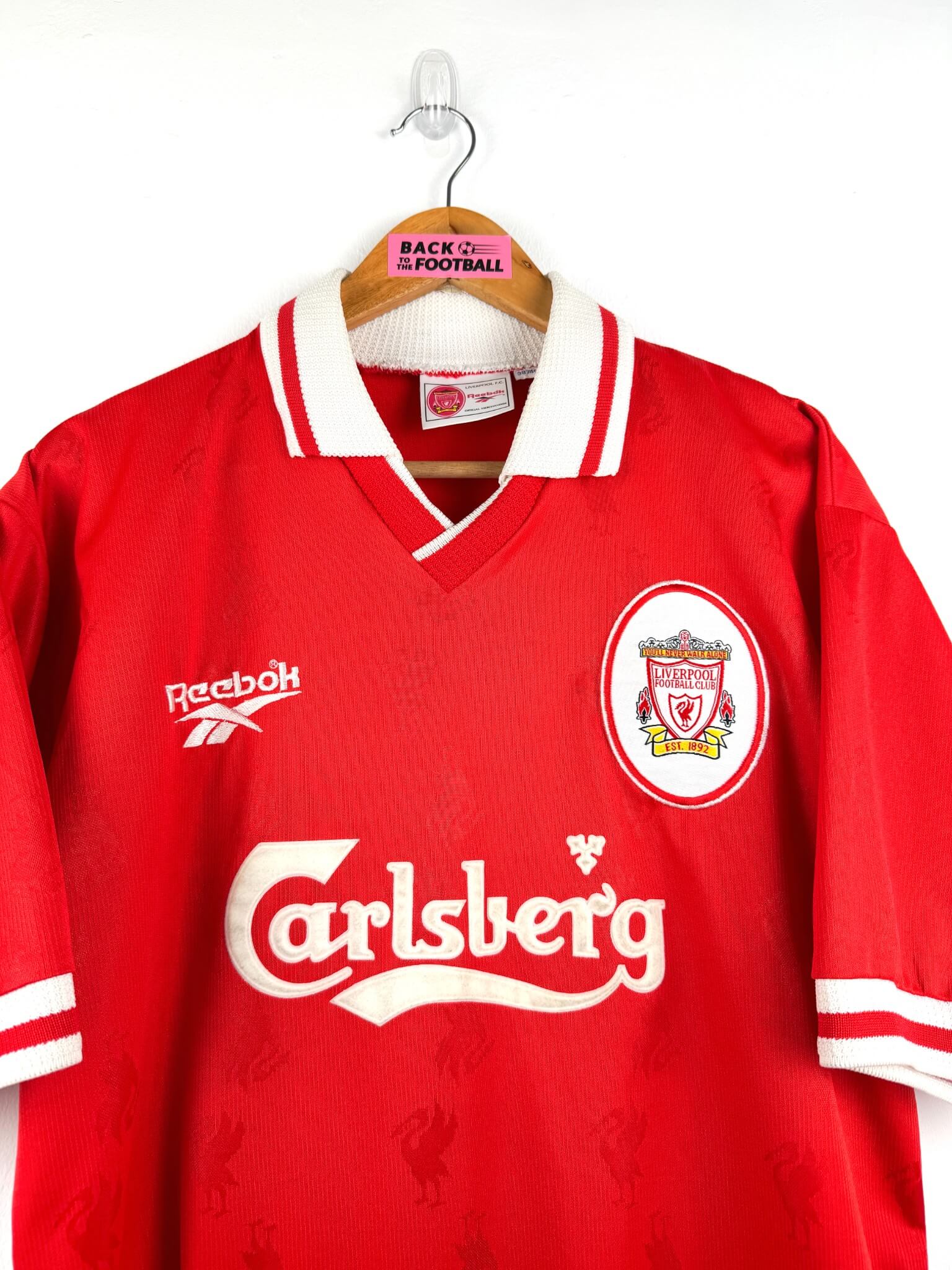 Le maillot : maillot vintage domicile de Liverpool 1996/1998. L’écusson et le logo Reebok sont brodés, le mythique sponsor Carlsberg est en feutrine. Très beau maillot rétro de Liverpool !