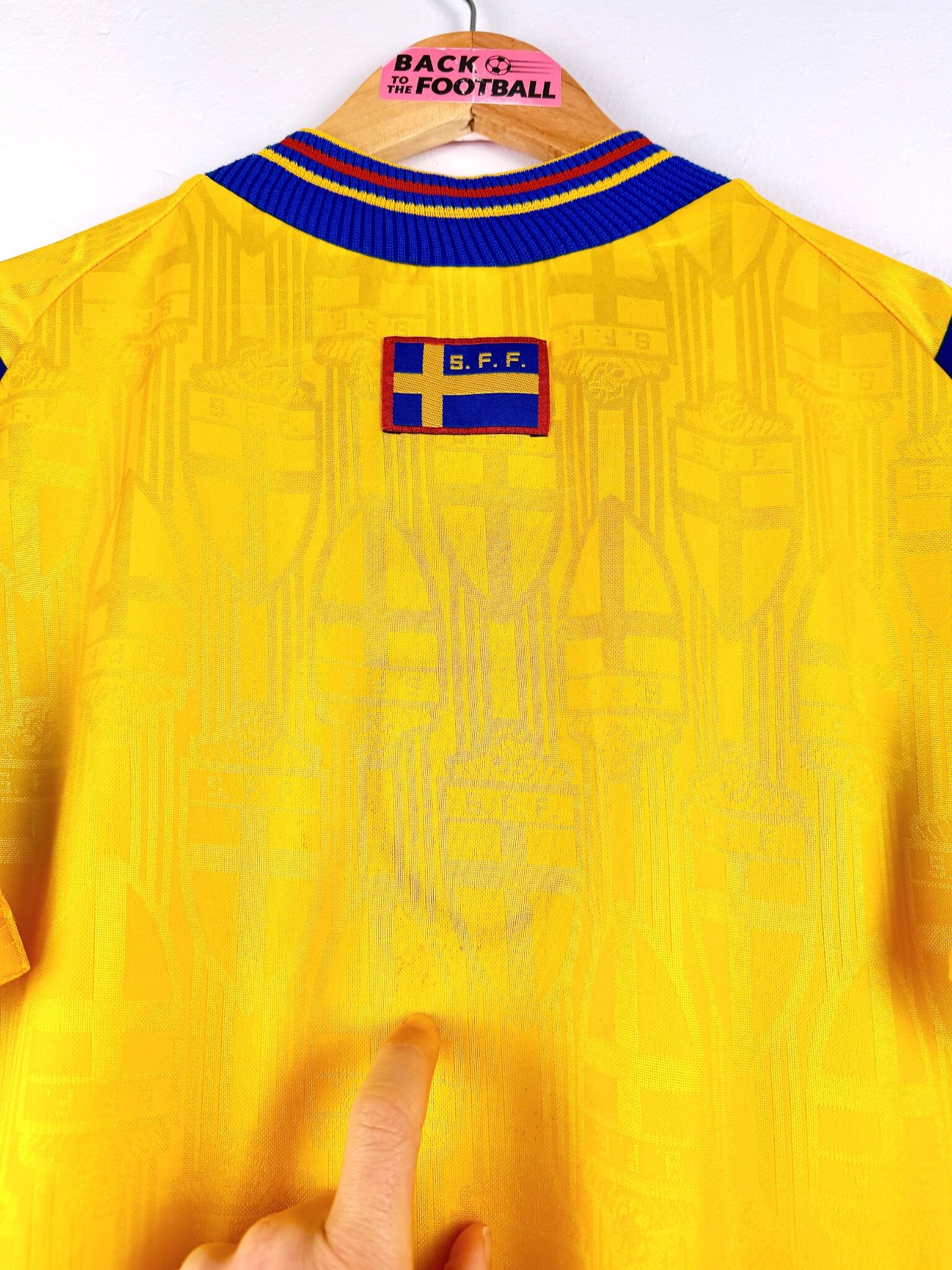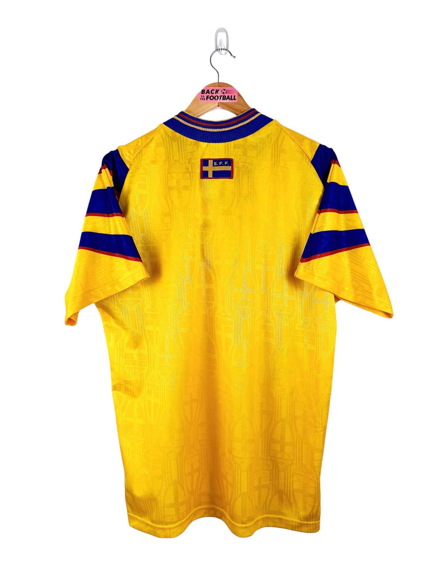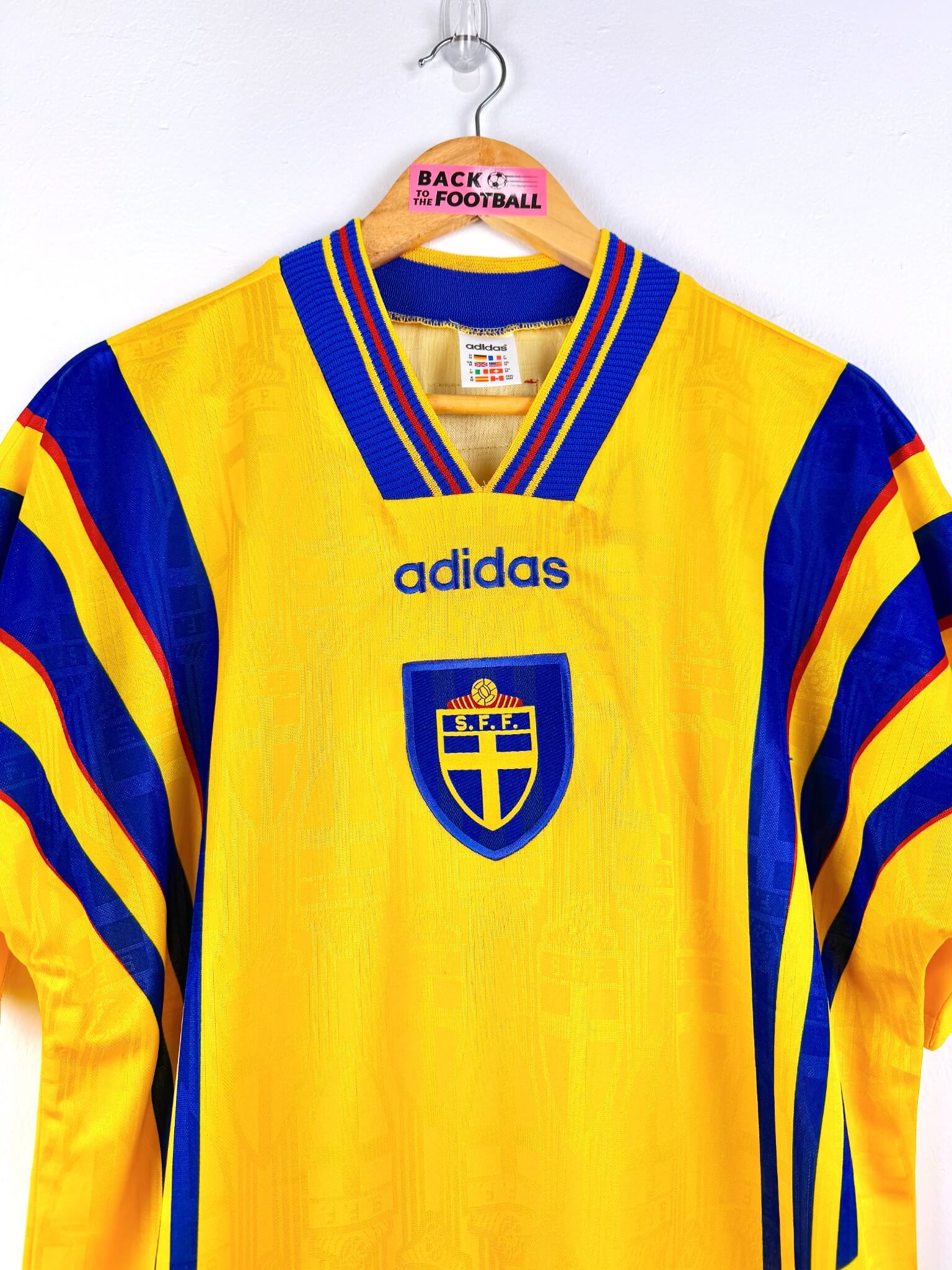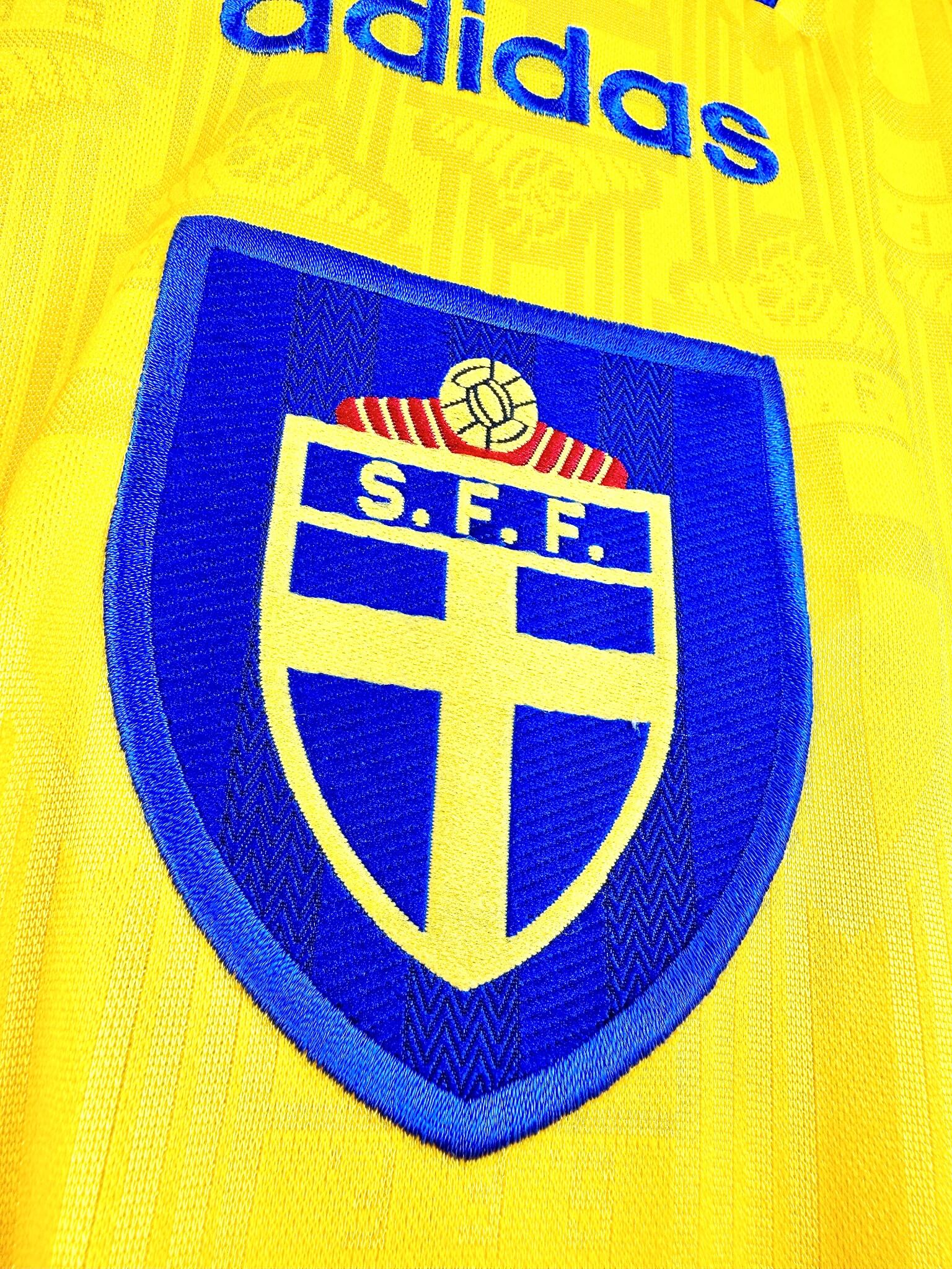 Le maillot : maillot vintage domicile de la Suède 1996. L’écusson et le logo Adidas sont brodés. On peut voir l’écusson en tramé sur tout le maillot. Très beau maillot rétro de la Suède !
