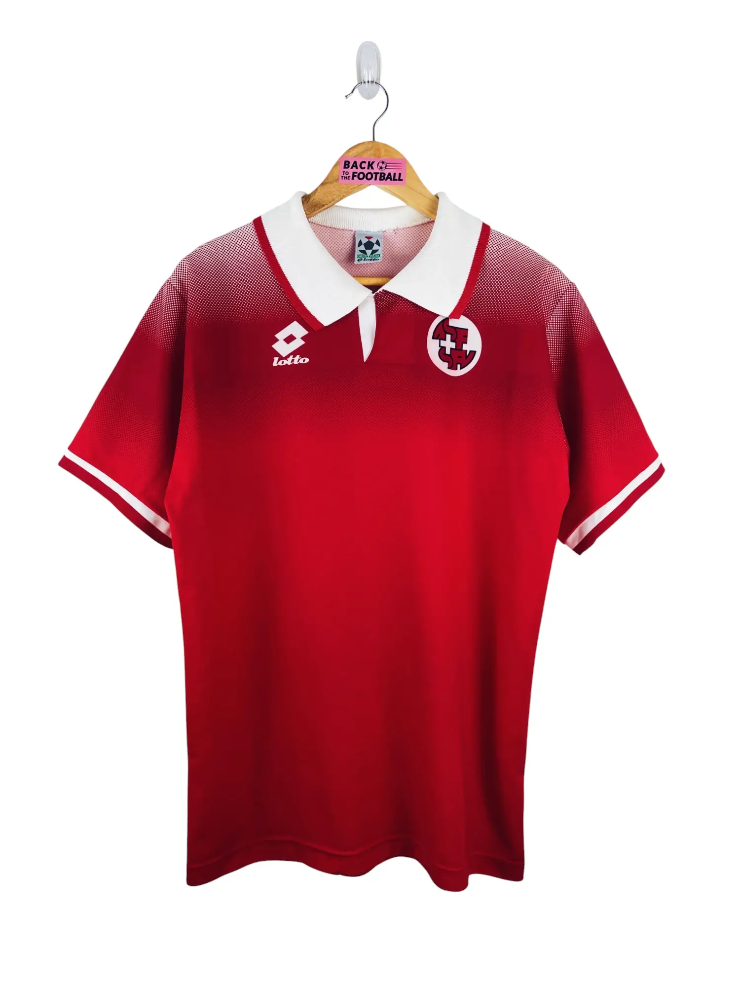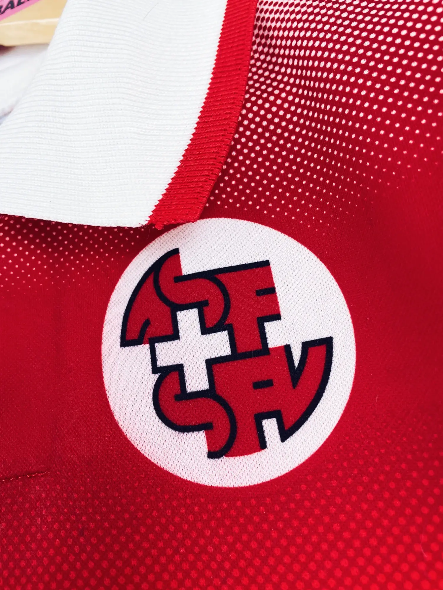 Le maillot : maillot vintage domicile de la Suisse 1996. L’écusson et le logo Lotto sont incrustés. Très beau maillot rétro de la Suisse !