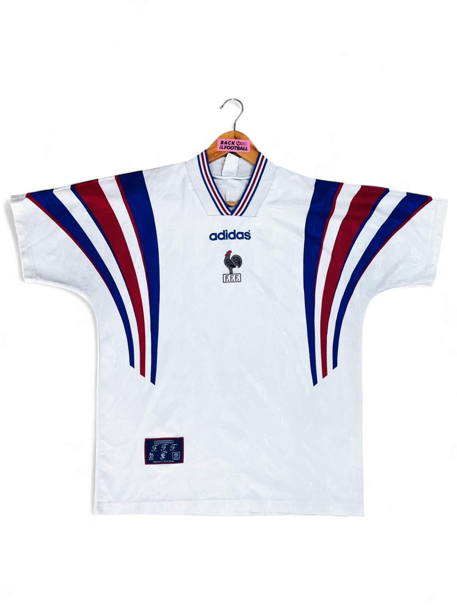 Le maillot : maillot vintage extérieur de l’équipe de France 1996. Le coq sans les étoiles est brodé, le logo Adidas aussi. On peut voir l’écusson des bleus en tramé sur tout le maillot. Très beau maillot rétro de l’équipe de France !