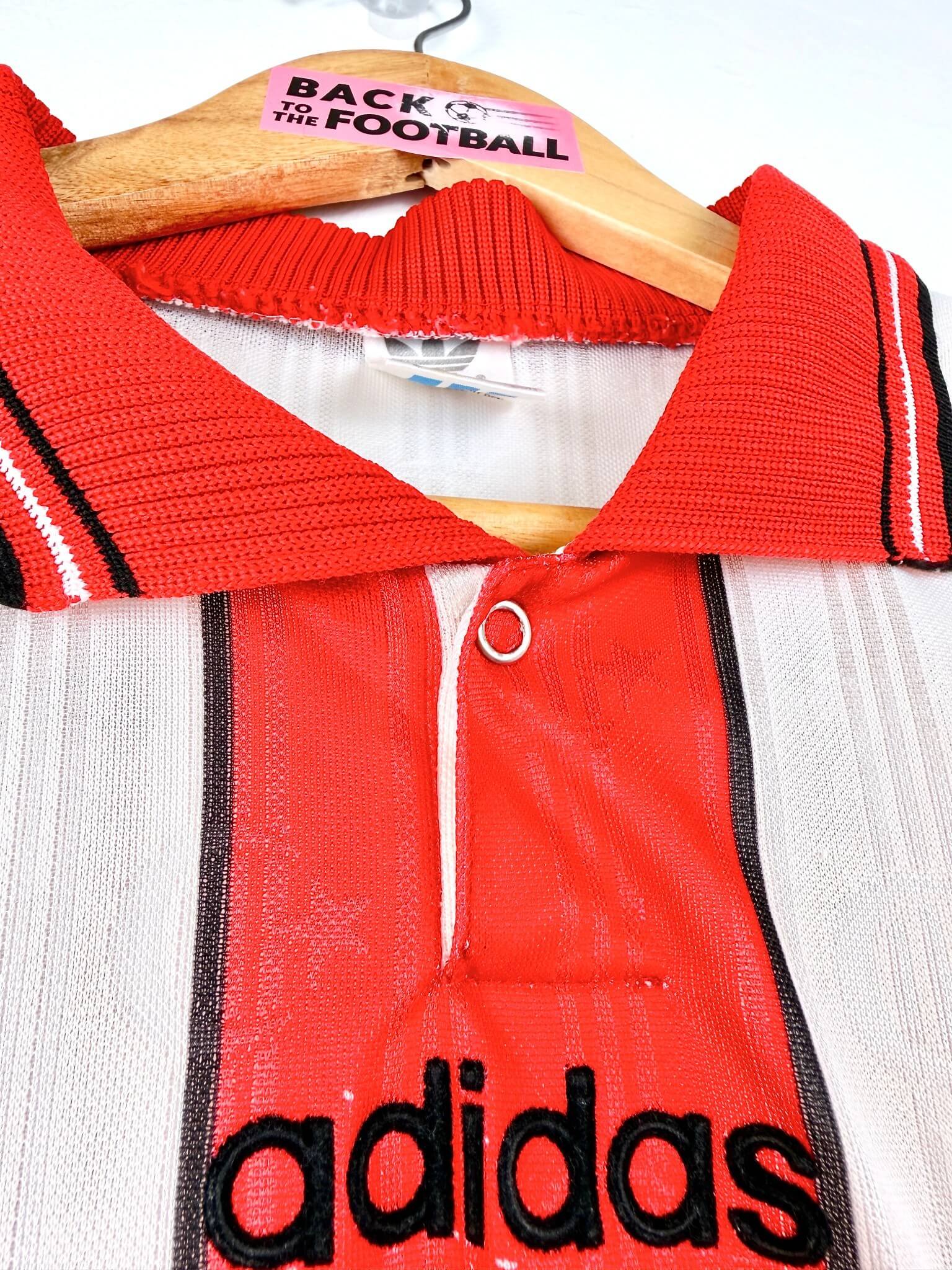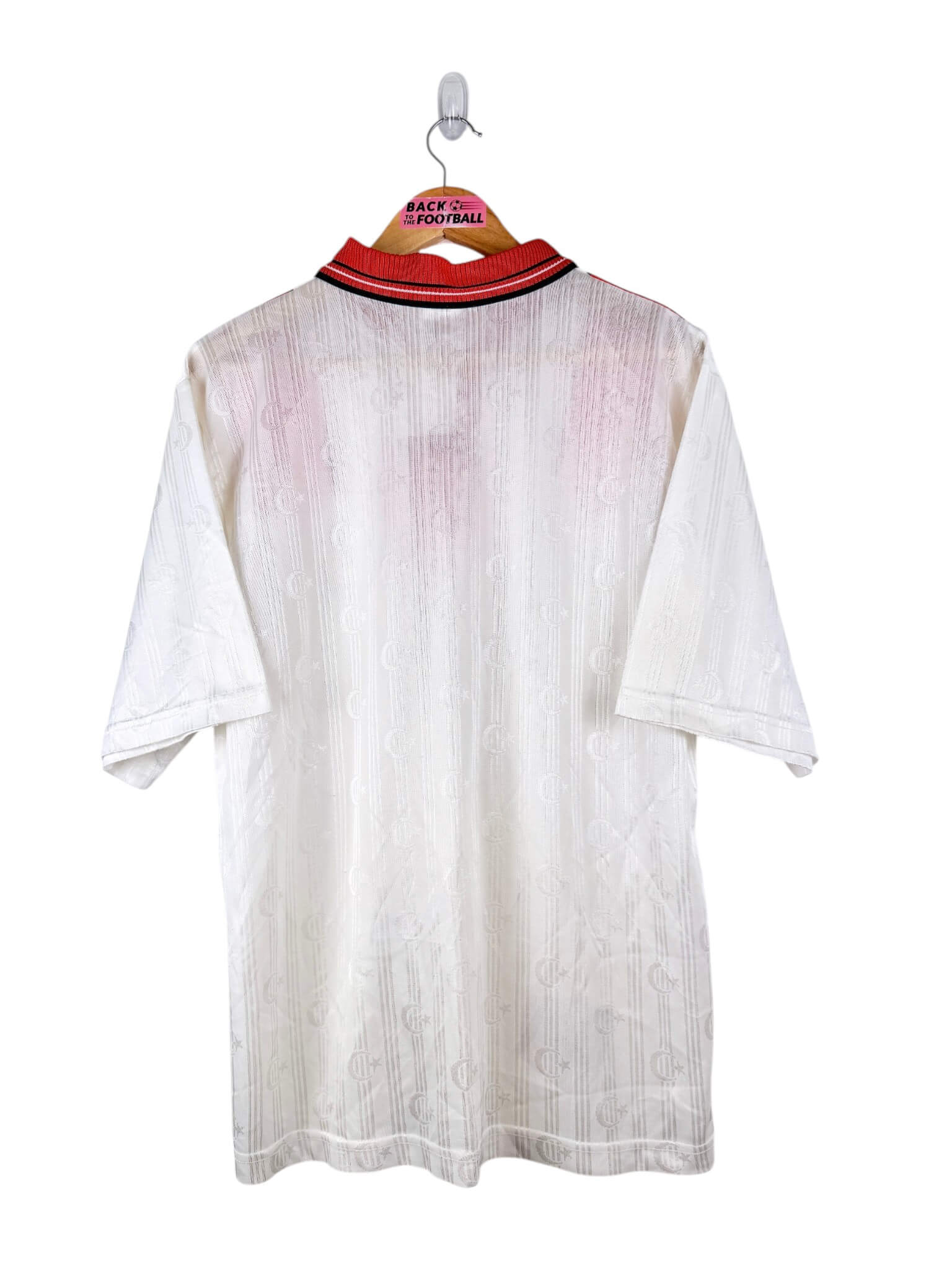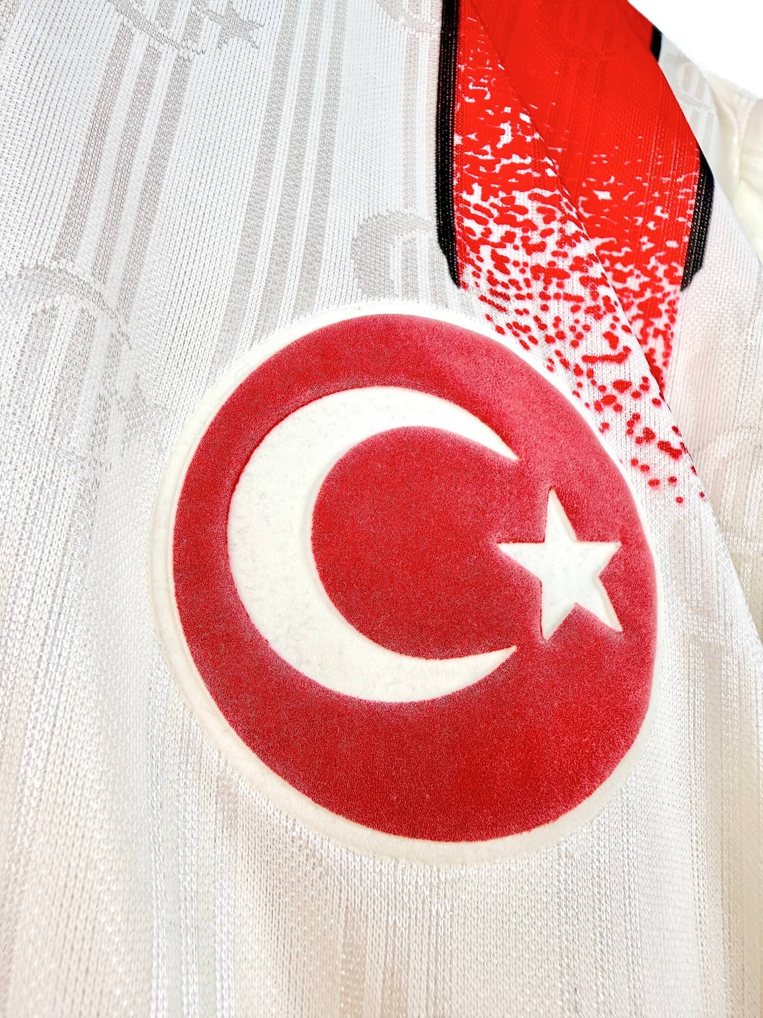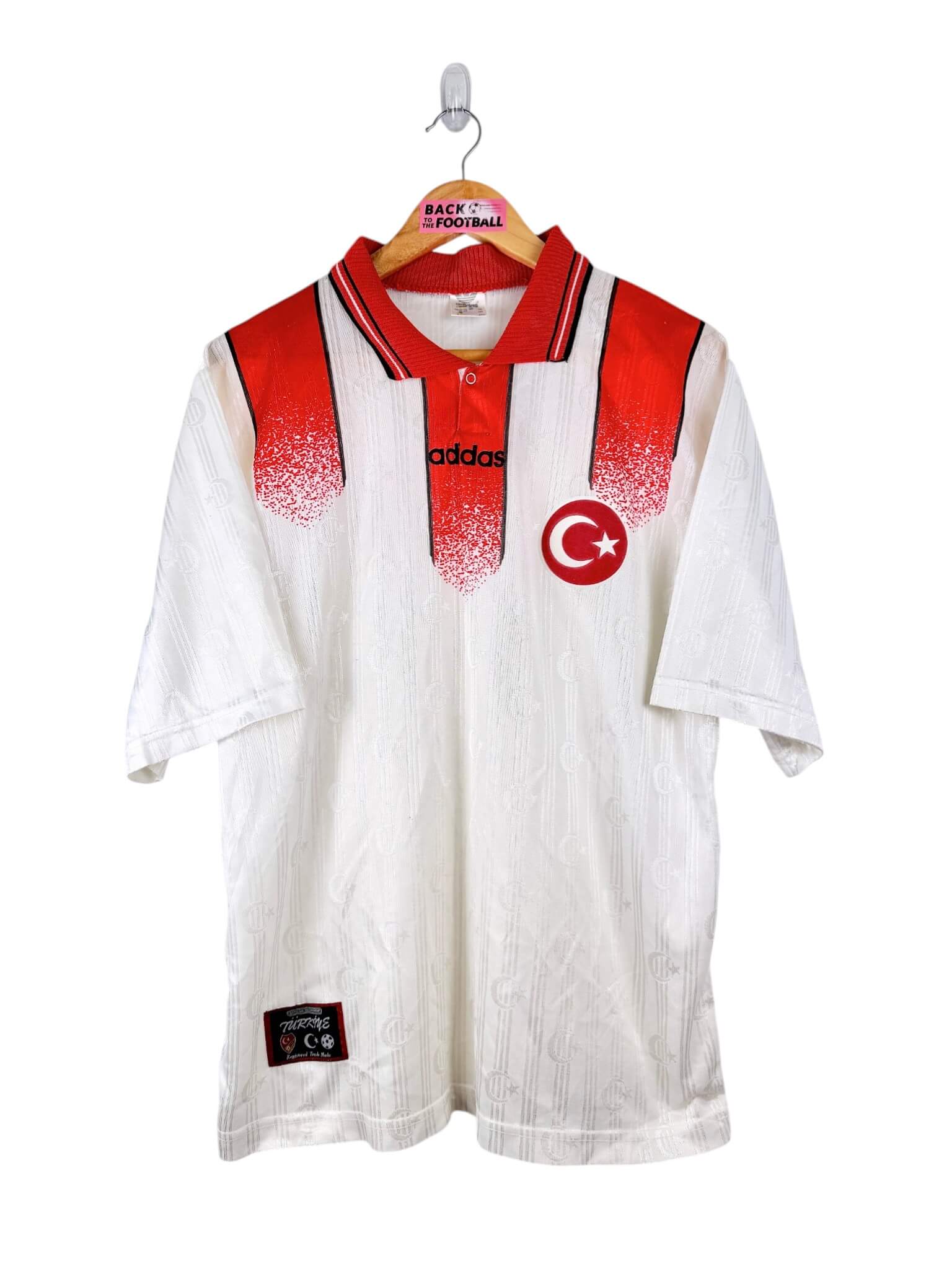 Le maillot : maillot vintage extérieur de la Turquie 1996. L’écusson et le logo Adidas sont brodés. On peut voir l’écusson de la Turquie en tramé sur tout le maillot. Très beau maillot rétro de la Turquie !