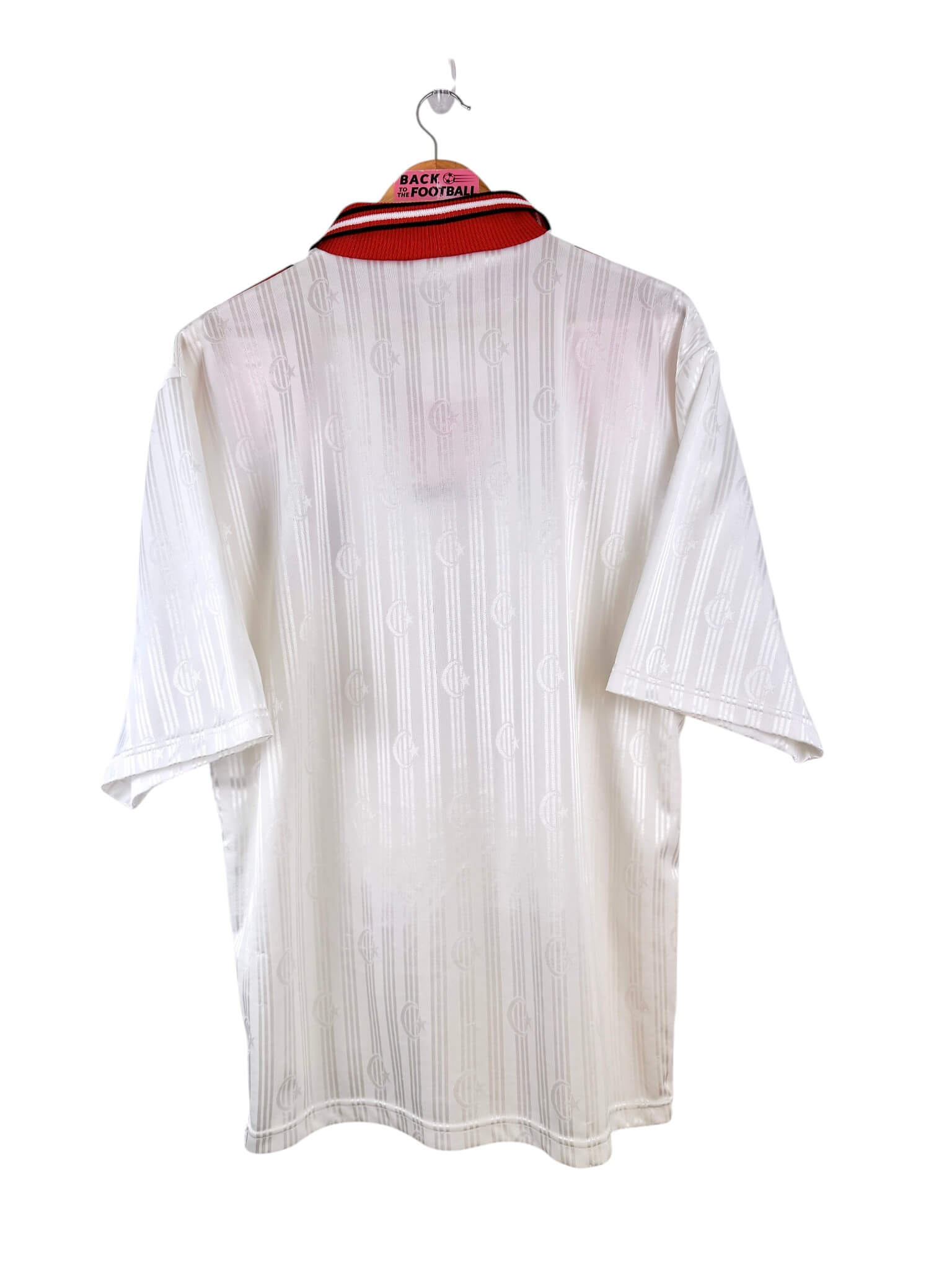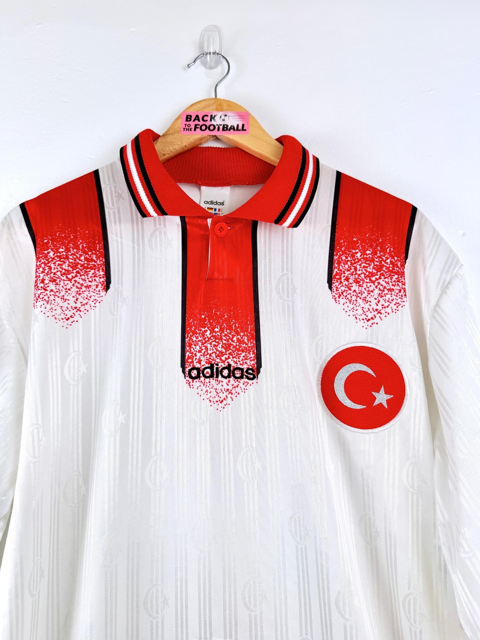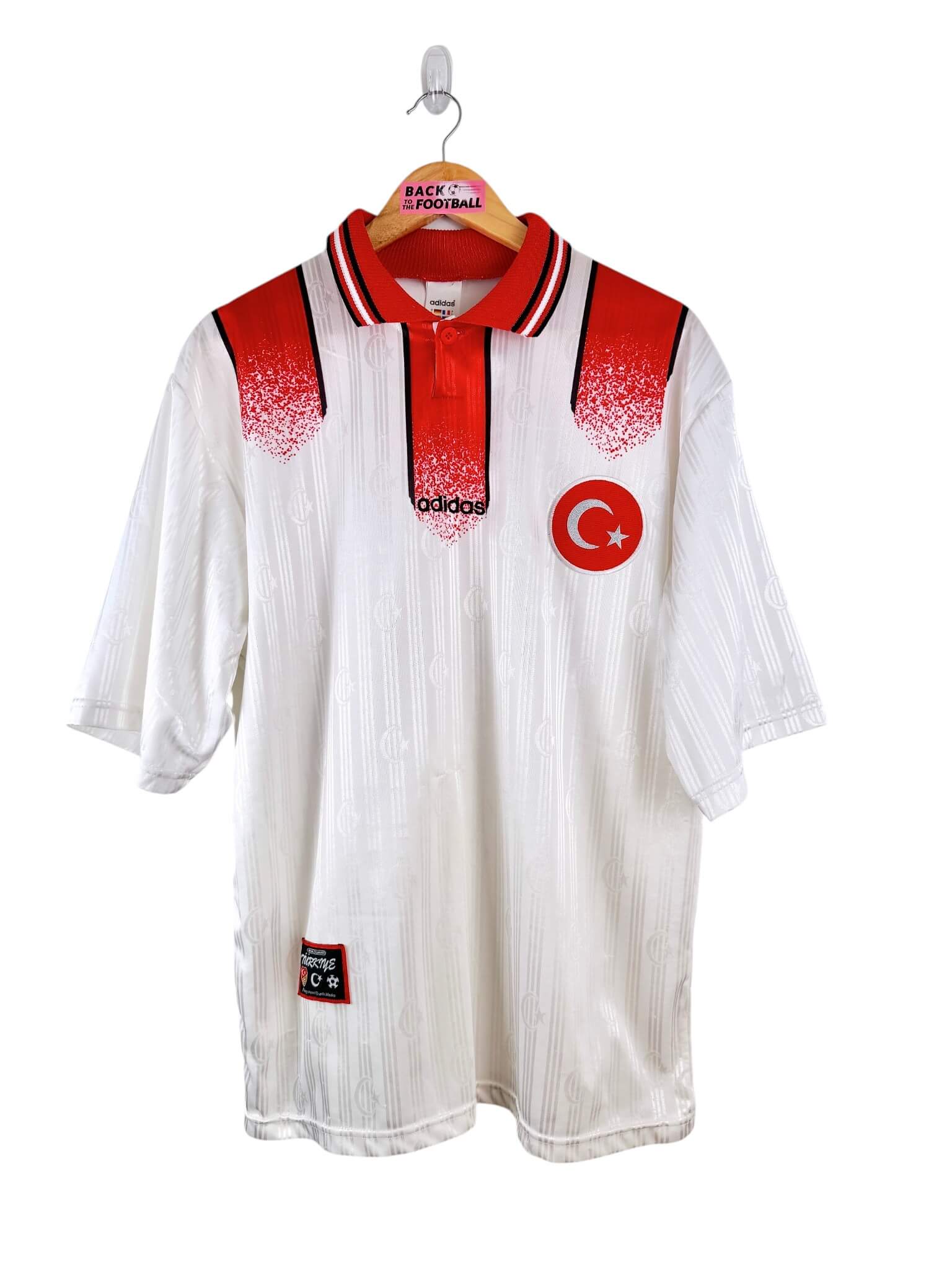 Le maillot : maillot vintage extérieur de la Turquie 1996. L’écusson et le logo Adidas sont brodés. On peut voir l’écusson de la Turquie en tramé sur tout le maillot. Très beau maillot rétro de la Turquie !