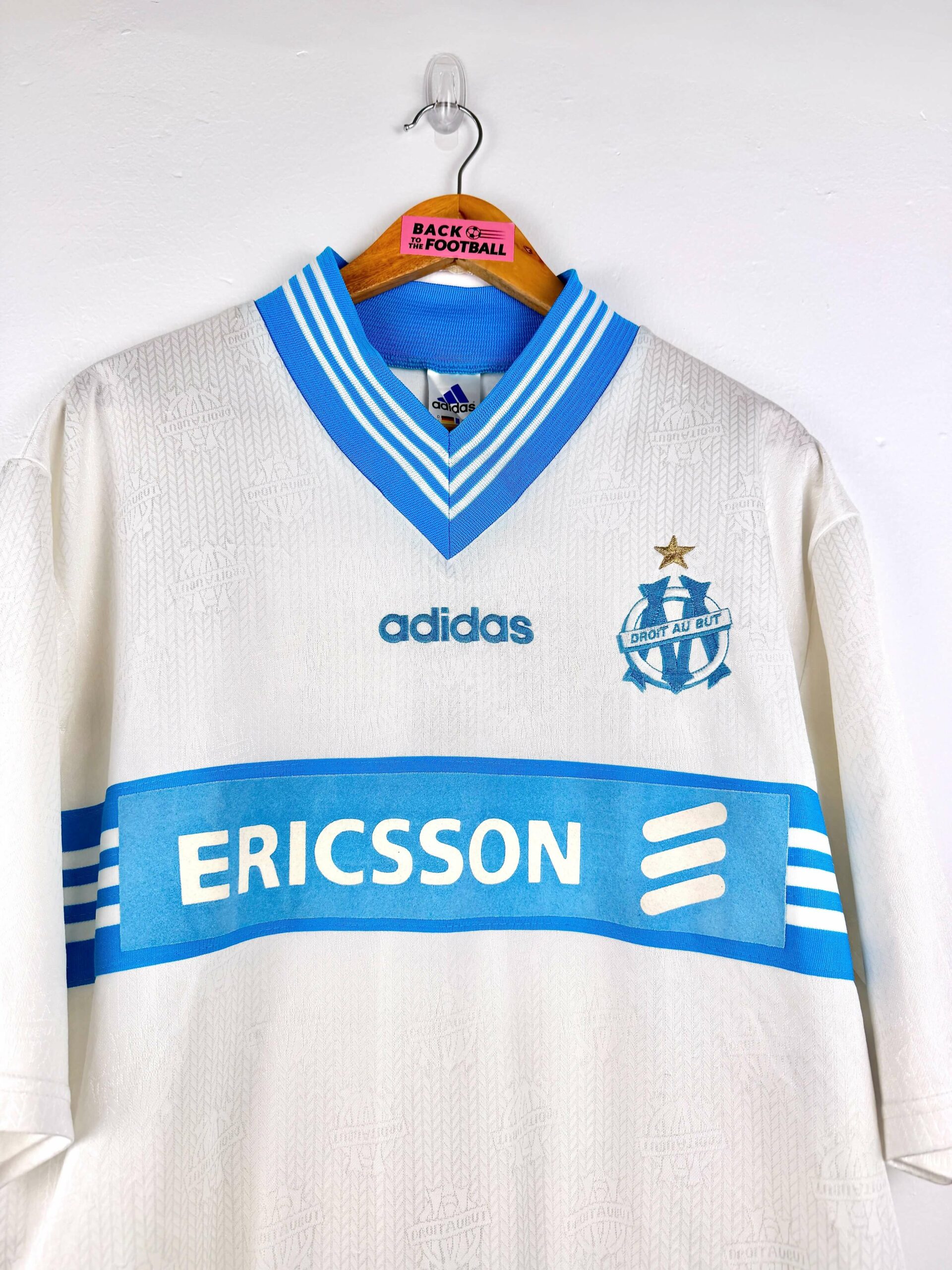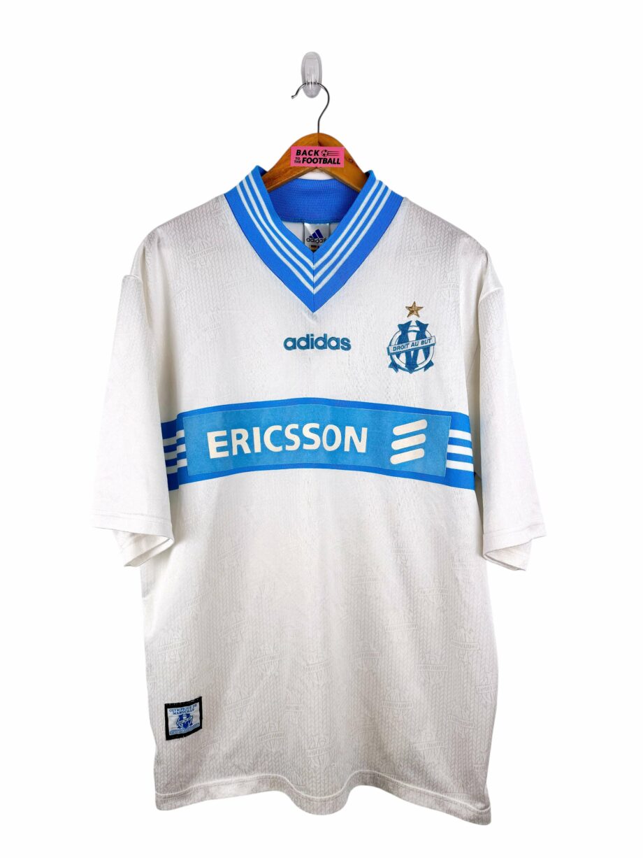 Le maillot : maillot vintage domicile de l’OM 1997/1998. L’écusson et le logo Adidas sont brodés, le sponsor Ericsson est en feutrine. Très beau maillot rétro de l’Olympique de Marseille !