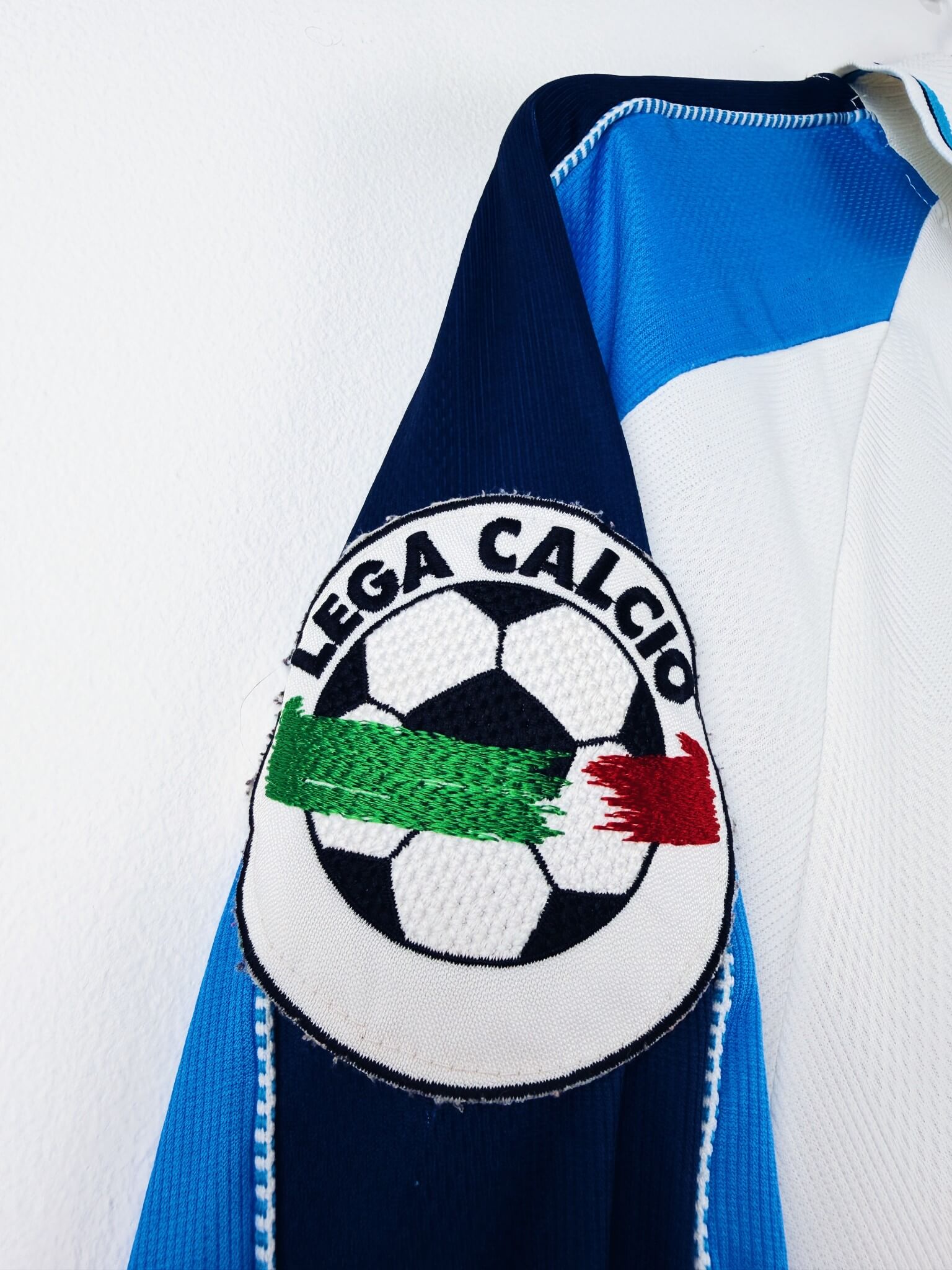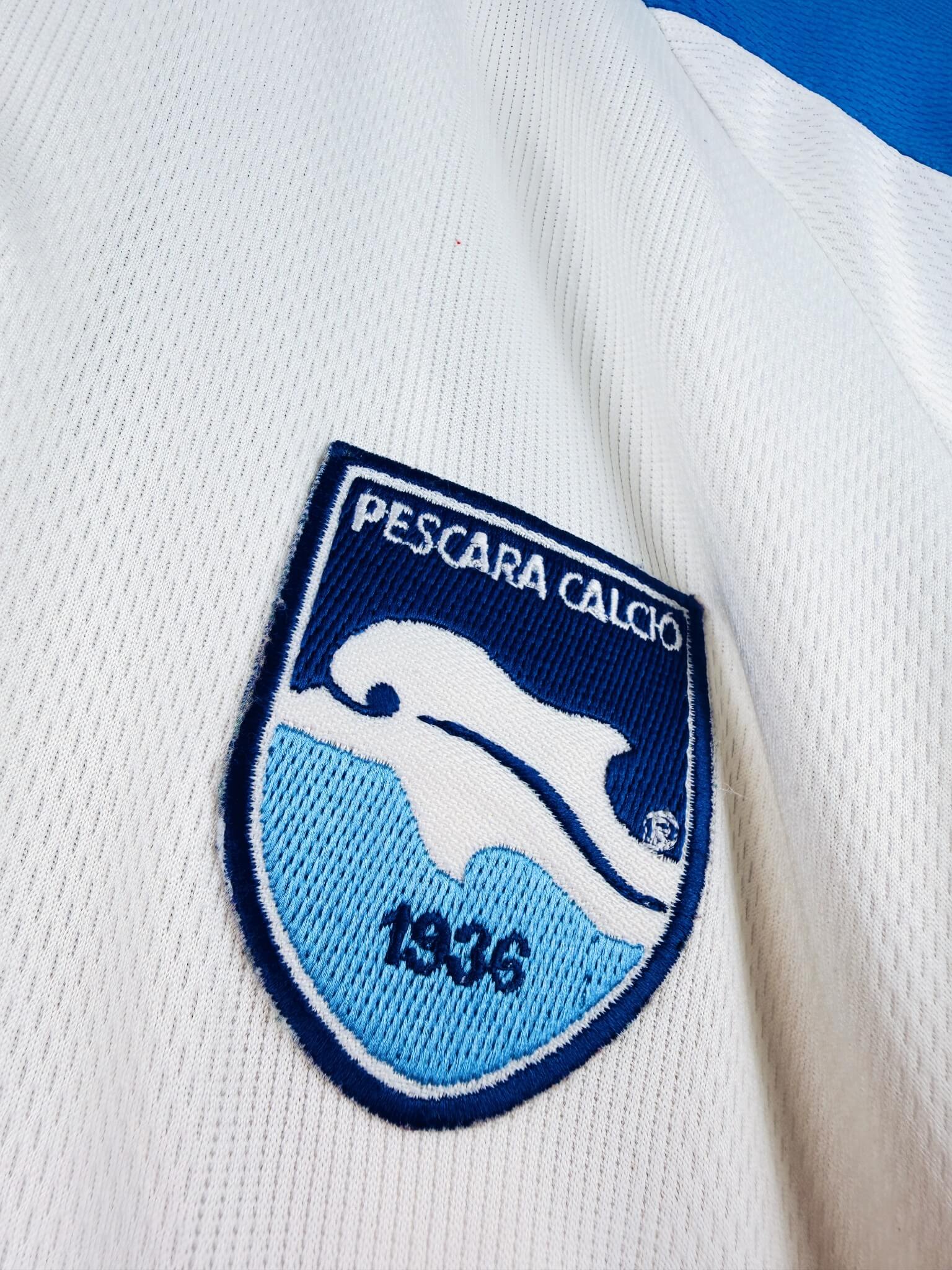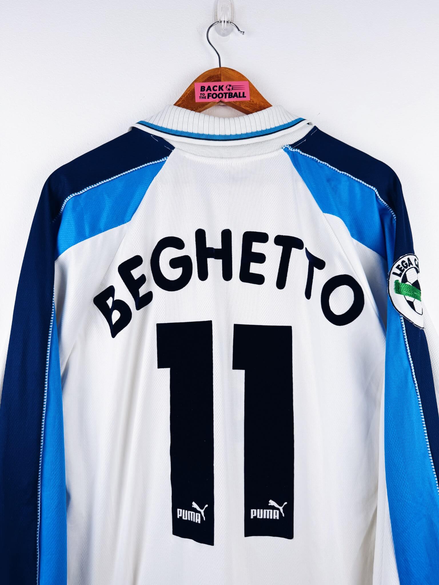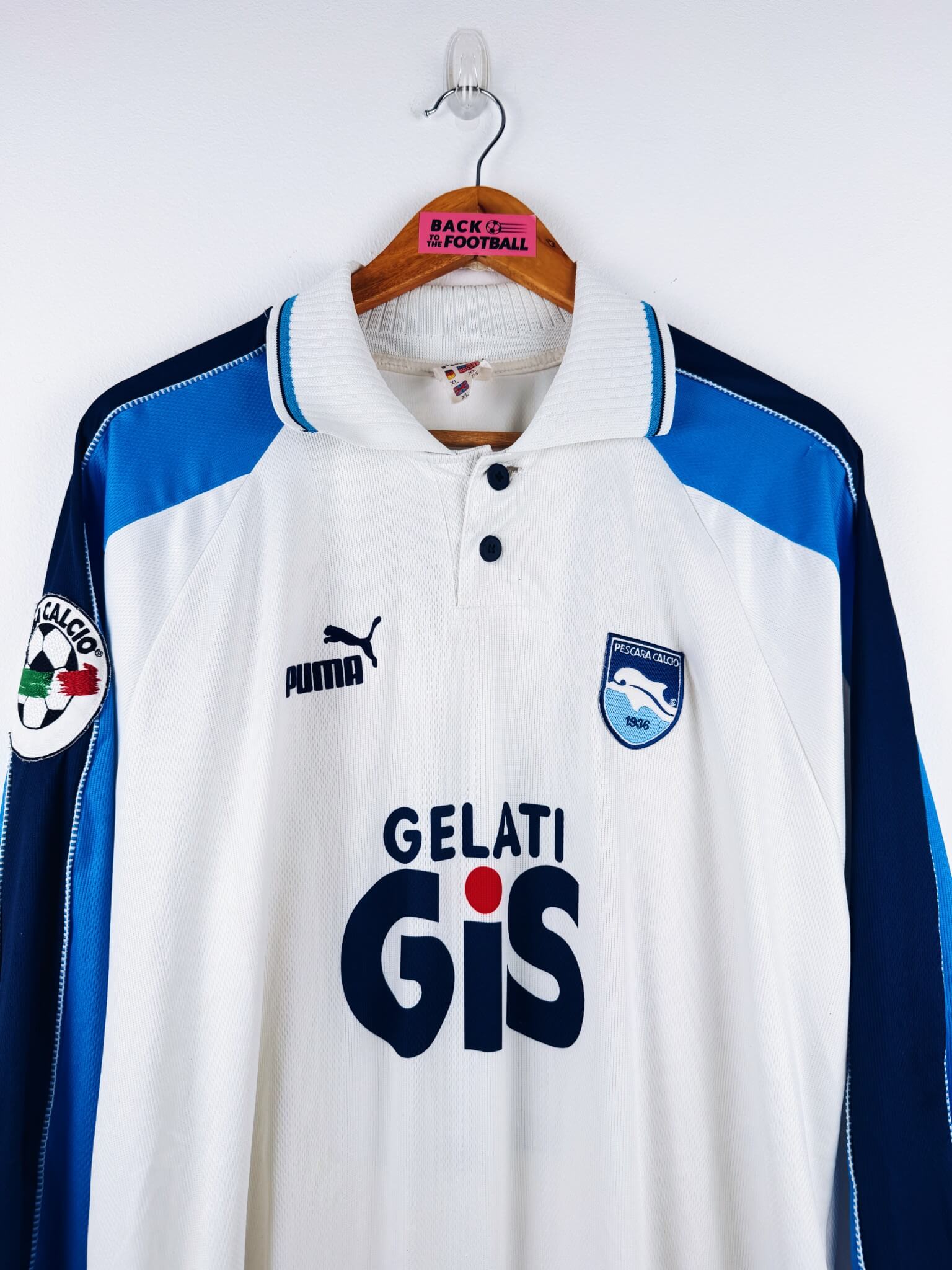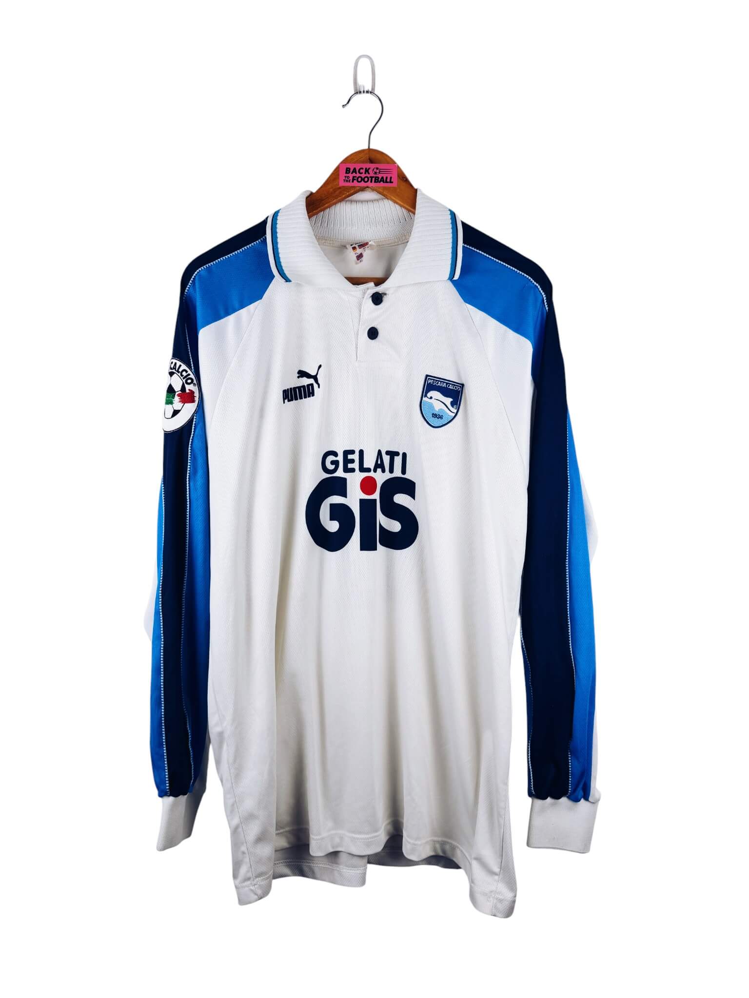 Le maillot : maillot vintage domicile de Pescara 1997/1998 porté (match worn) ou préparé (match issue) pour Beghetto #11 : manches longues, patch Lega Calcio, flocage Puma en feutrine officiel. L’écusson est brodé, le logo Puma et le sponsor Gelati GIS sont en feutrine. Très beau maillot rétro de Pescara !