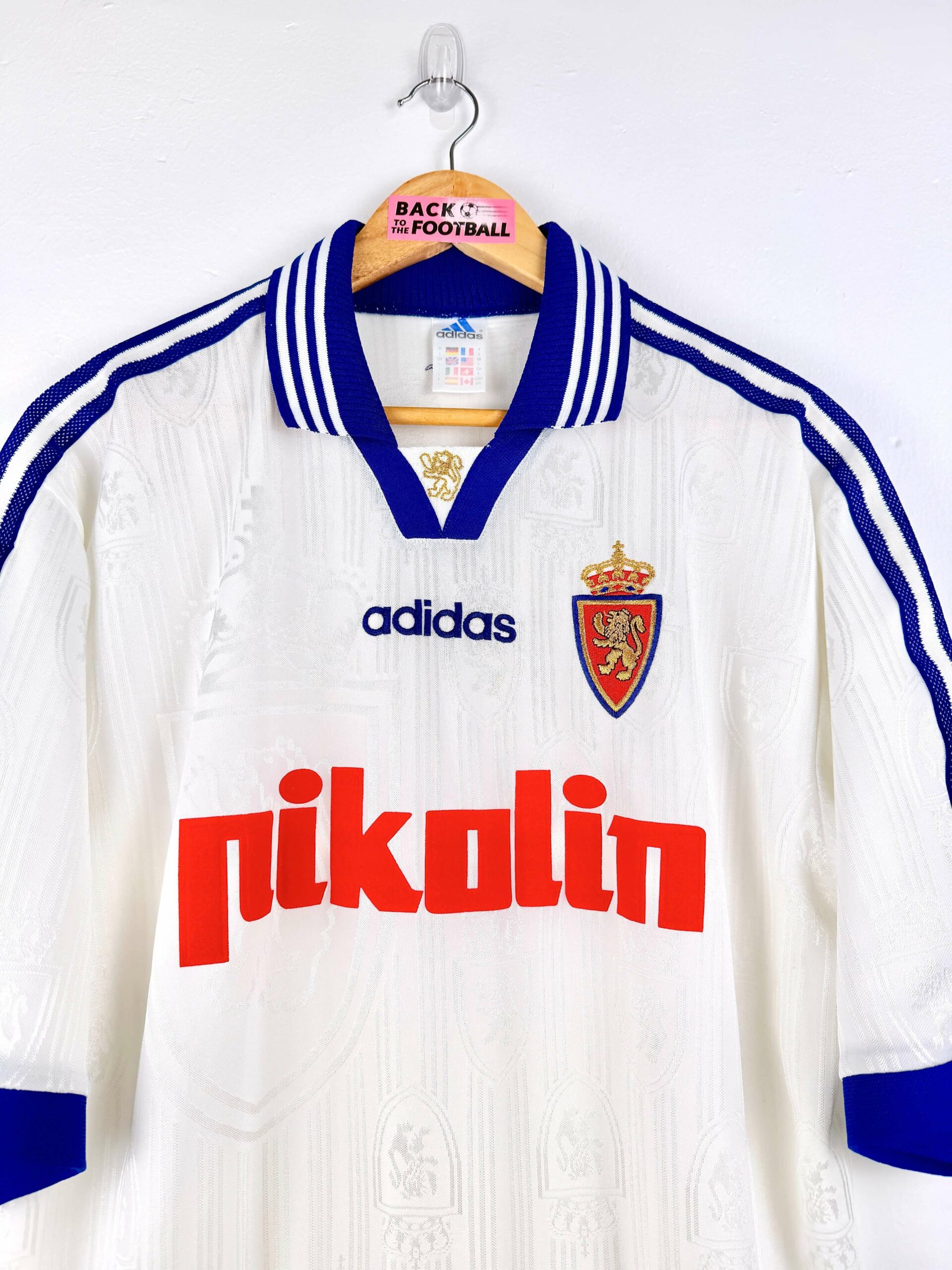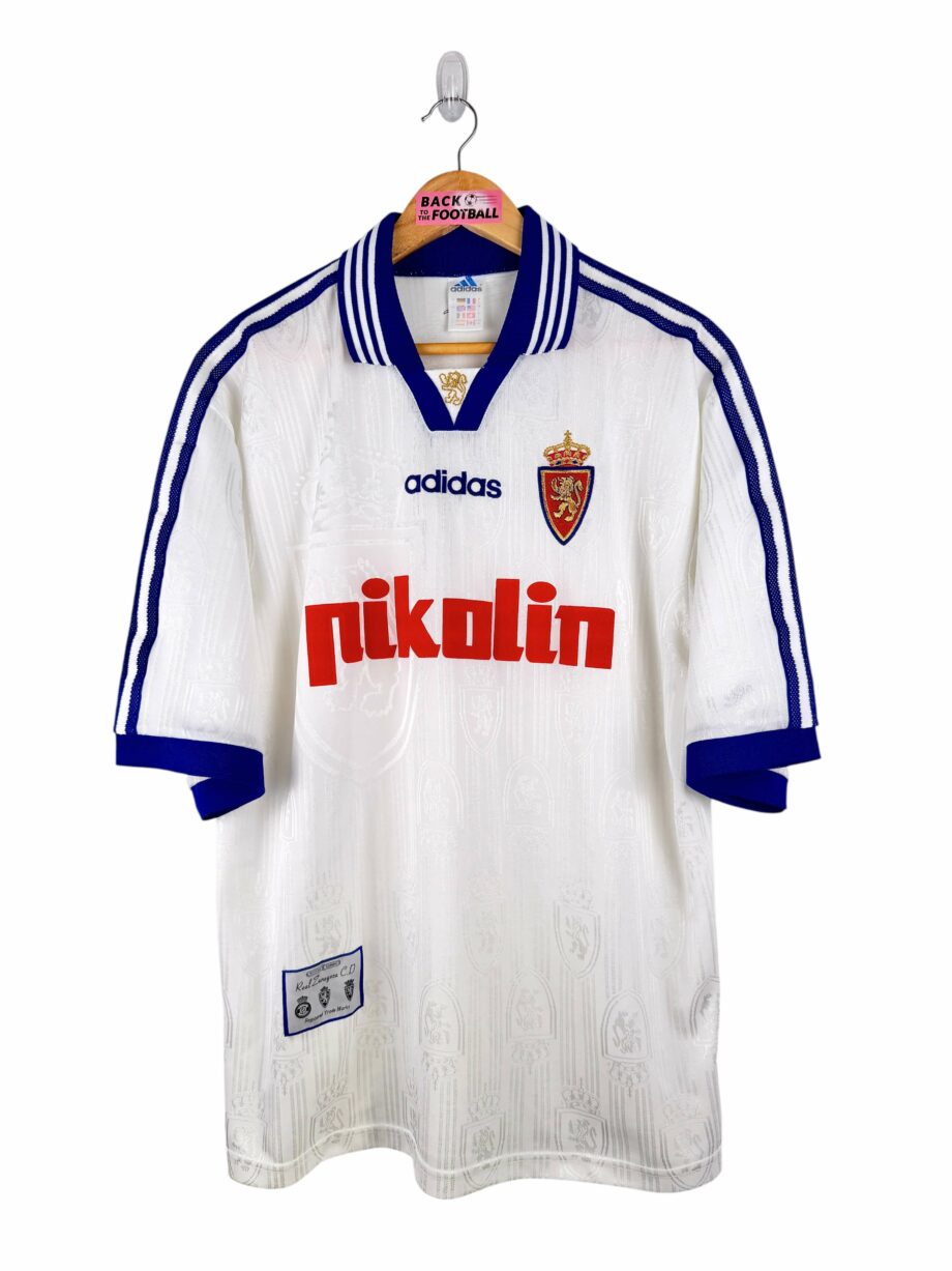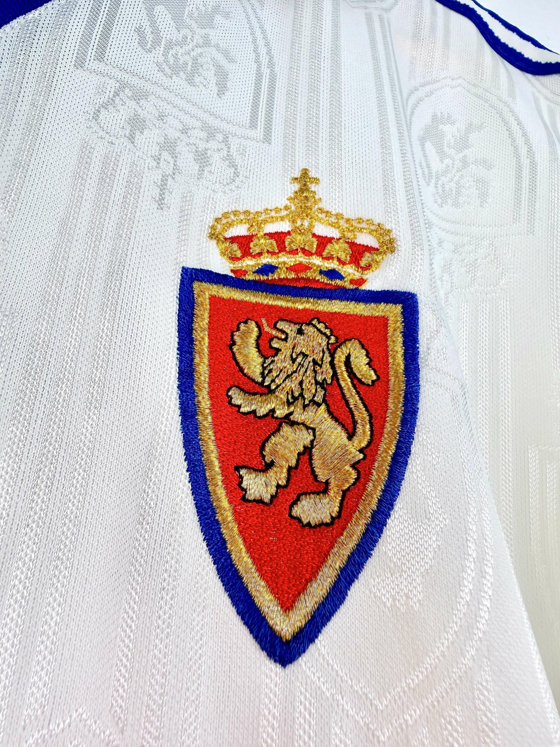 Le maillot : maillot vintage domicile du Real Zaragoza 1997/1999. L’écusson et le logo Adidas sont brodés, le sponsor Pikolin est en feutrine. On peut voir l’écusson en tramé. Très beau maillot rétro du Real Zaragoza !