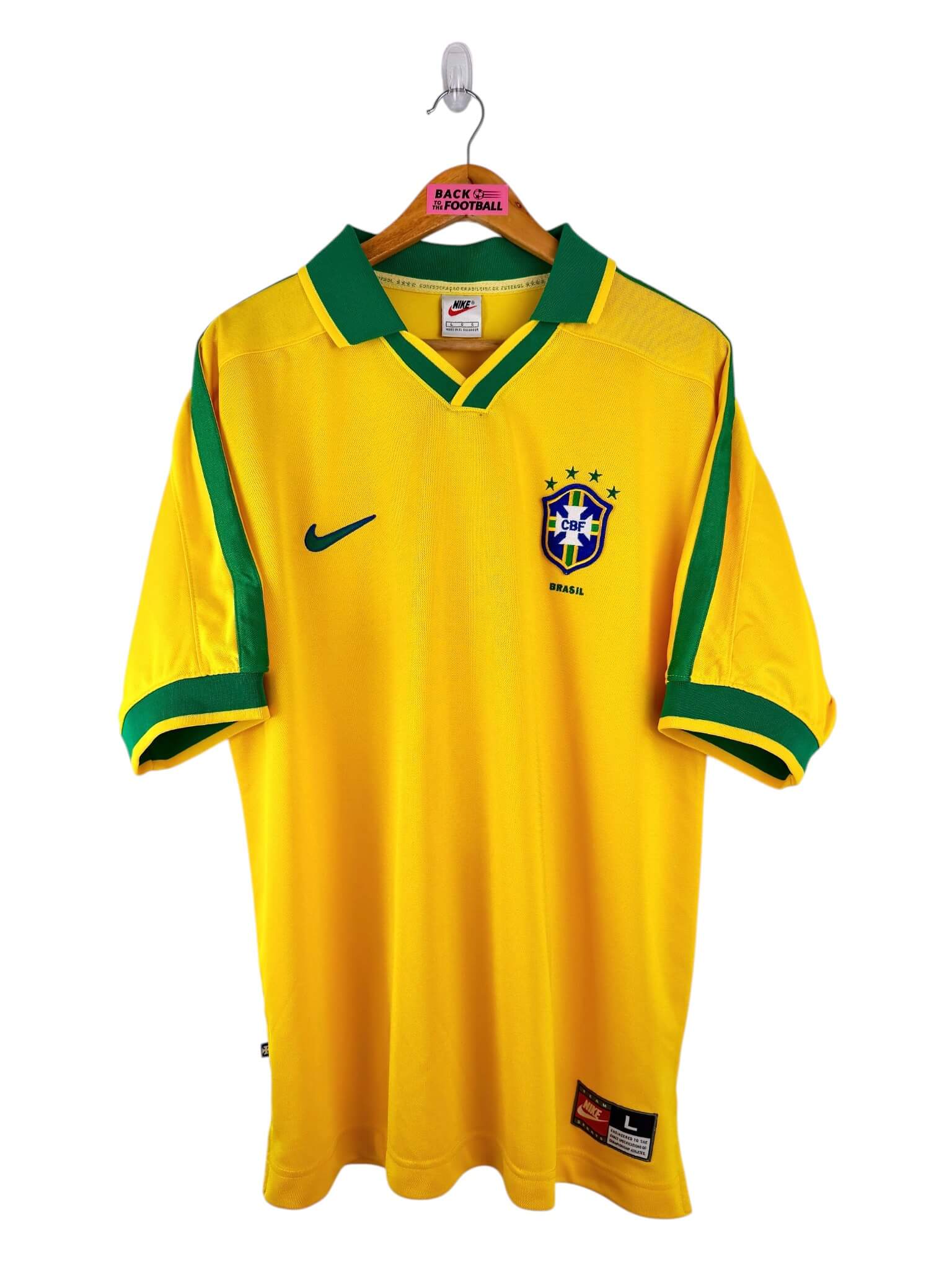 Histoire : la Seleçao portera ce maillot lors de la Copa America et des qualifications pour le mondial 98. A la Copa America, le Brésil sort facilement de son groupe avec 3 victoires en 3 matchs. Par la suite, les brésiliens éliminent le Paraguay en quart, le Pérou en demi et enfin la Bolivie, hôte du tournoi, en finale. Ronaldo marquera 5 buts. QUelques joueurs : Zé Roberto, Roberto Carlos, Romario, Denilson, Leonardo, Edmundo, Cafu, Dunga…