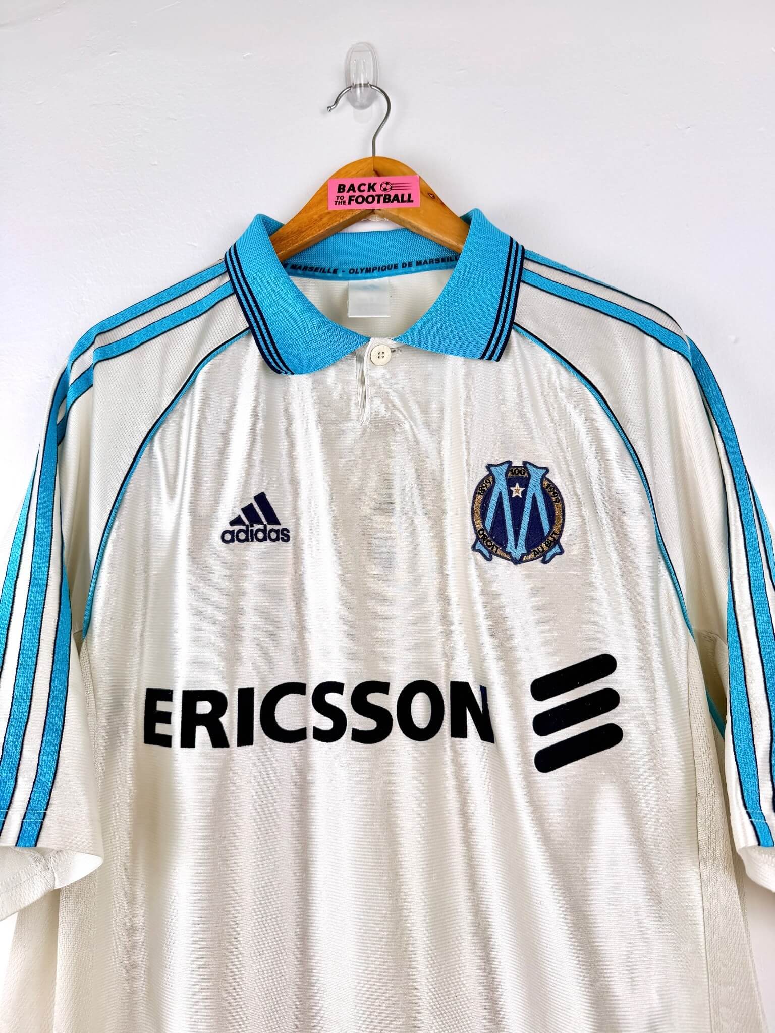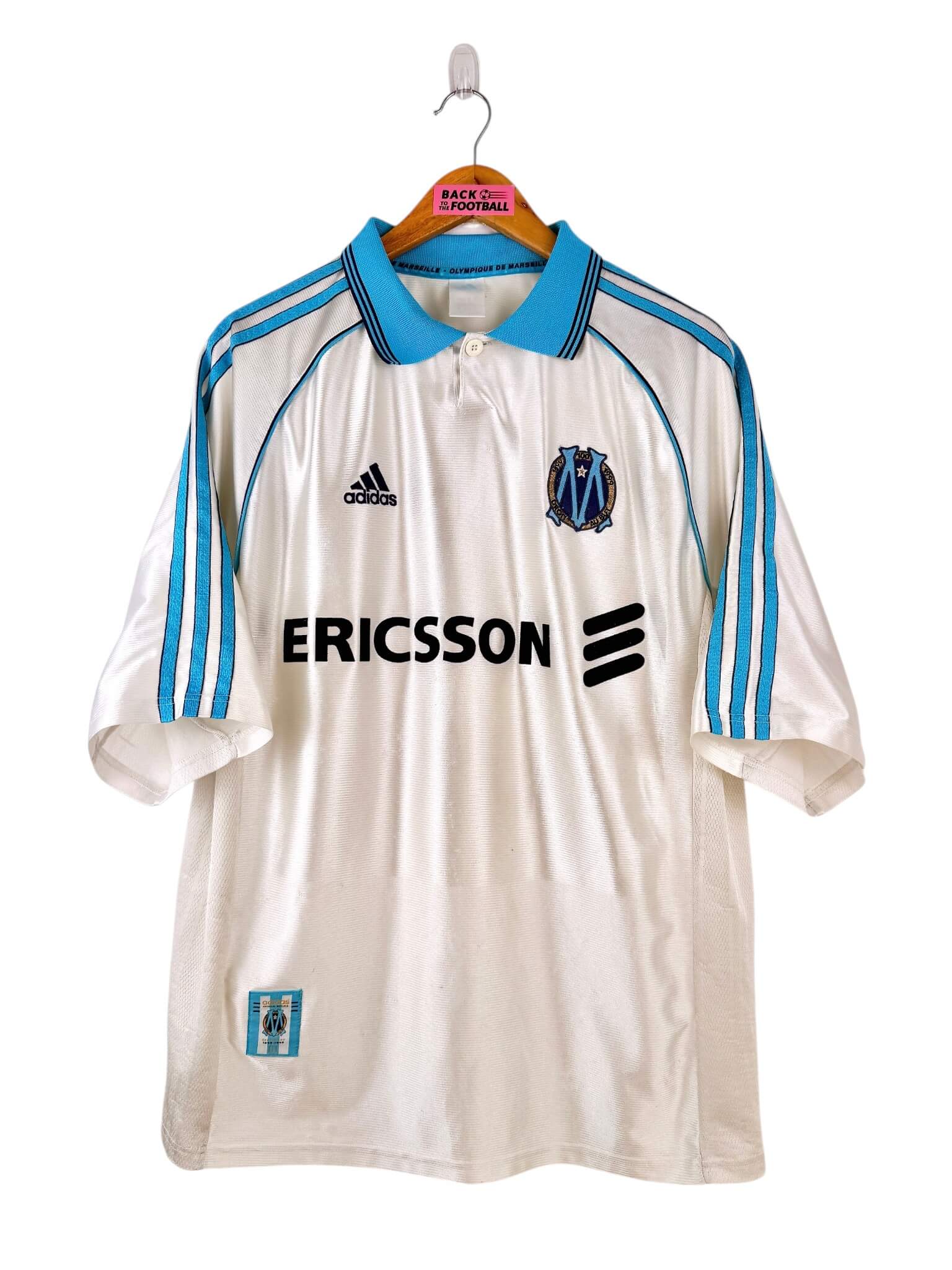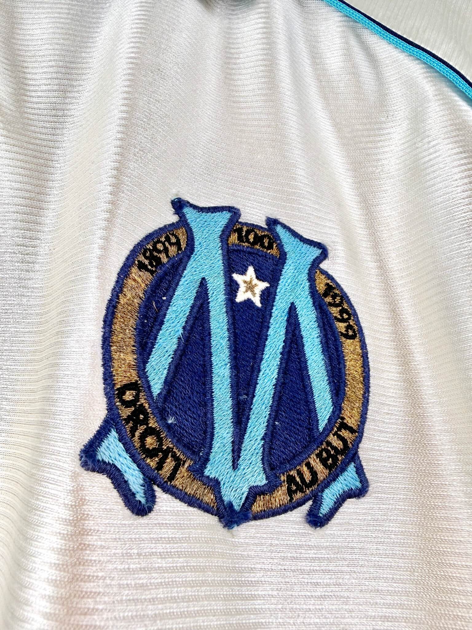 Le maillot : maillot vintage domicile de l’OM 1998/1999, pour les 100 ans du club. L’écusson spécial Centenaire et le logo Adidas sont brodés. Le sponsor Ericsson est en feutrine. Très beau maillot rétro de l’Olympique de Marseille !