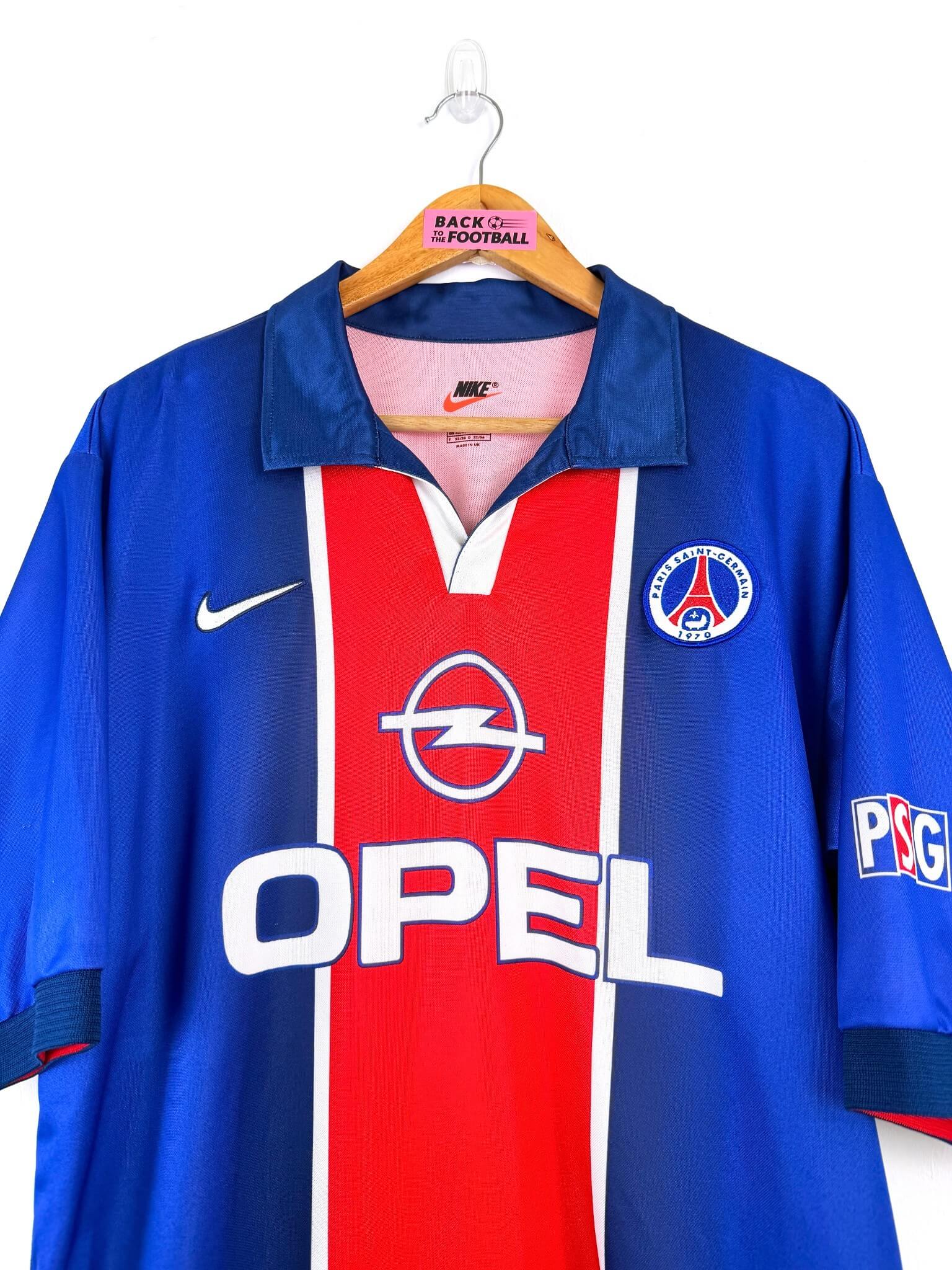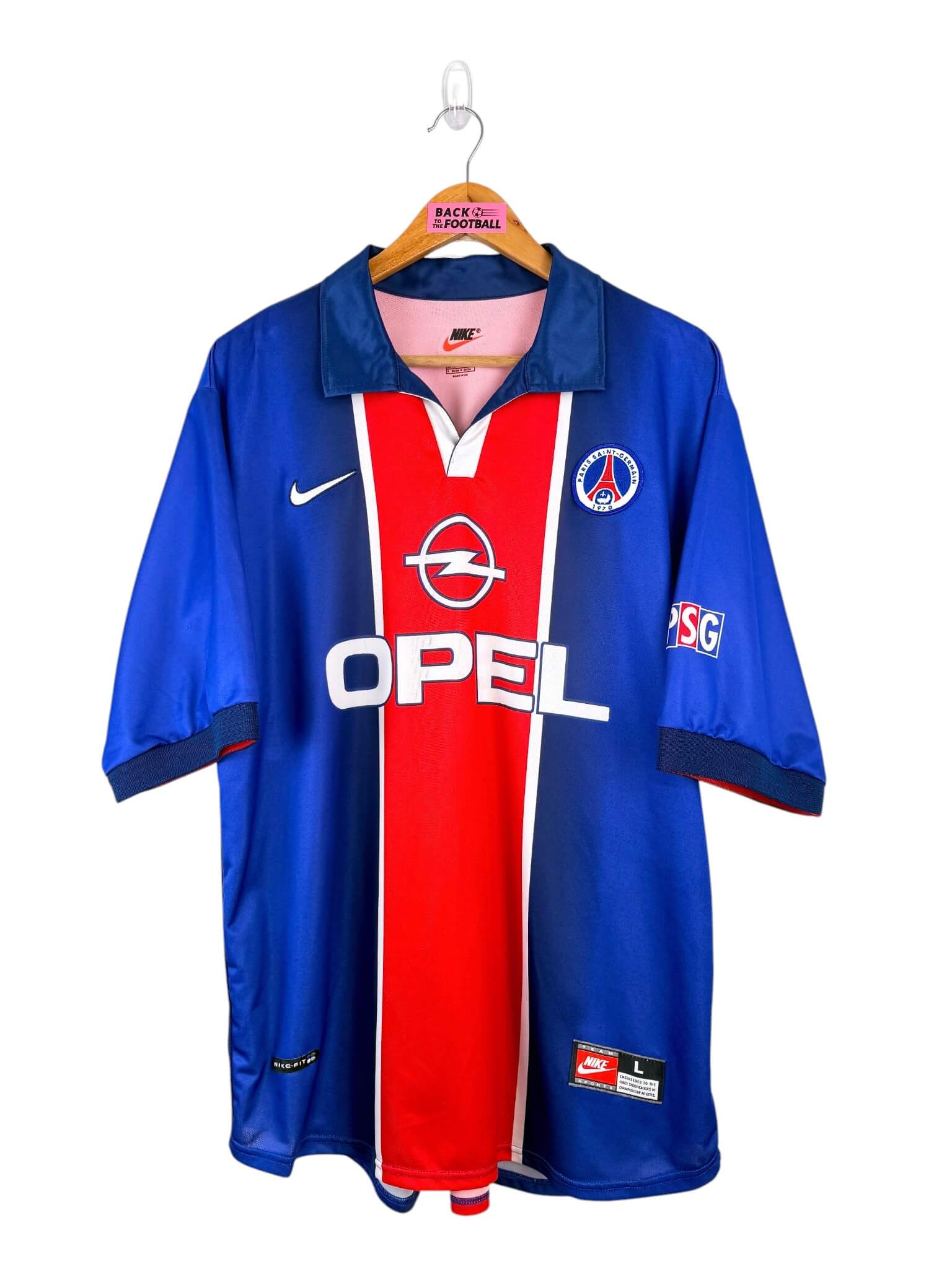 Le maillot : maillot vintage domicile du PSG 1998/1999. L’écusson et le logo Nike sont brodés, le sponsor Opel est incrusté. On peut voir le logo PSG sur la manche gauche également. Très beau maillot rétro du PSG !