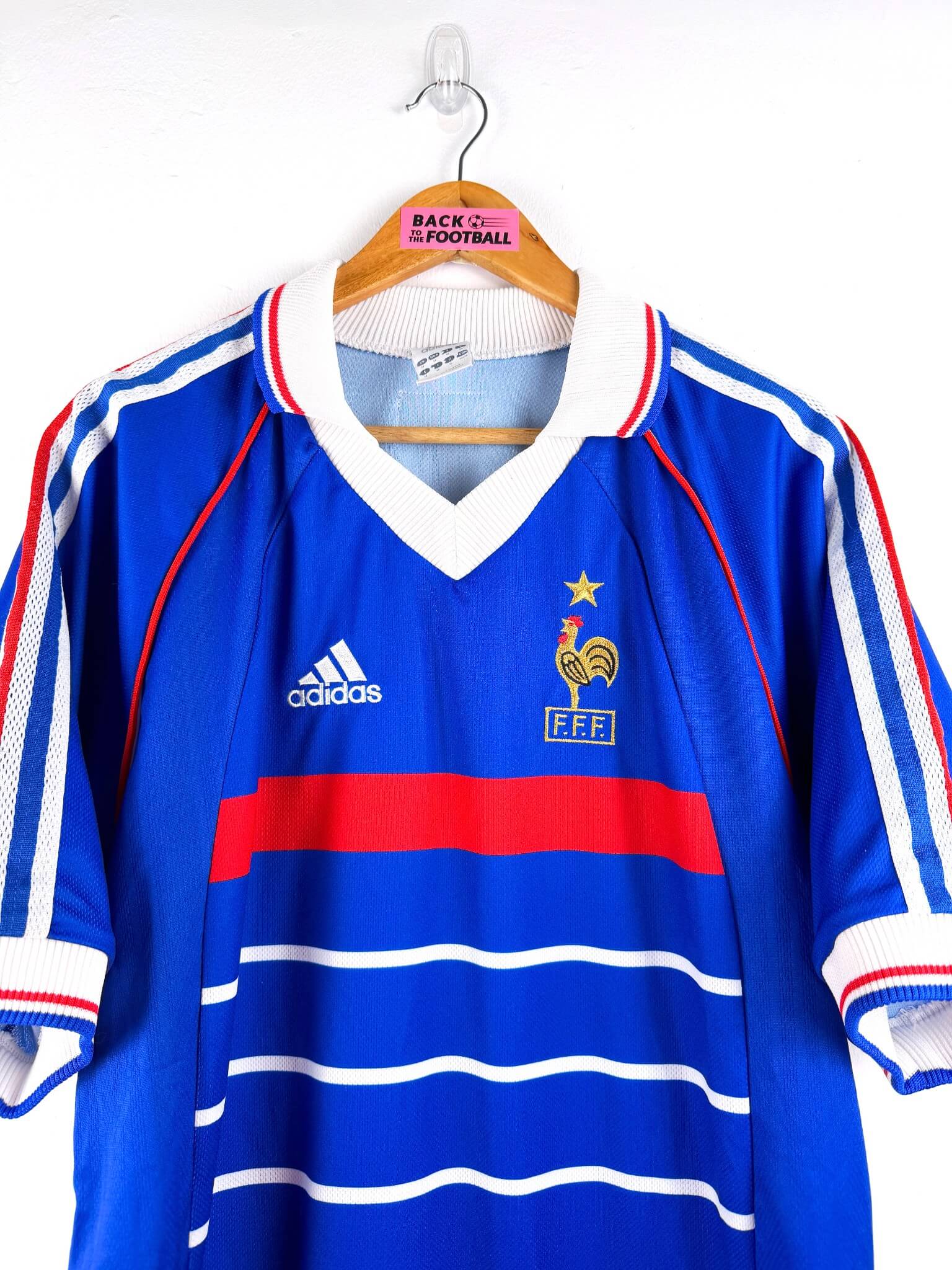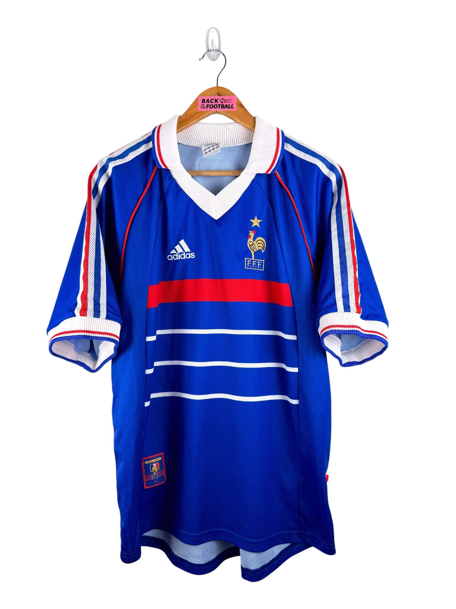 Le maillot : maillot vintage domicile de l’équipe de France 1998, la version avec l’étoile. Il s’agit de la réédition officielle Adidas de 2008. L’écusson et le logo Adidas sont brodés. Très beau maillot rétro de l’équipe de France !