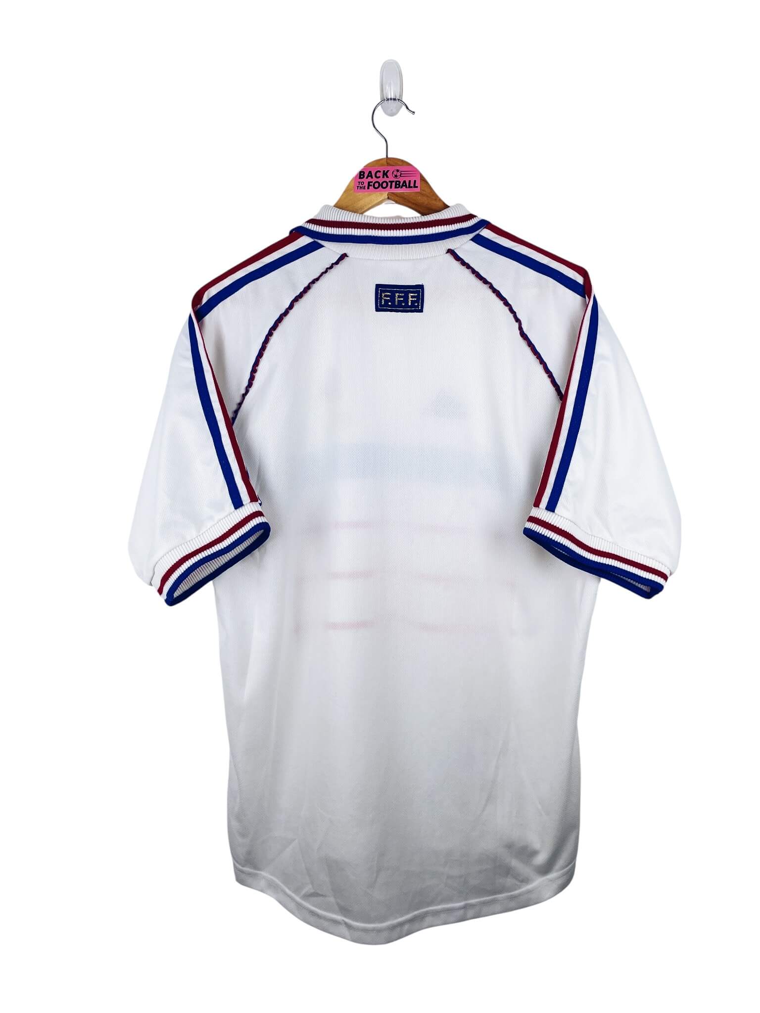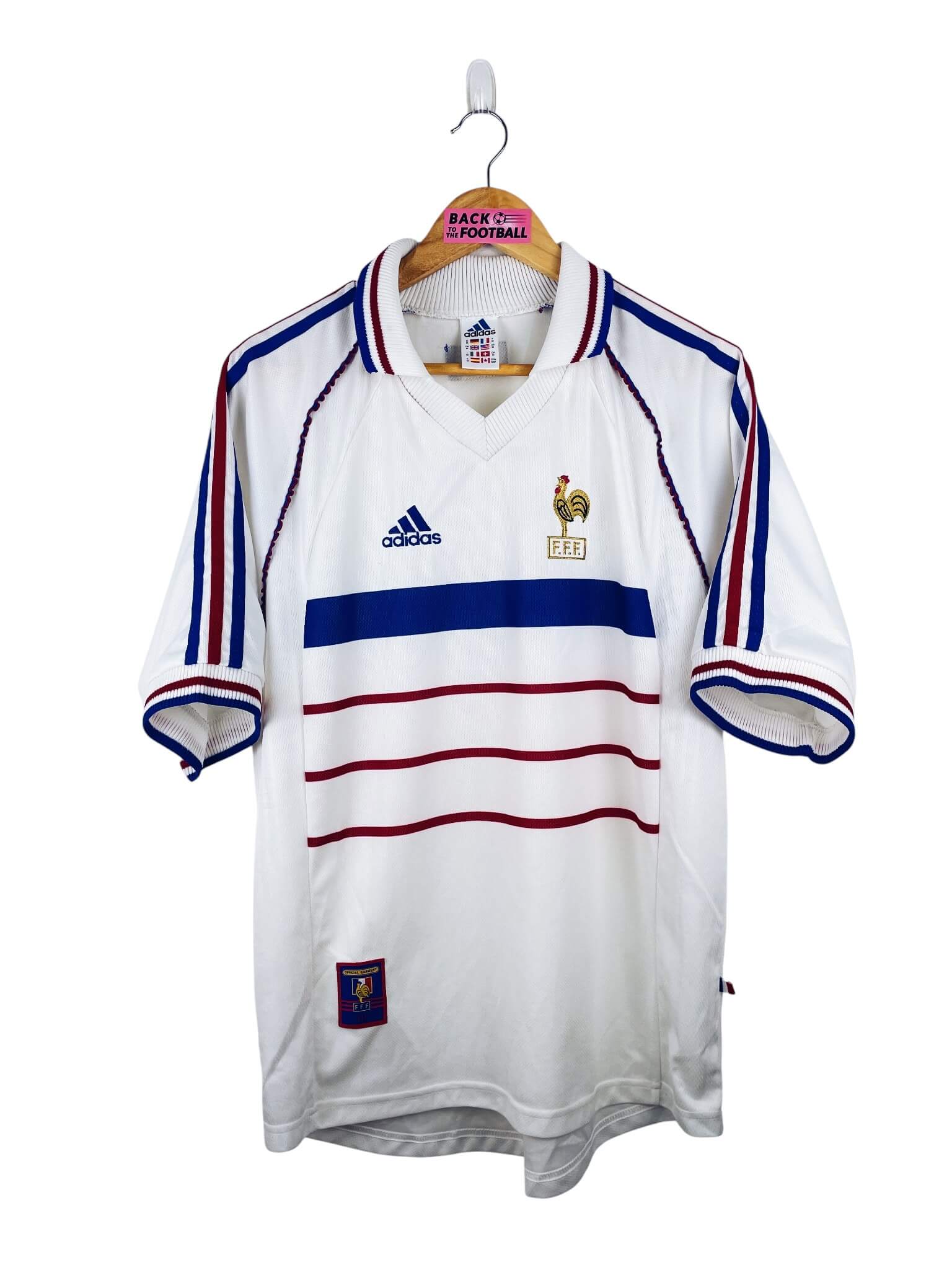 Le maillot : maillot vintage extérieur de l’équipe de France 1998, la version sans l’étoile. L’écusson et le logo Adidas sont brodés. Très beau maillot rétro de l’équipe de France !