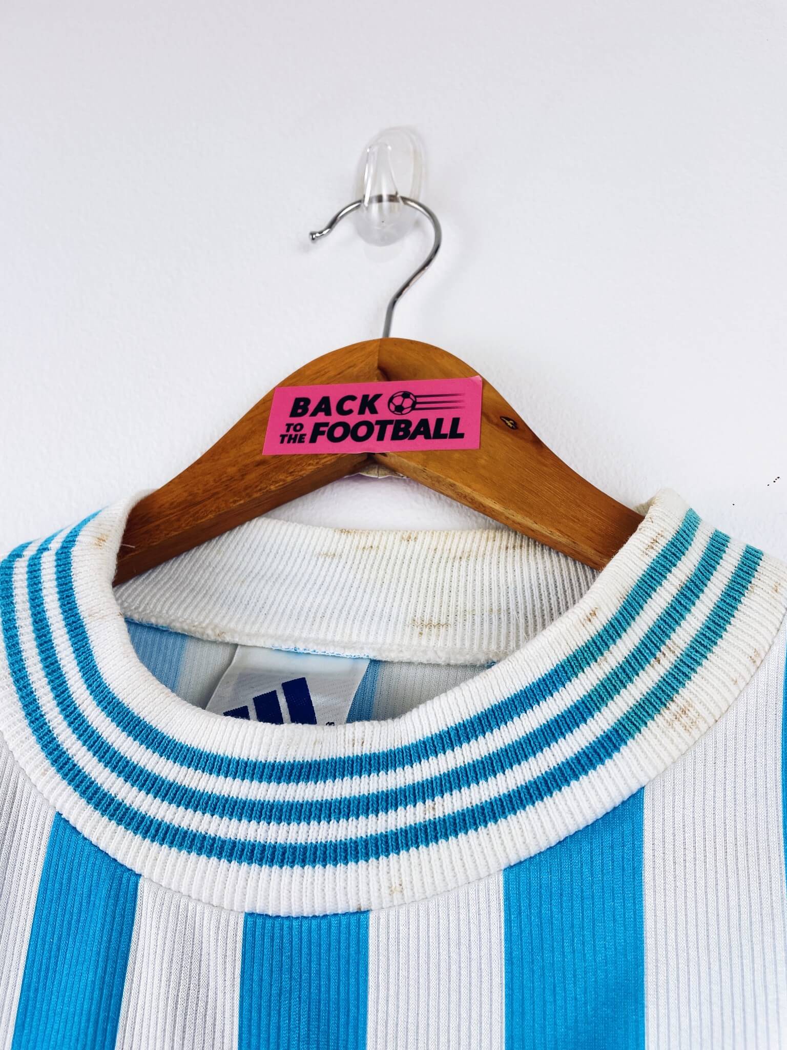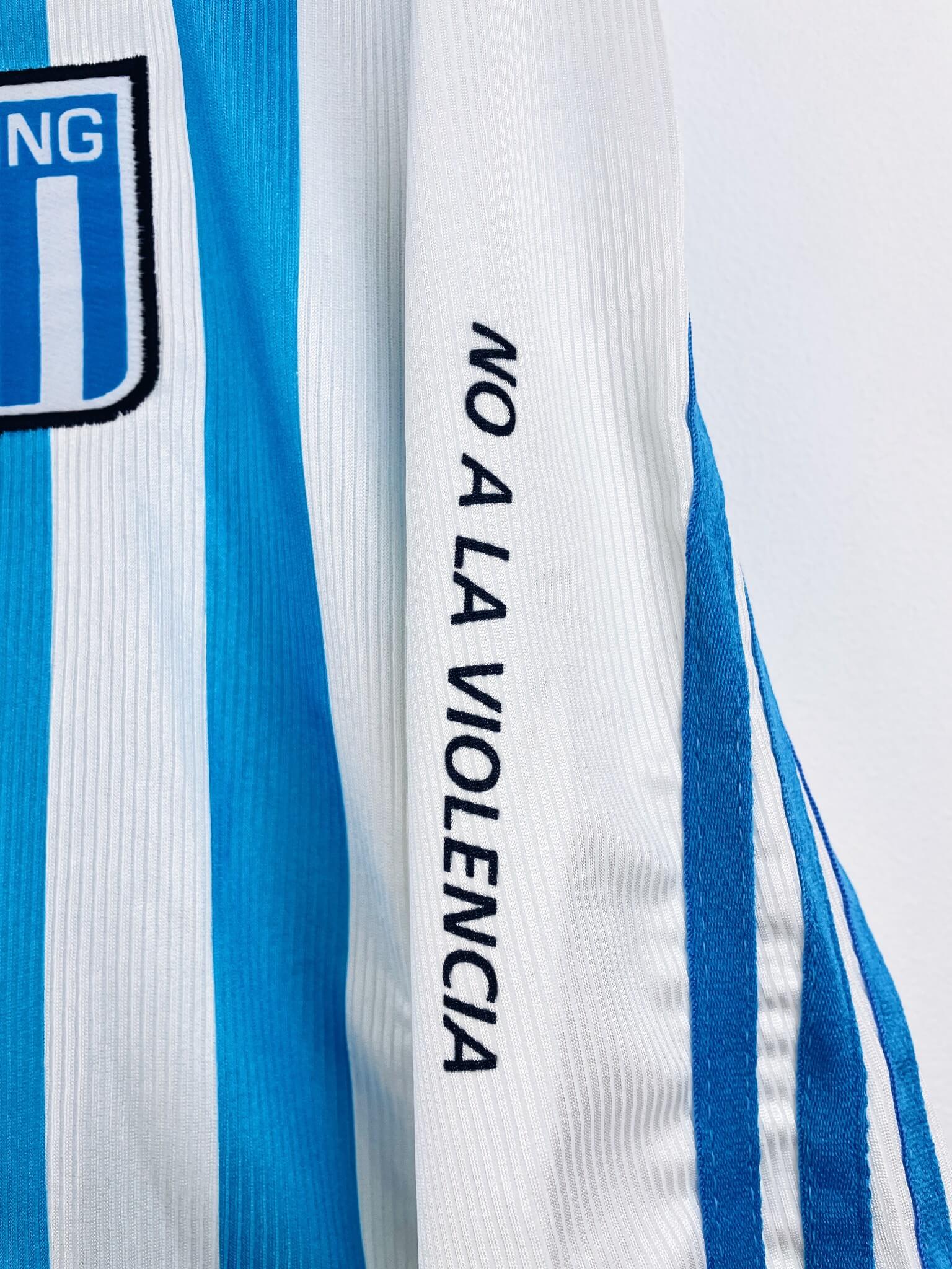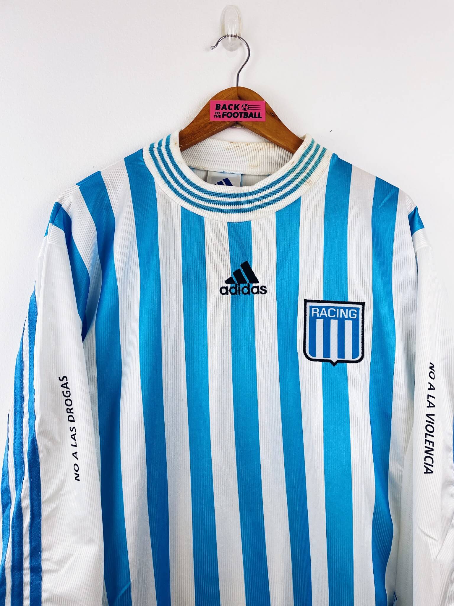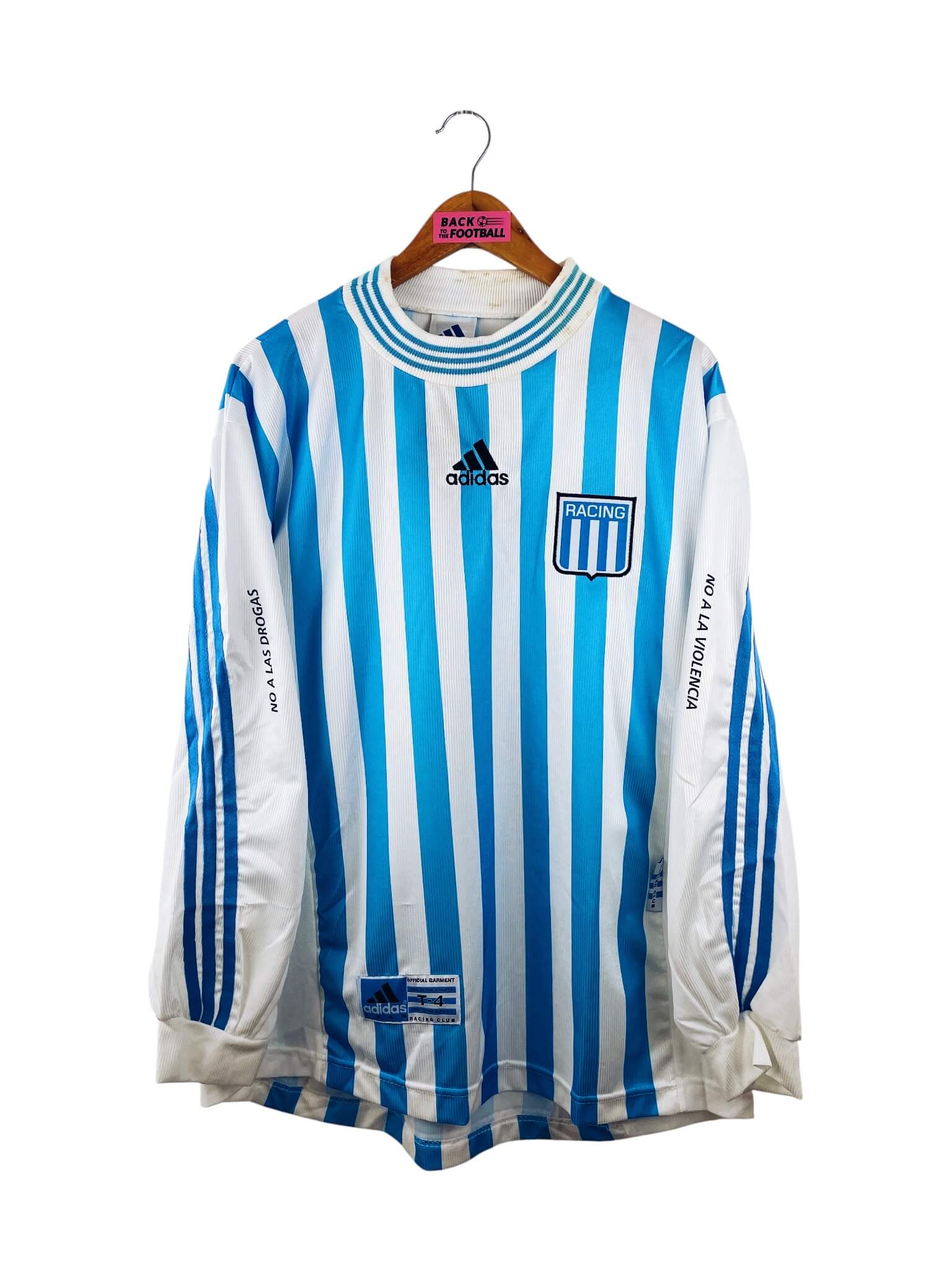 Le maillot : maillot vintage domicile du Racing Club 1999/2000 manches longues floqué du numéro 7. L’écusson et le logo Adidas sont brodés, le numéro 7 est en feutrine. Détail : No a las drogas et No a la violencia sont incrits sur les manches. Très beau maillot rétro du Racing Club de Avellaneda !