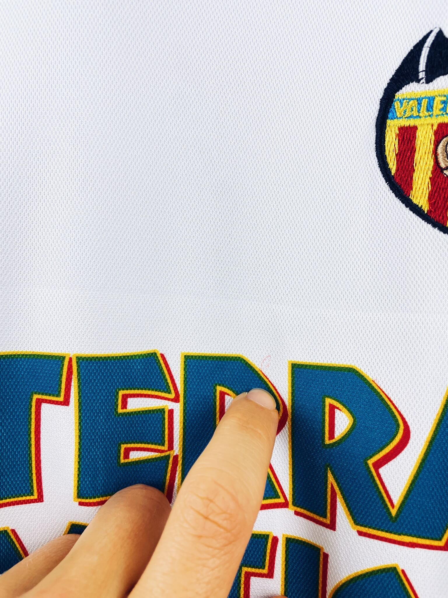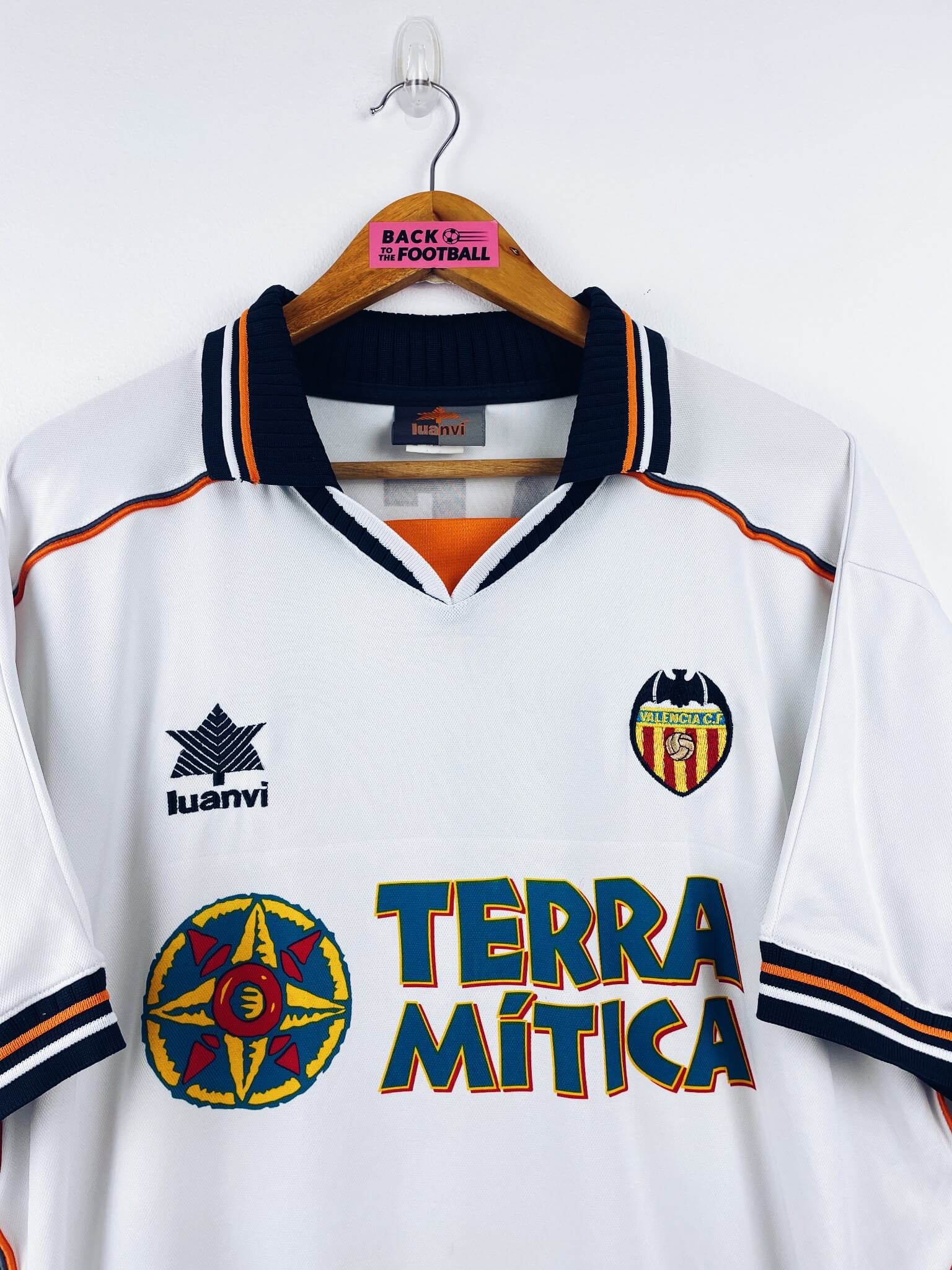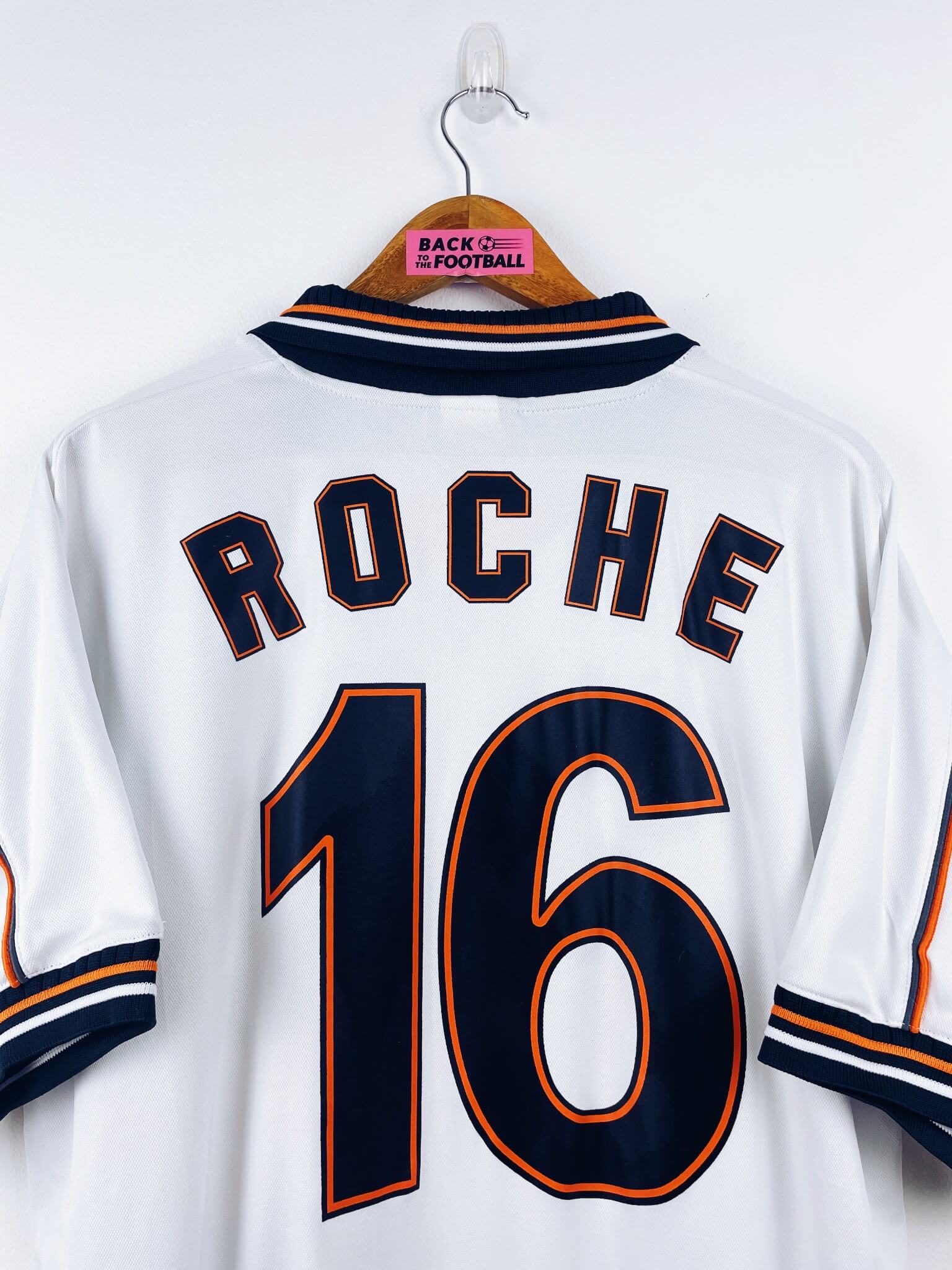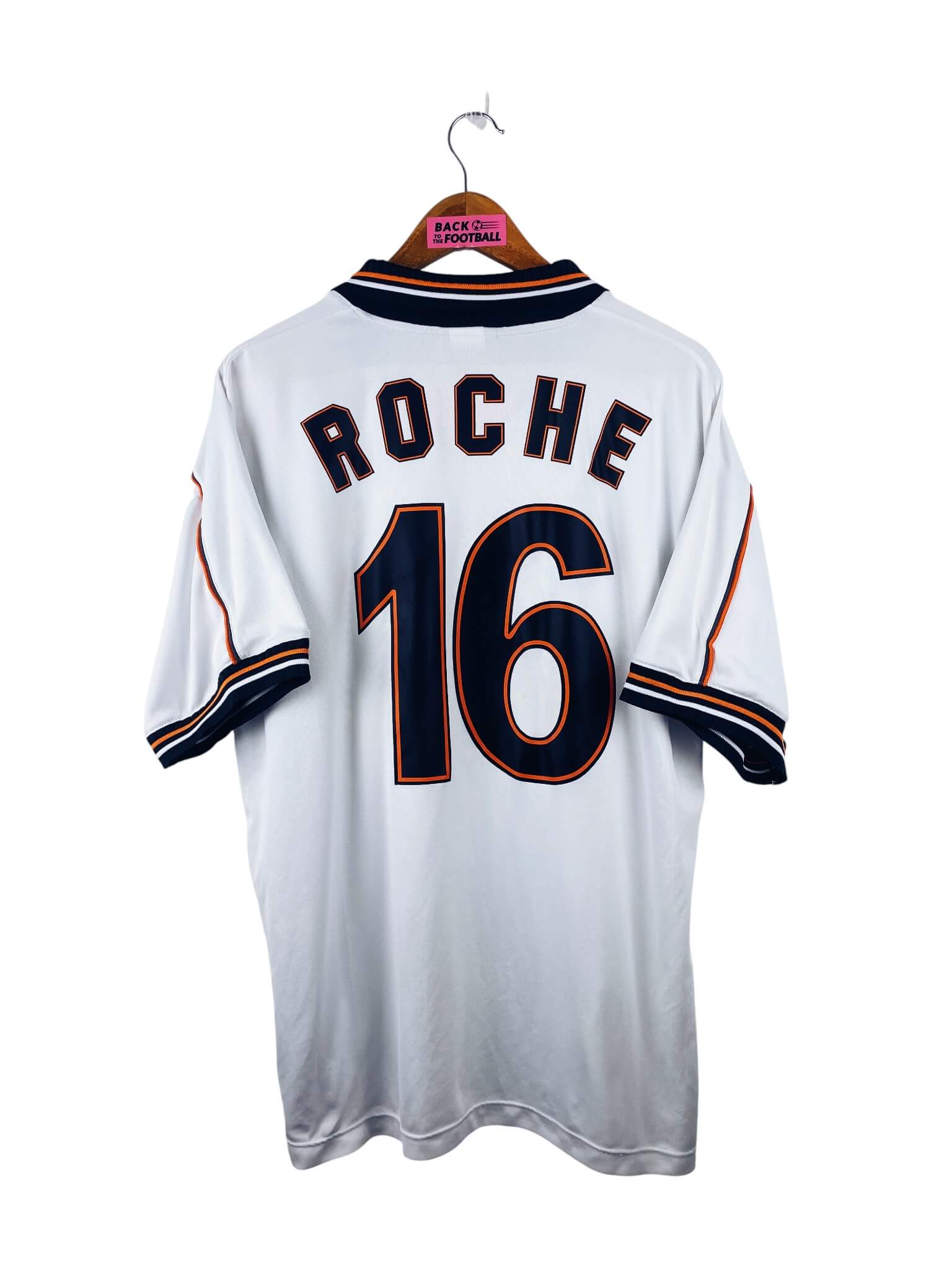 Le maillot : maillot vintage domicile de Valence 1999/2000 floqué Roche #16. L’écusson et le logo Luanvi sont brodés, le sponsor Terra Mitica est incrusté, Roche #16 floqué. Très beau maillot rétro de Valence !