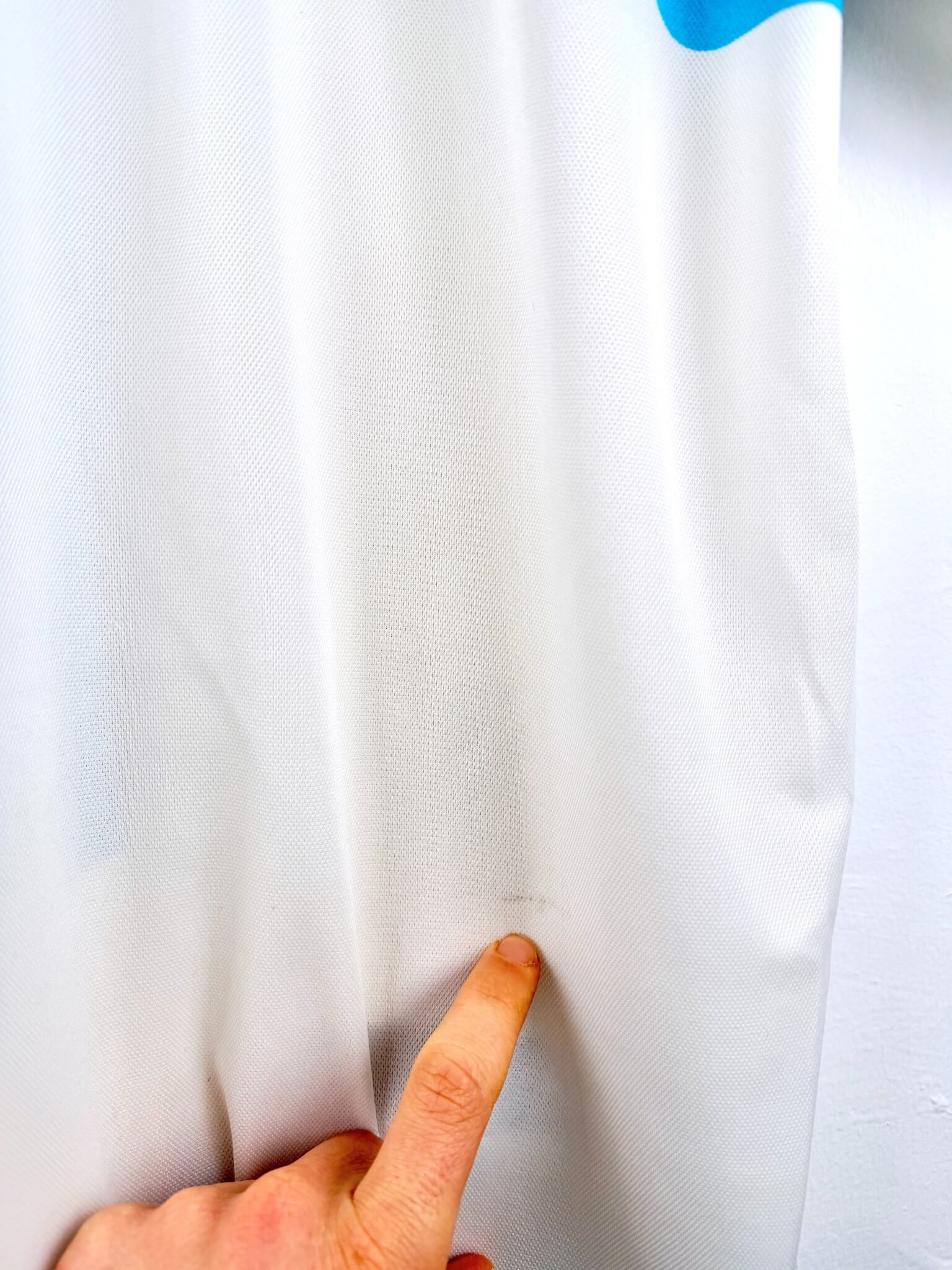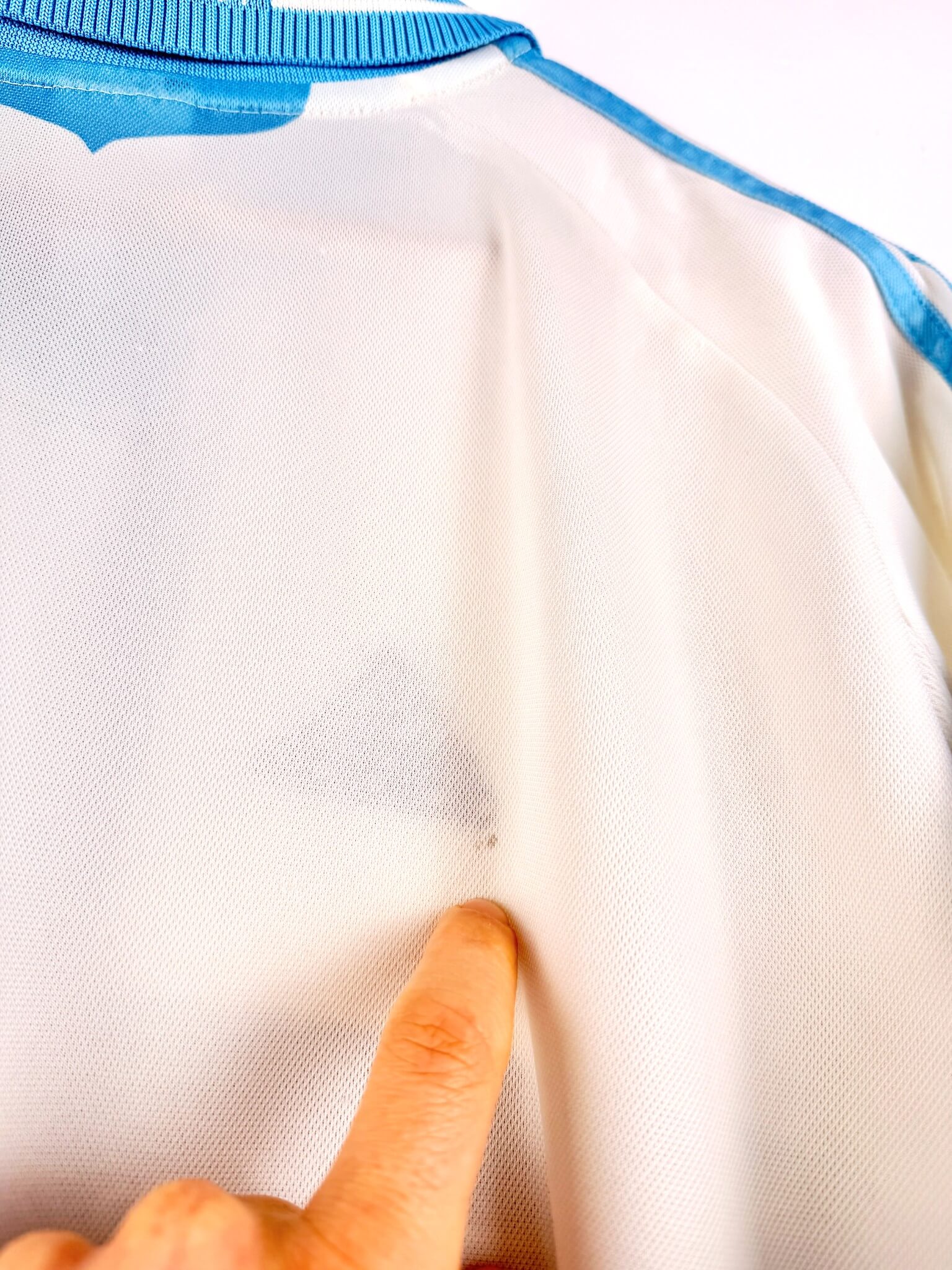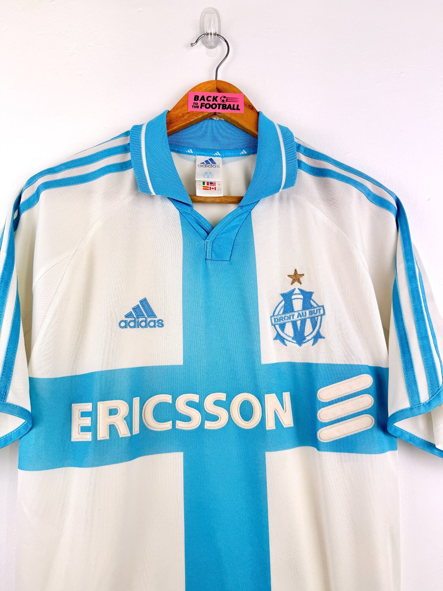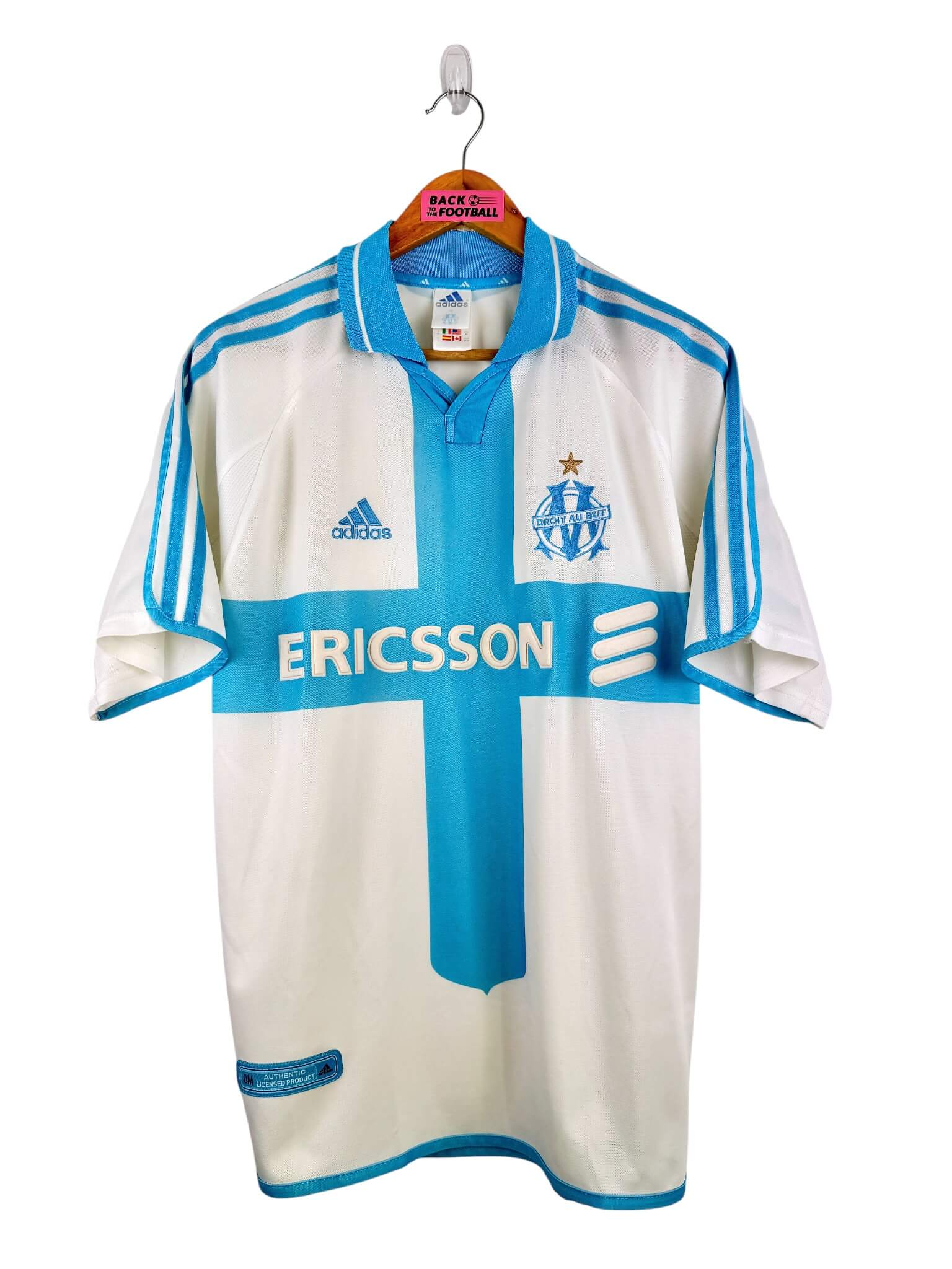 Le maillot : maillot vintage domicile de l’OM 2000/2001. L’écusson et le logo Adidas sont brodés, le sponsor Ericsson est en feutrine. Très beau maillot rétro de l’Olympique de Marseille !