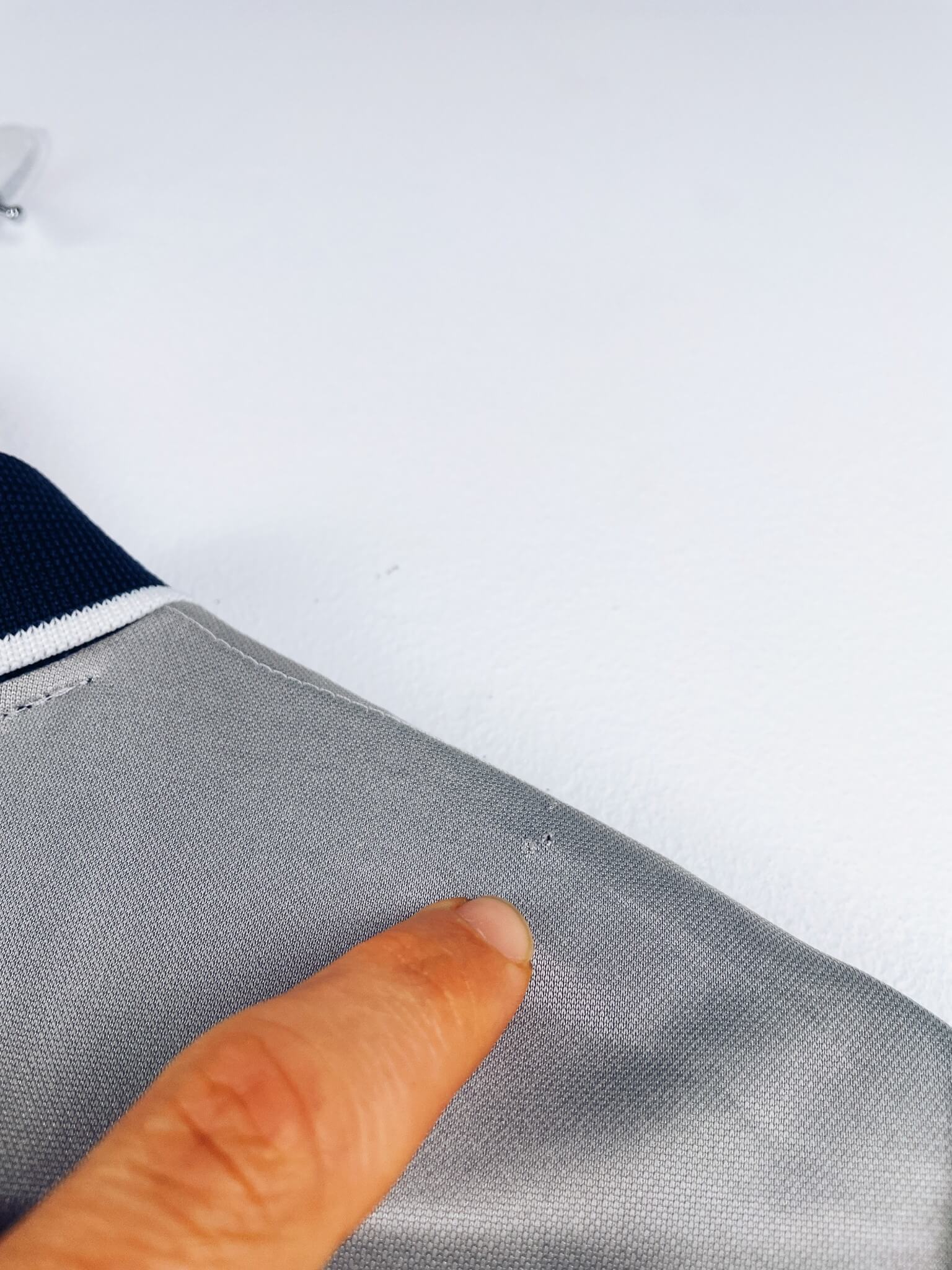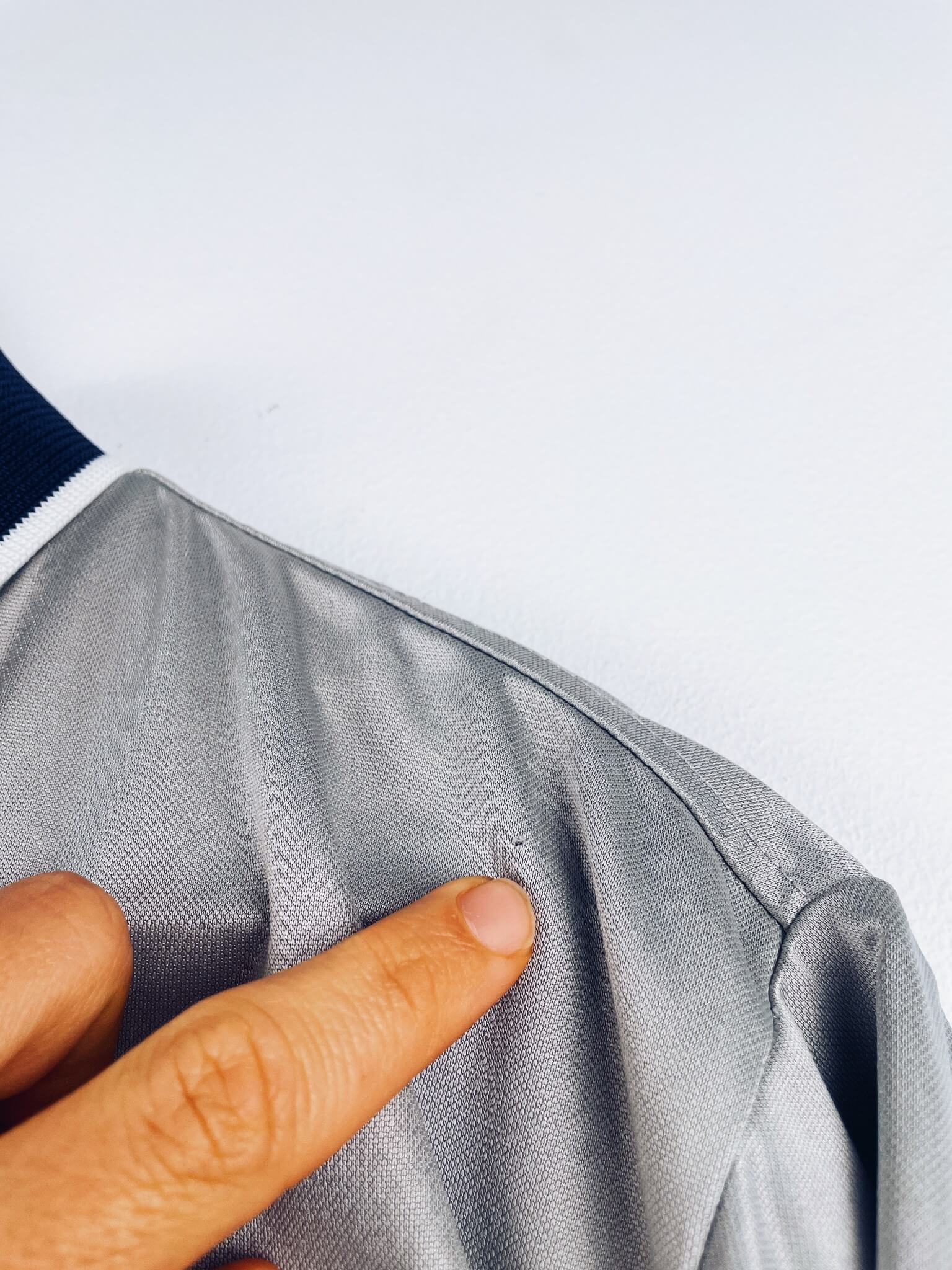 Etat : 8/10, très bon état hormis le patch PSG sur la manche qui est abimé et 4 minis trous au niveau des épaules, le maillot devait être accroché (voir photos)