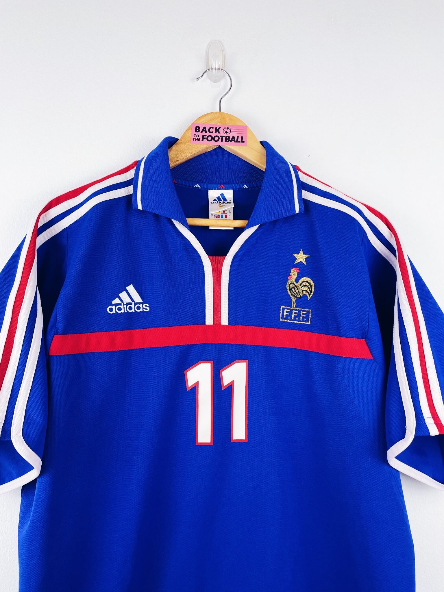 Le maillot : maillot vintage domicile de l’équipe de France 2000 utilisé pour l’Euro 2000. L’écusson et le logo Adidas sont brodés. Le numéro 11 est floqué. Le numéro 11 était Robert Pirès. Très beau maillot rétro de la France !