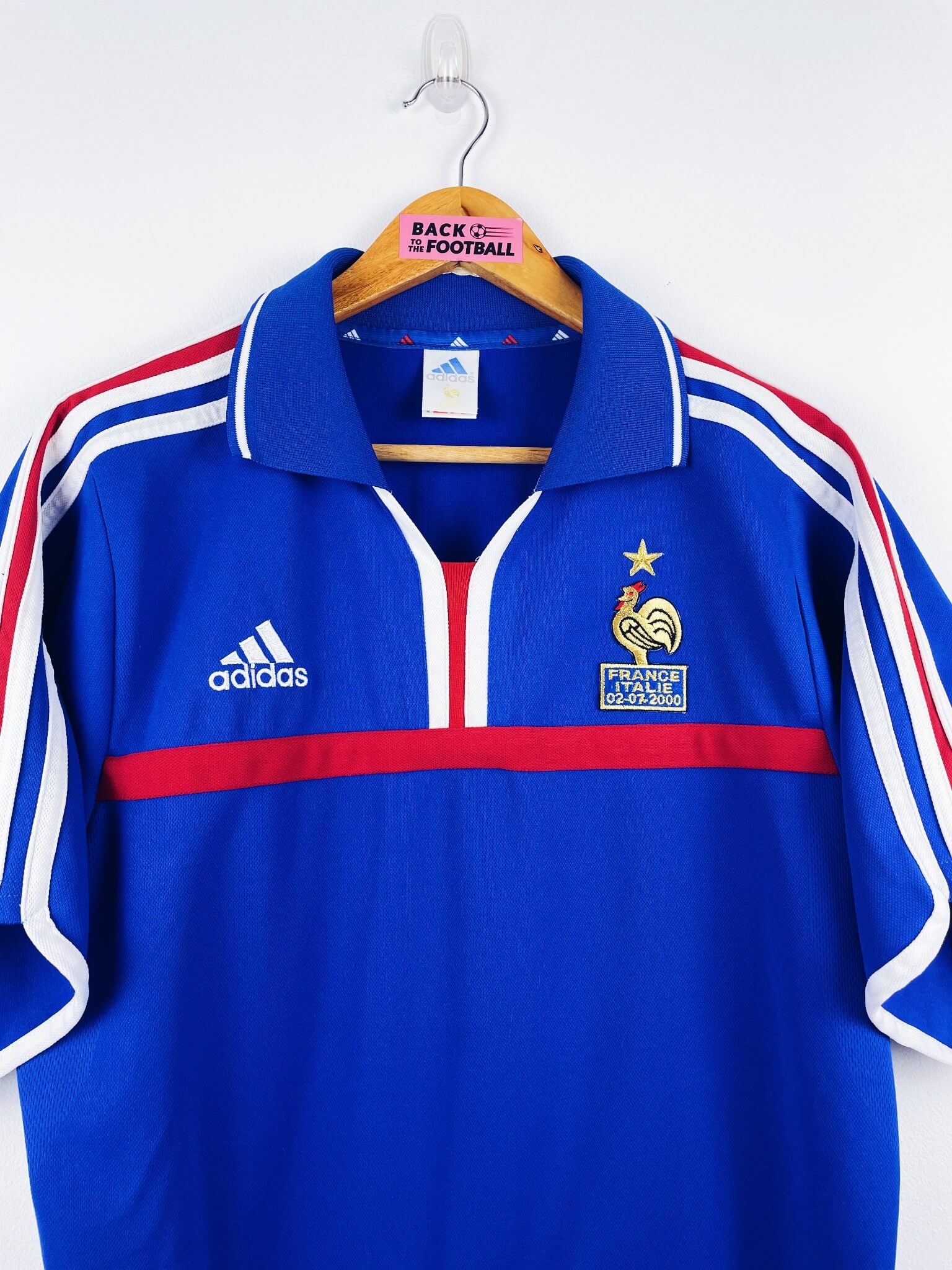 Histoire : après une victoire en Coupe du Monde 1998, les Bleus arrivent en force pour l’Euro 2000 organisé par les Pays-Bas et la Belgique. La suite on la connait : après avoir éliminé l’Espagne en quart, la France élimine le Portugal grâce à un but en or de Zidane. En finale contre l’Italie, Trezeguet envoie une volée du gauche dans la lucarne de Toldo pour le but en or et la victoire des Bleus !