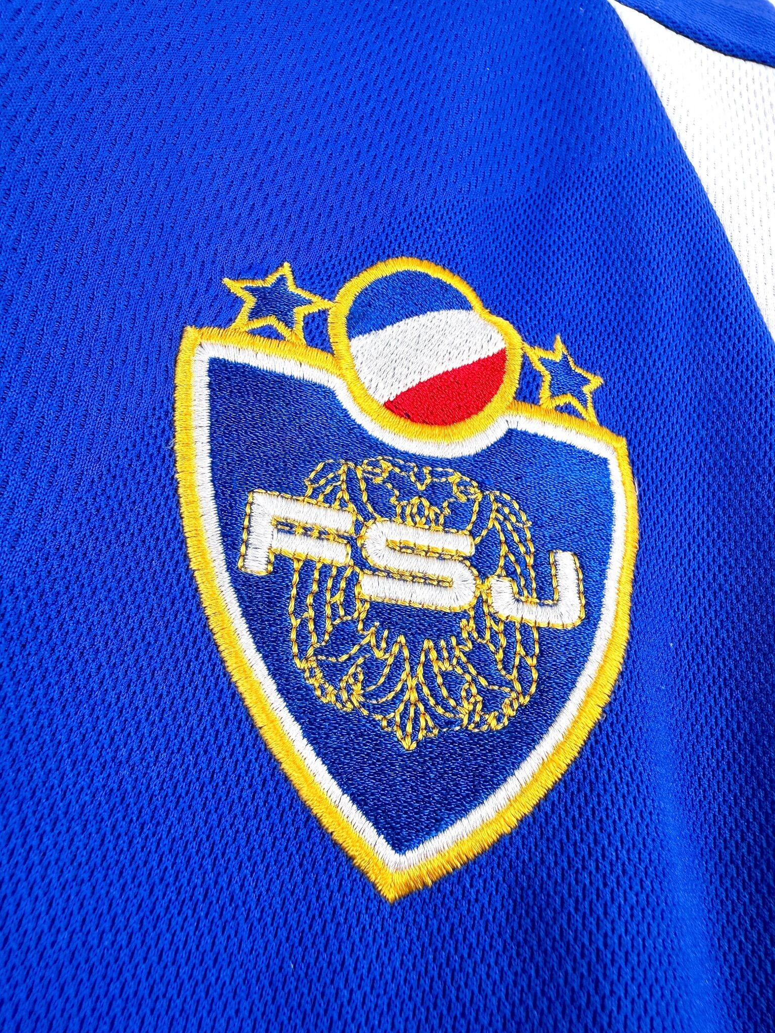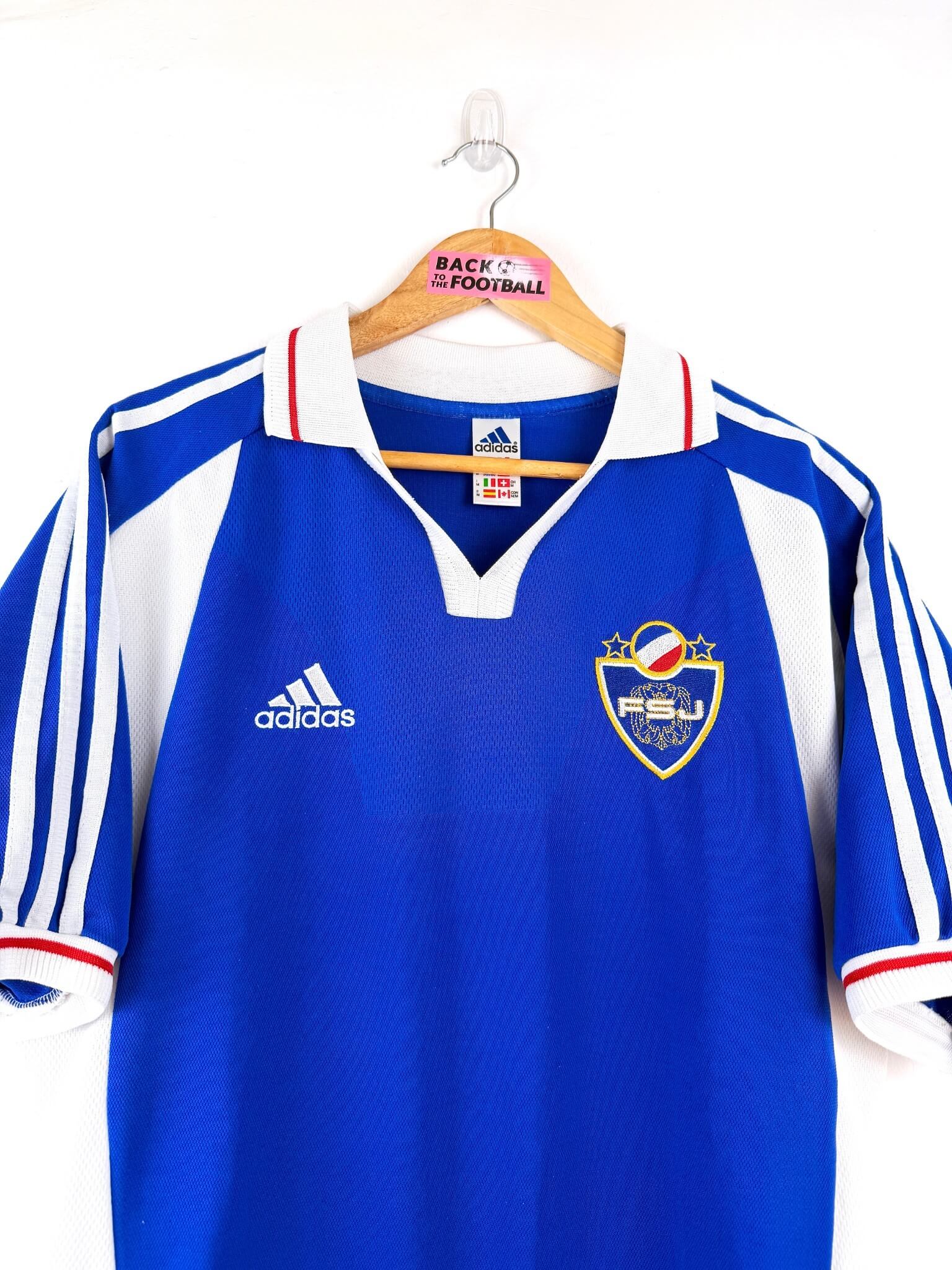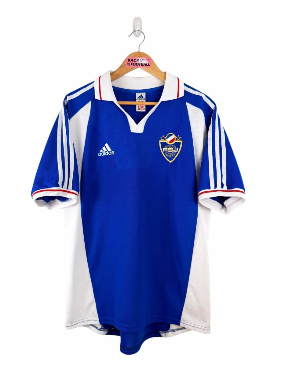 Le maillot : maillot vintage domicile de la Yougoslavie 2000, utilisé pour l’Euro 2000. L’écusson et le logo Adidas sont brodés. Très beau maillot rétro de la Yougoslavie !