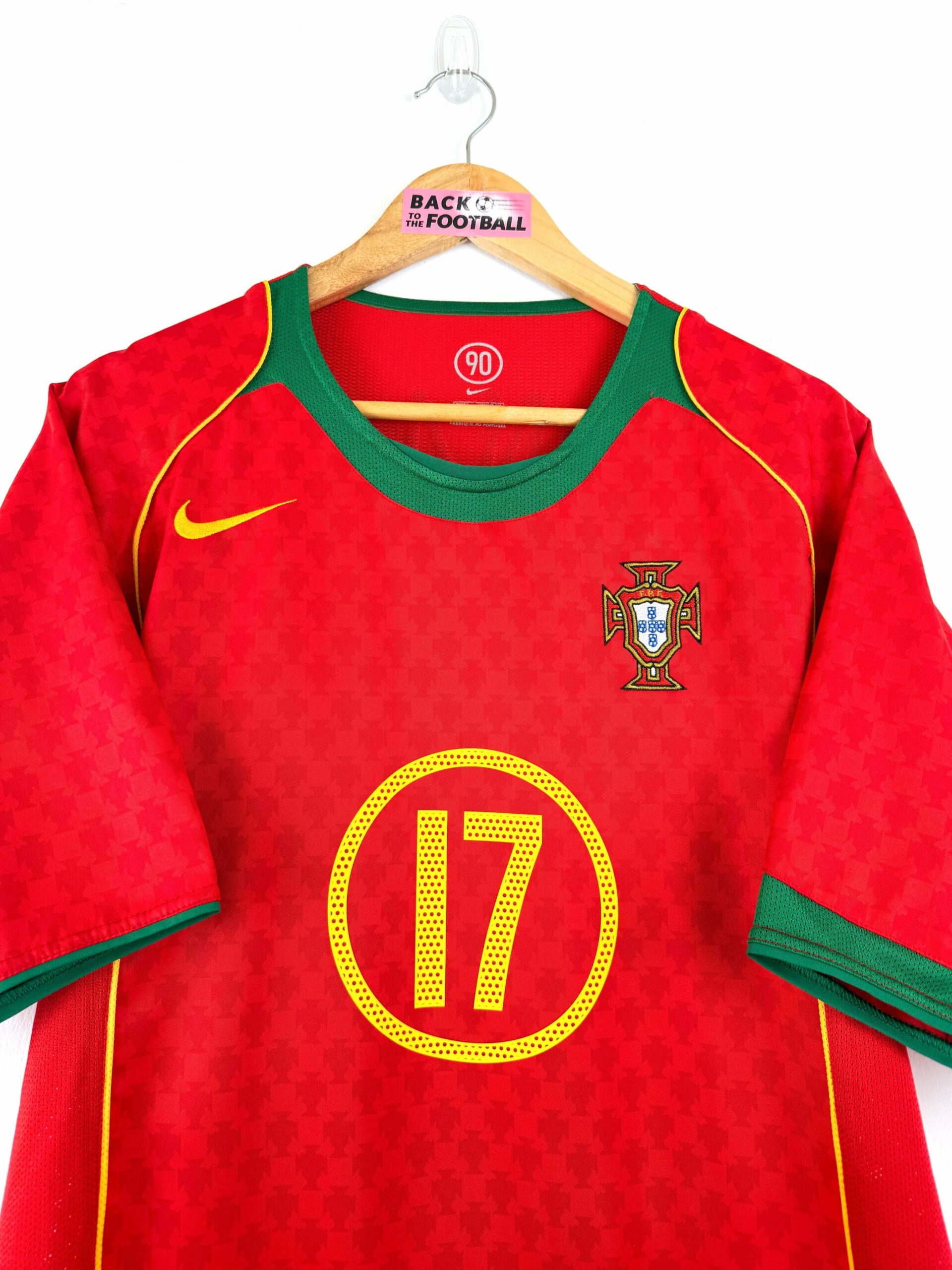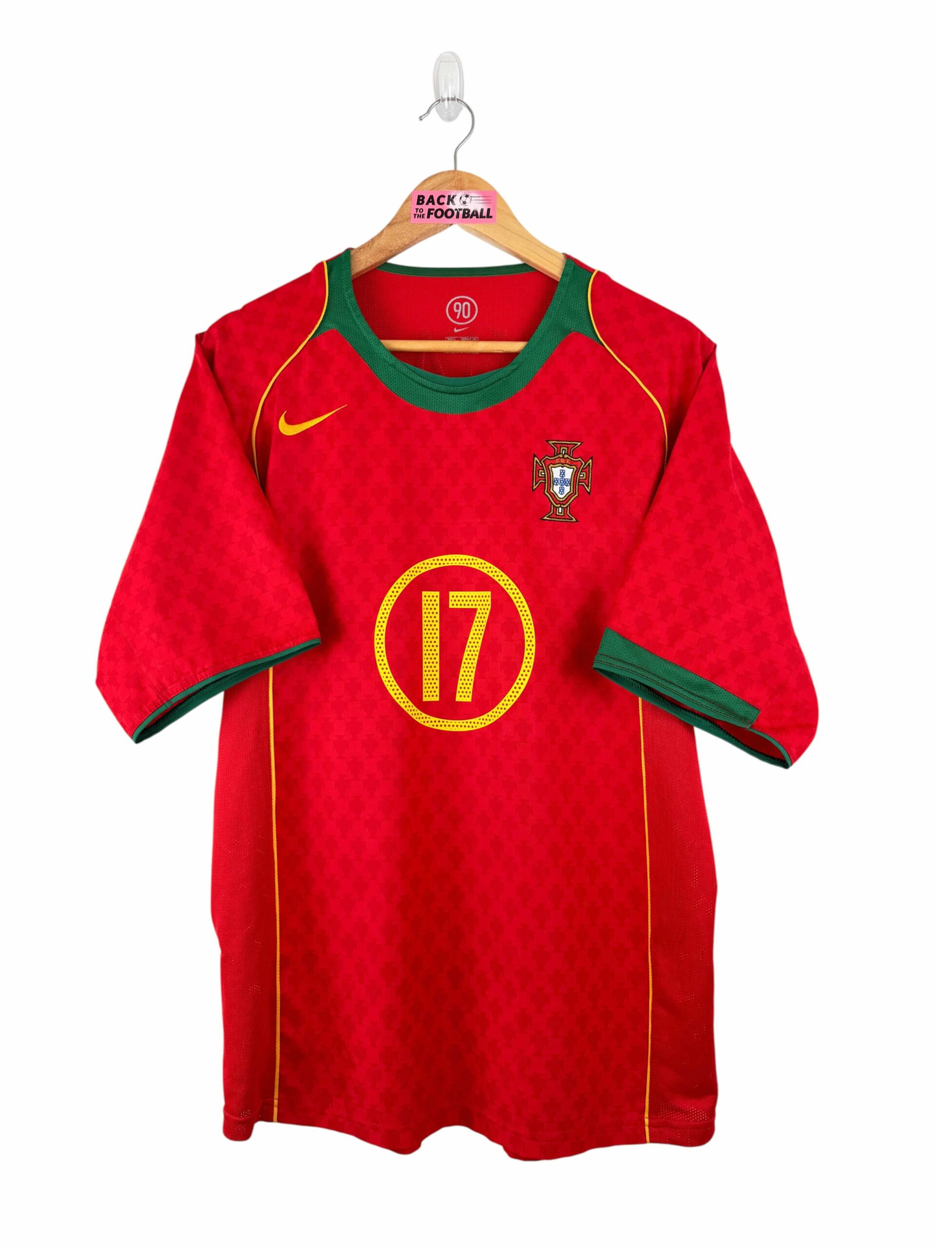 Le maillot : maillot vintage domicile du Portugal pour l’Euro 2004, floqué C. Ronaldo #17. L’écusson et le logo Nike sont brodés. Cristian Ronaldo est floqué. On peut voir en l’écusson en motifs sur tout le maillot. Très beau maillot rétro du Portugal !