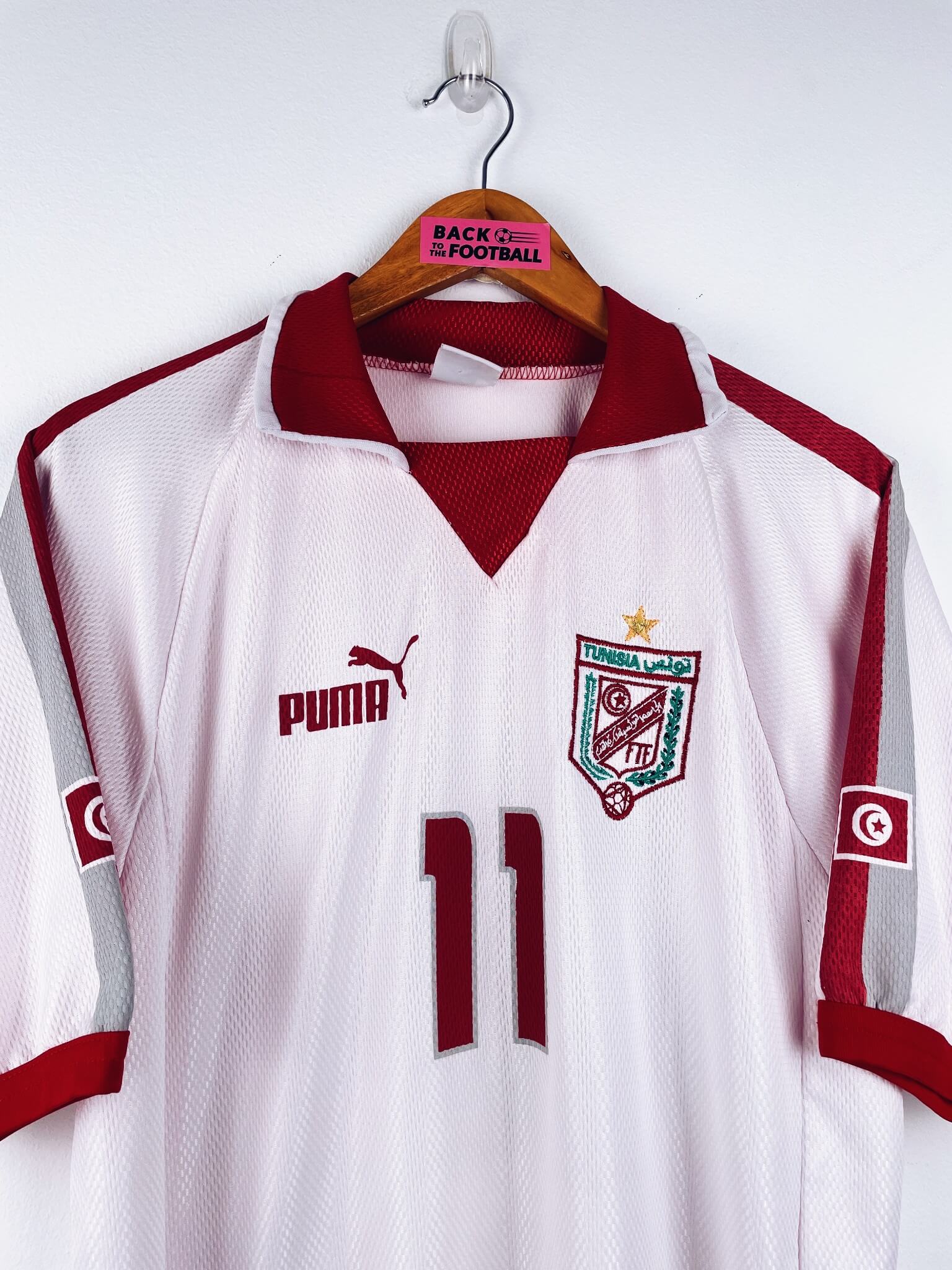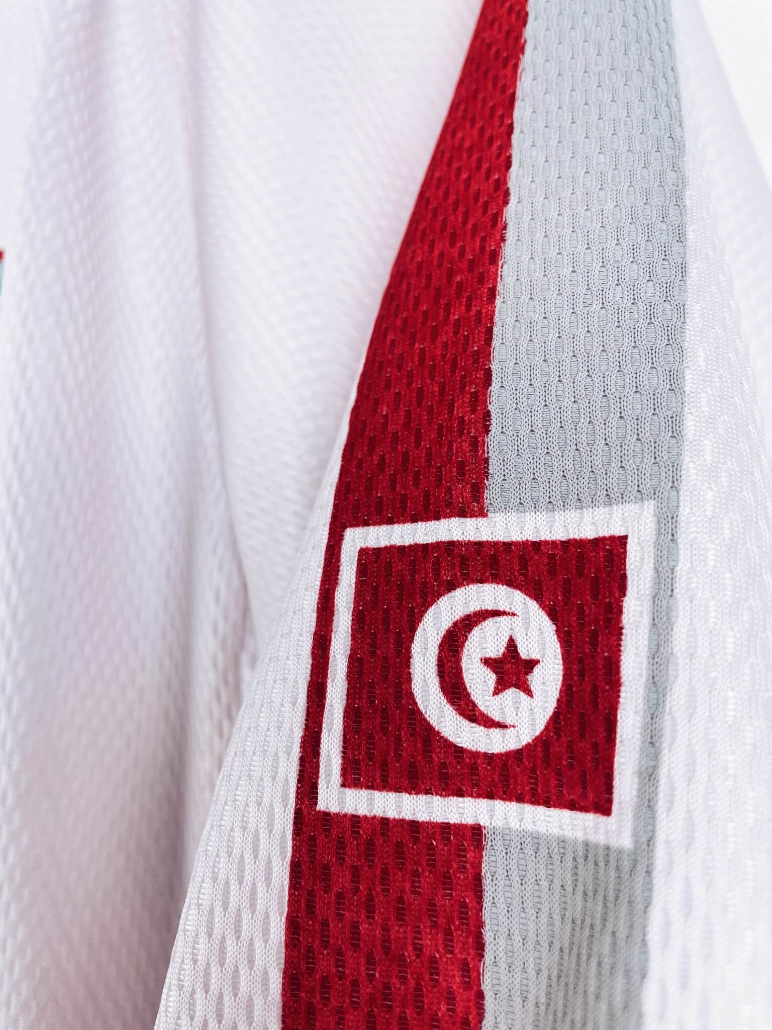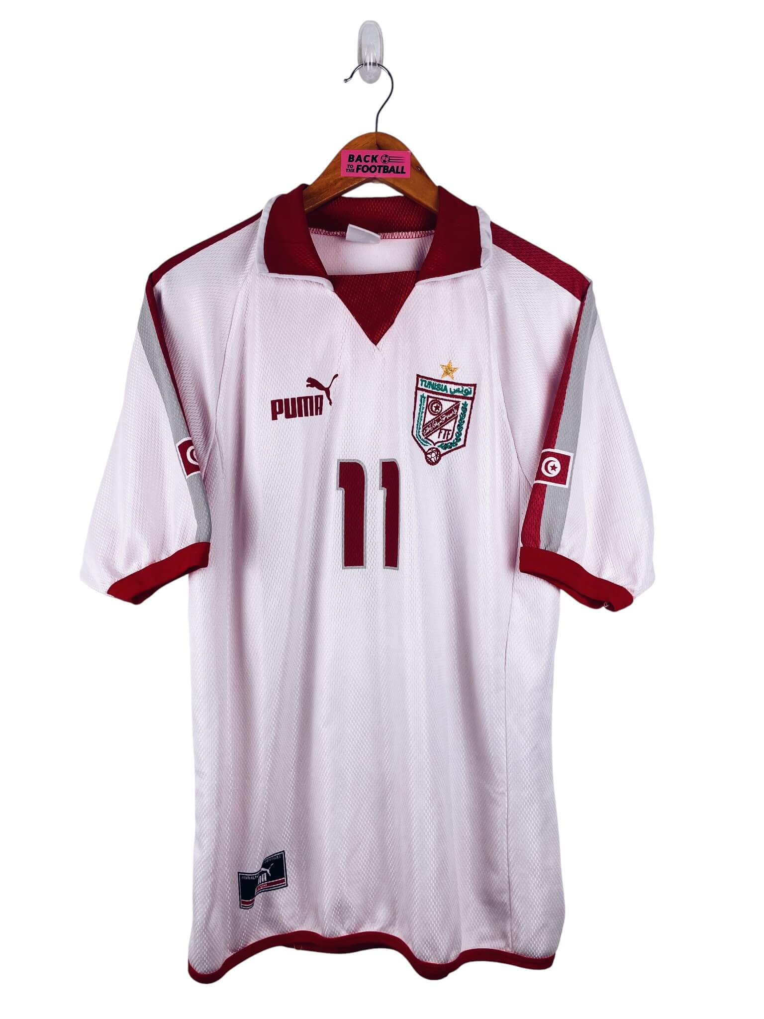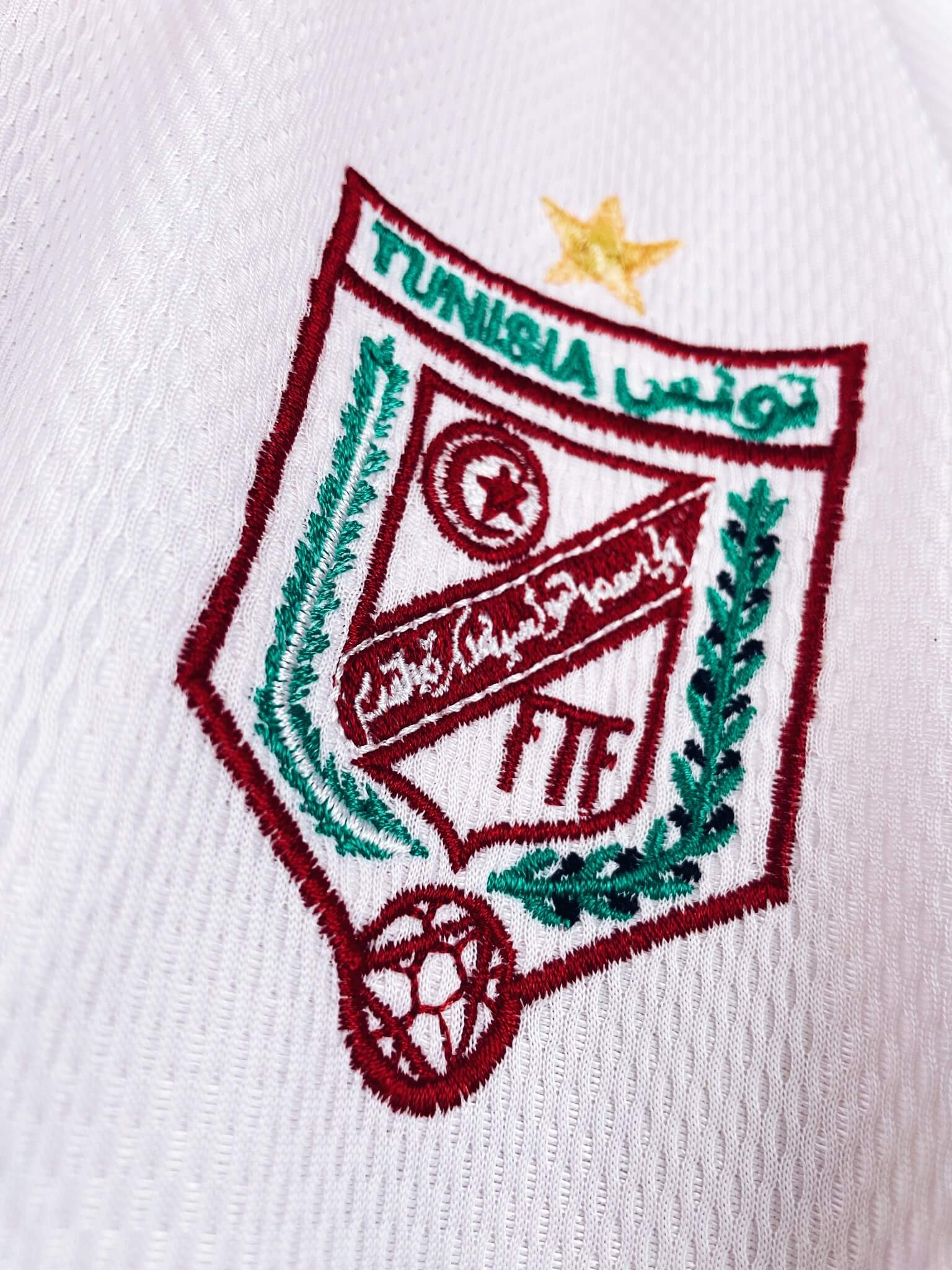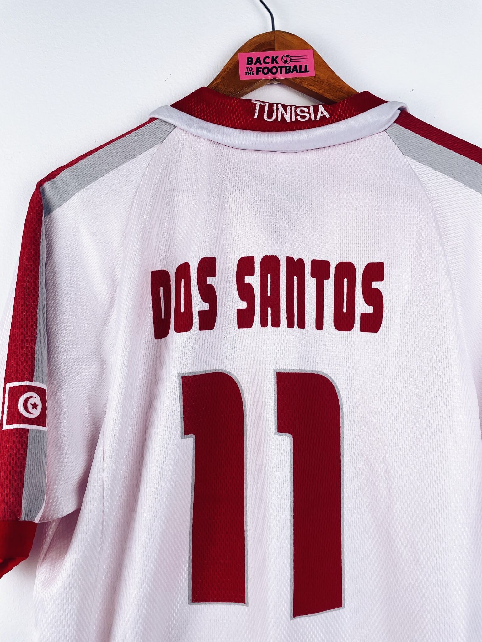 Le maillot : maillot vintage domicile de la Tunisie 2004 floqué Dos Santos #11. L’écusson est brodé, le logo Puma et Dos Santos #11 sont floqués. Très beau maillot rétro de la Tunisie !
