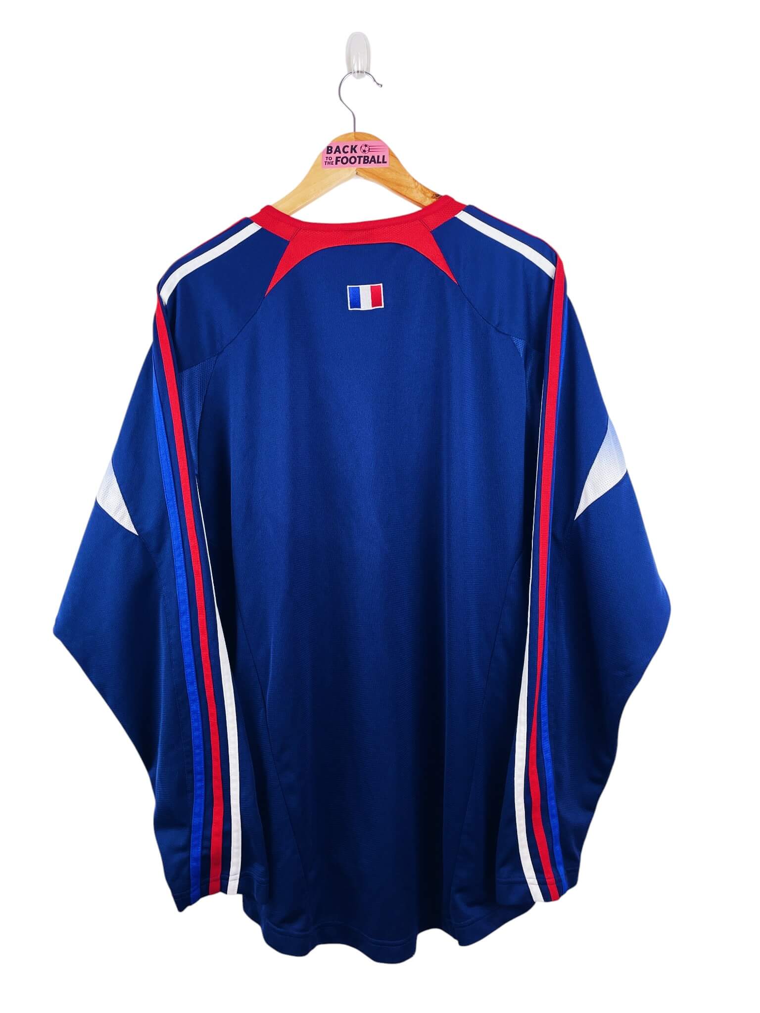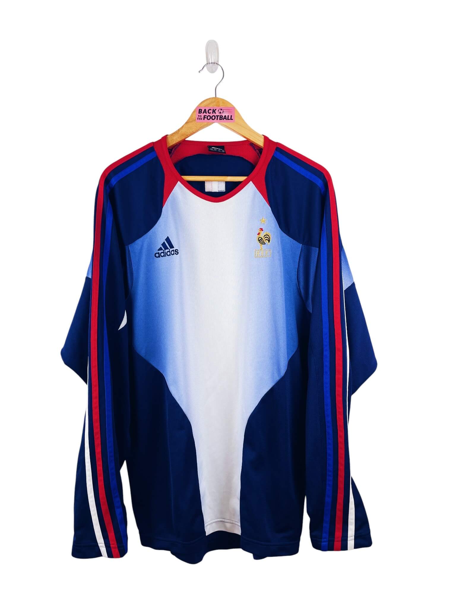 Le maillot : maillot vintage entrainement de l’équipe de France 2004 manches longues. L’écusson avec une étoile et le logo Adidas sont brodés. Très beau maillot rétro de la France !