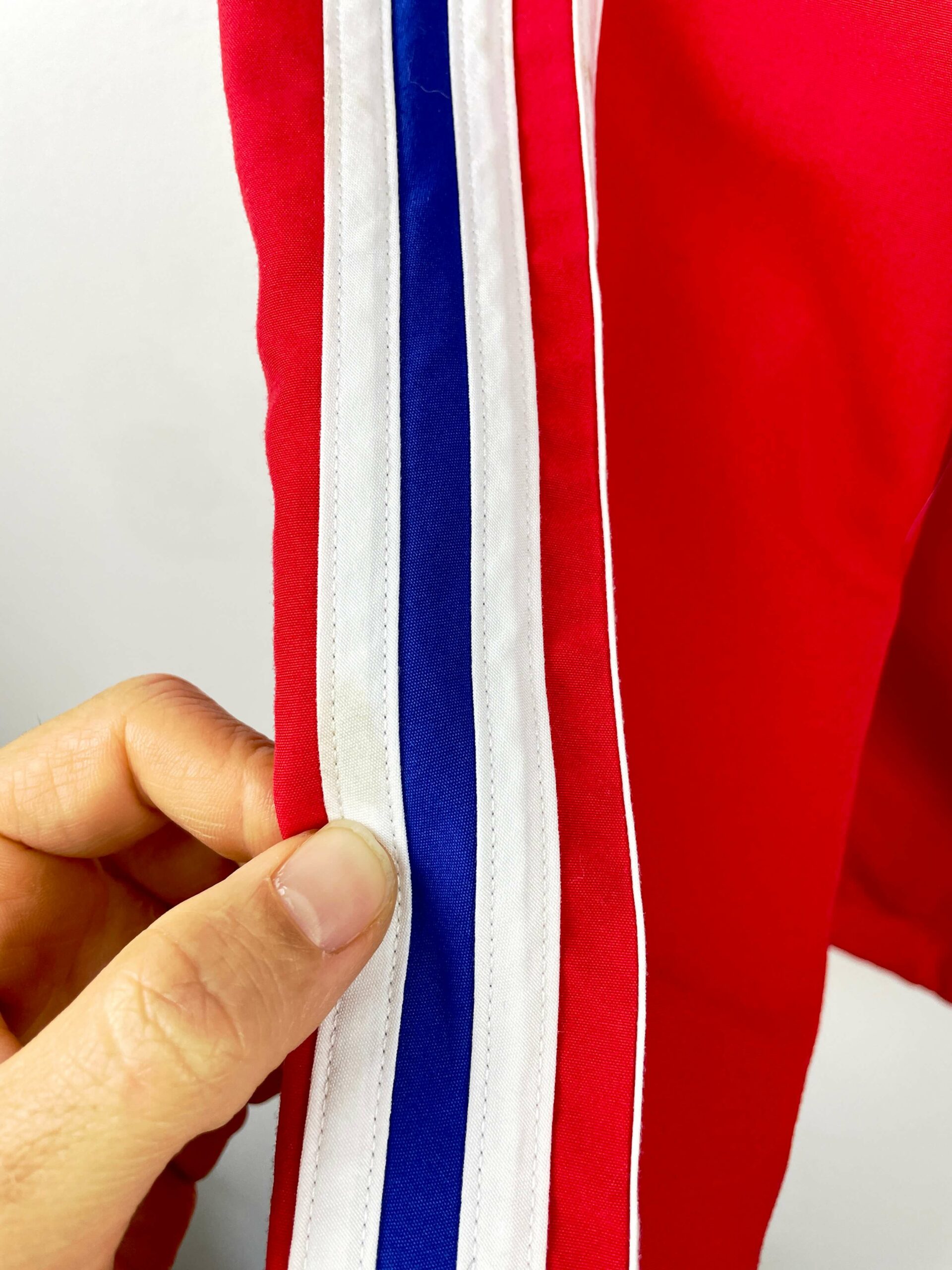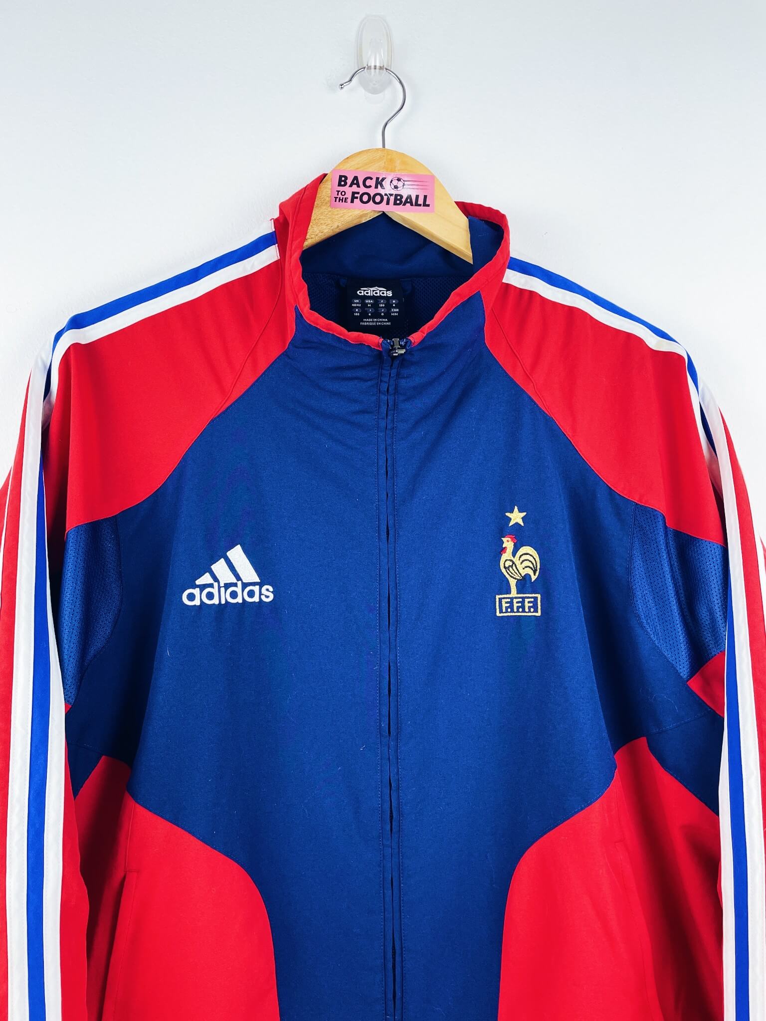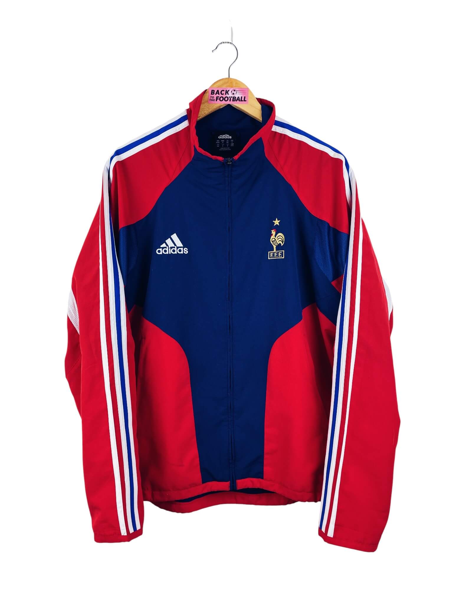 La veste : veste vintage de l’équipe de France 2004. L’écusson avec une étoile et le logo Adidas sont brodés. 2 poches latérales zippées. Très belle veste rétro de la France !