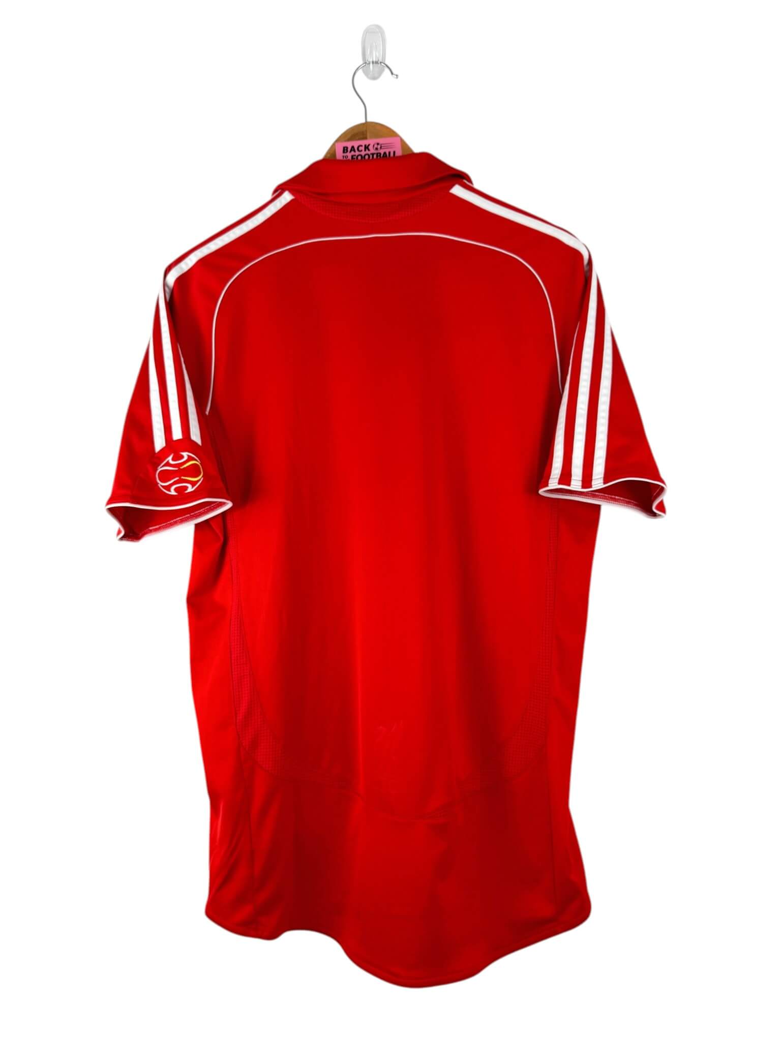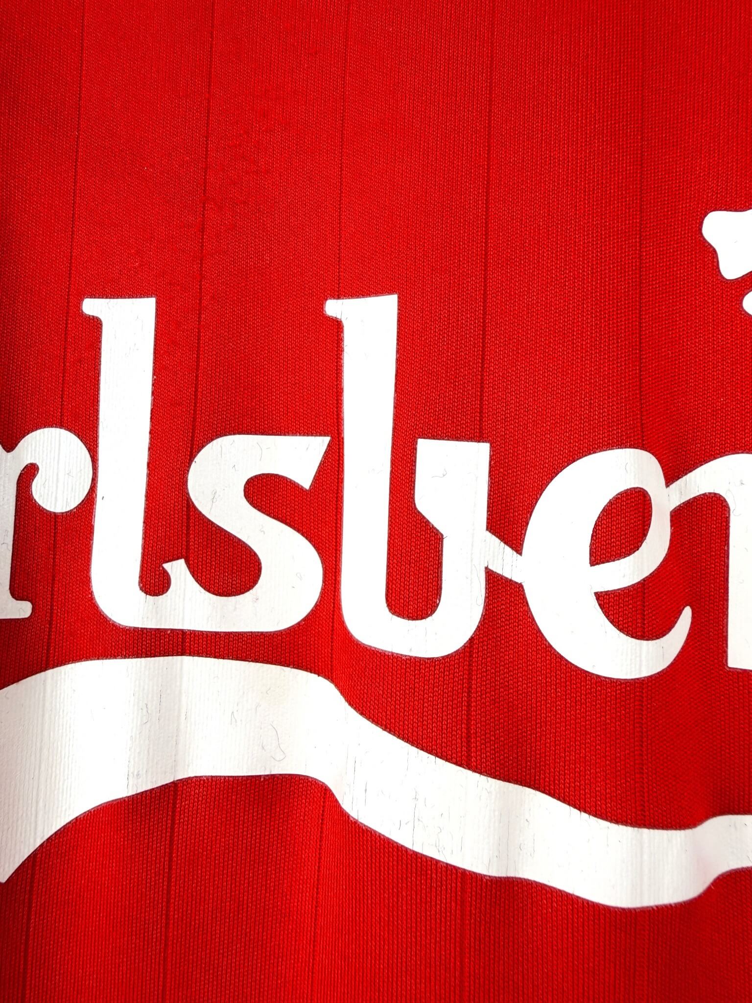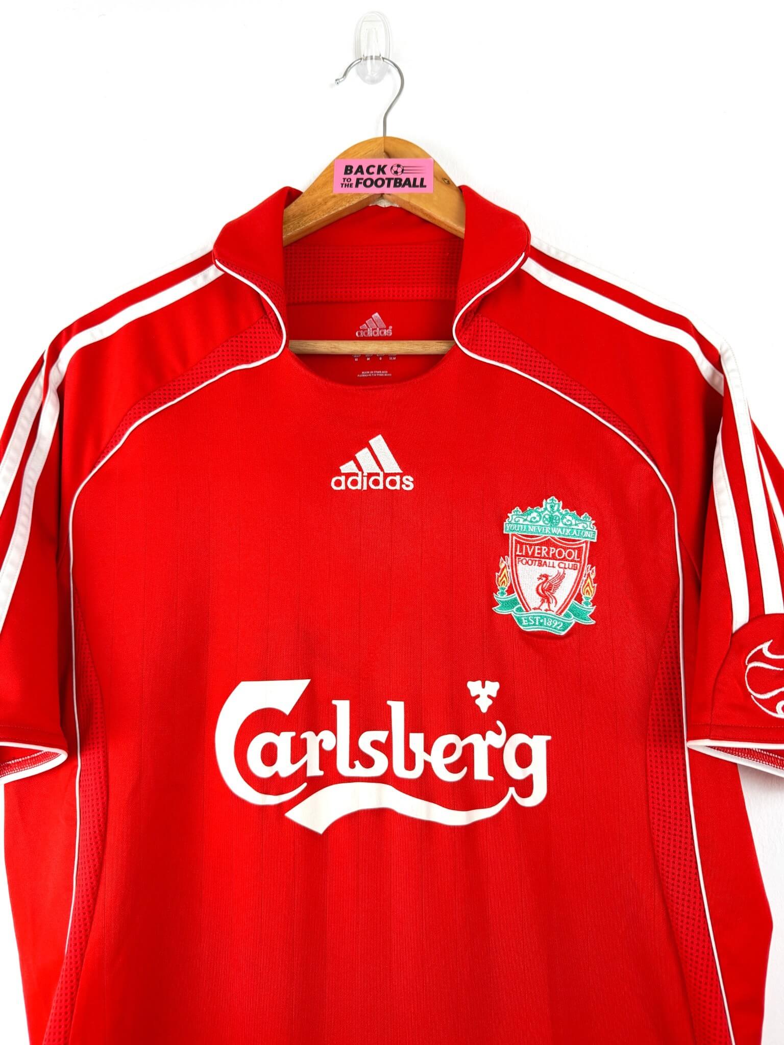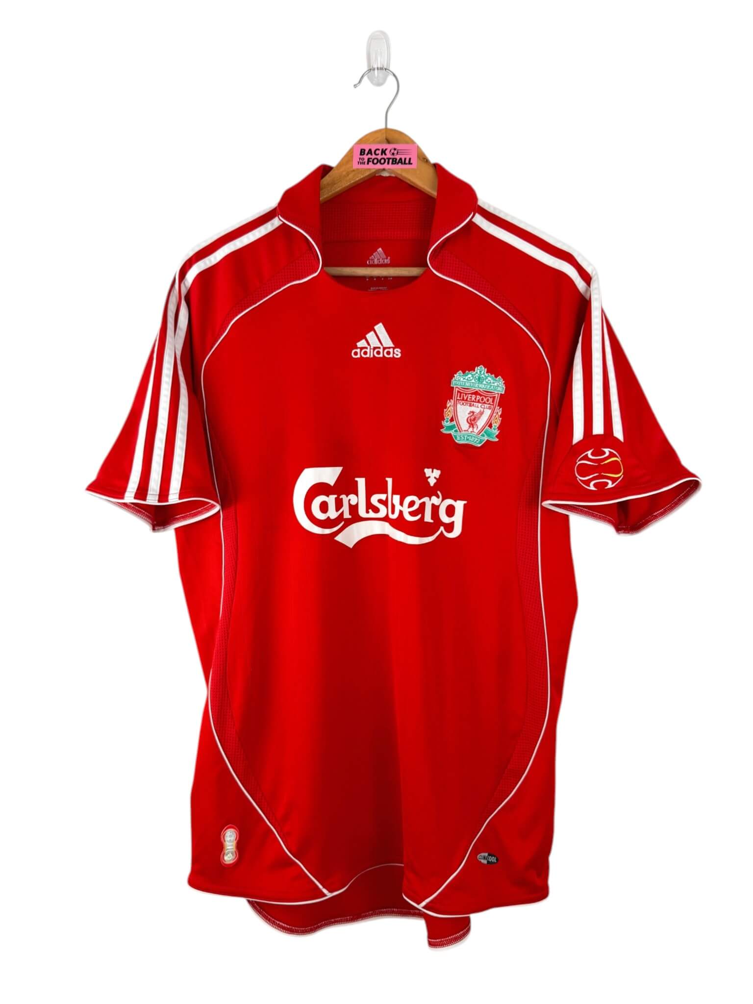 Le maillot : maillot vintage domicile de Liverpool 2006/2008. L’écusson et le logo Adidas sont brodés, le sponsor Carlsberg est floqué. Très beau maillot rétro de Liverpool !
