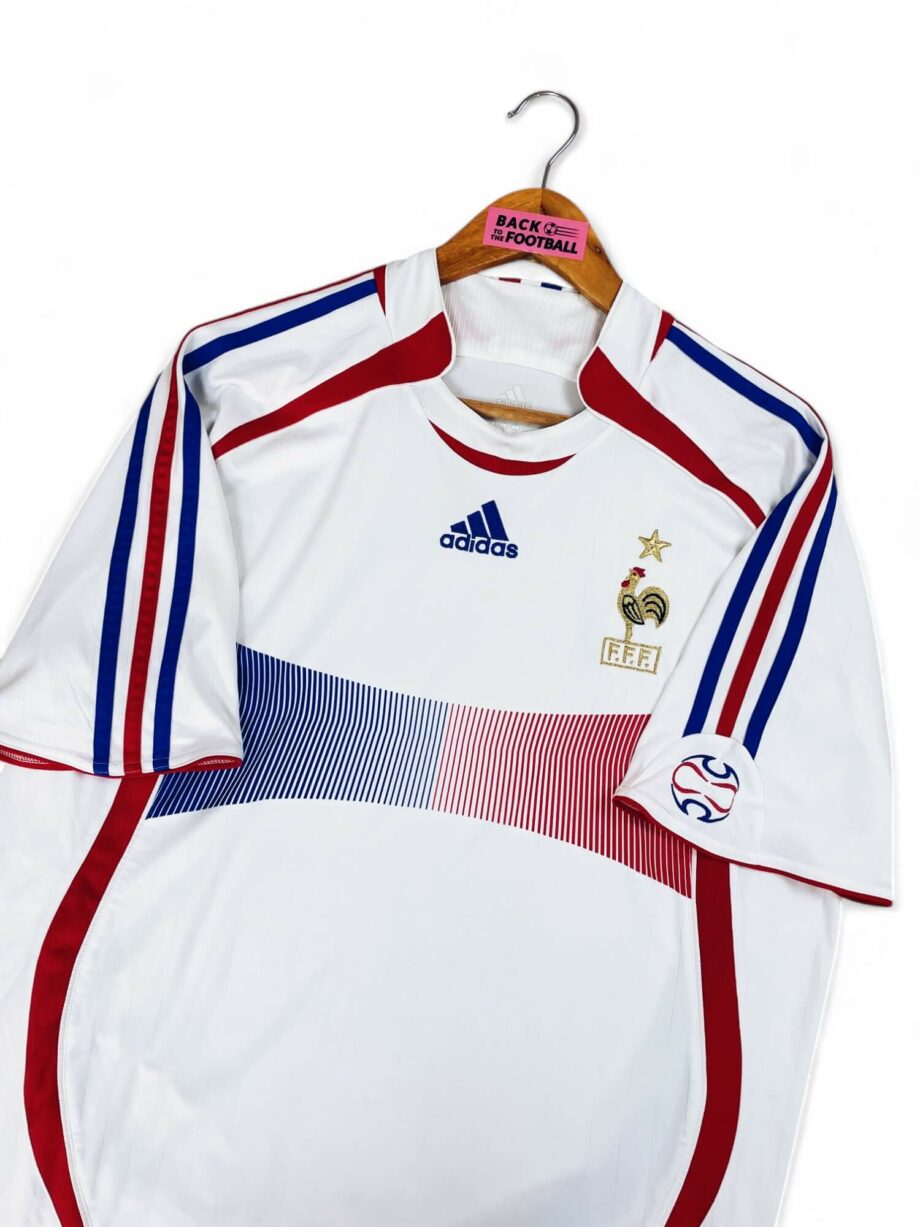 Le maillot : maillot vintage extérieur de l’équipe de France 2006 pour la Coupe du Monde. L’écusson avec l’étoile est brodé, comme le logo Adidas. Très beau maillot rétro de la France !