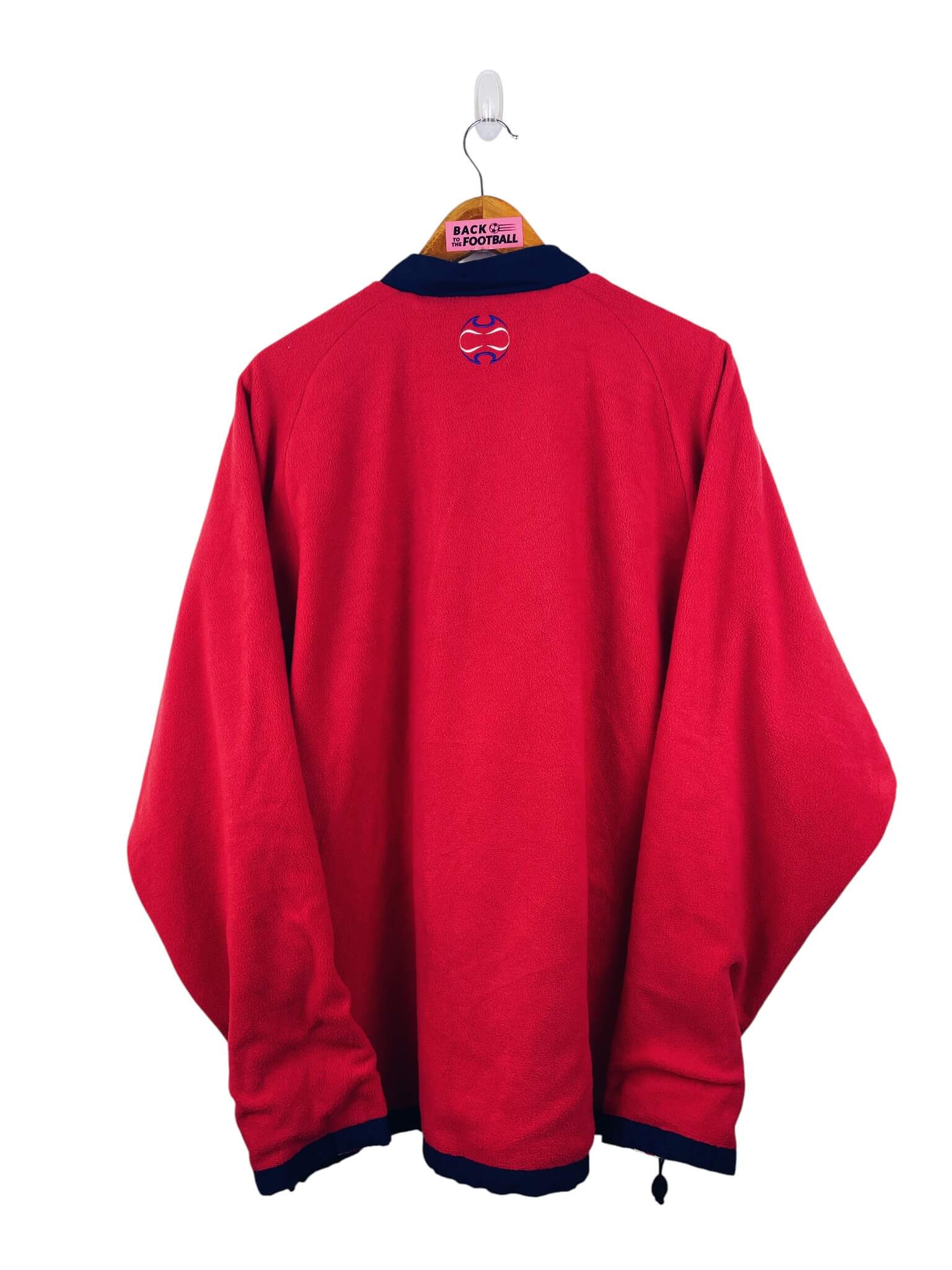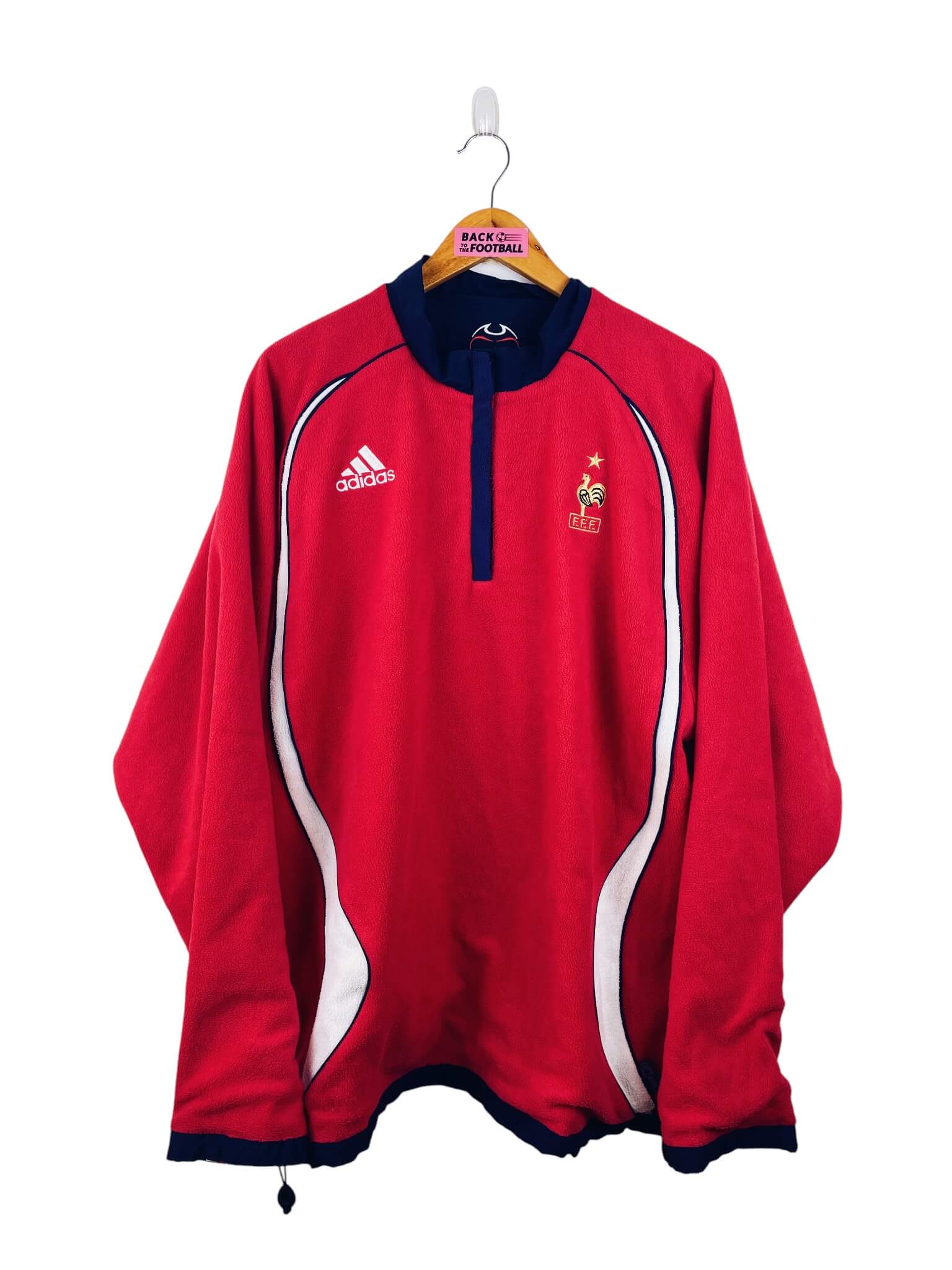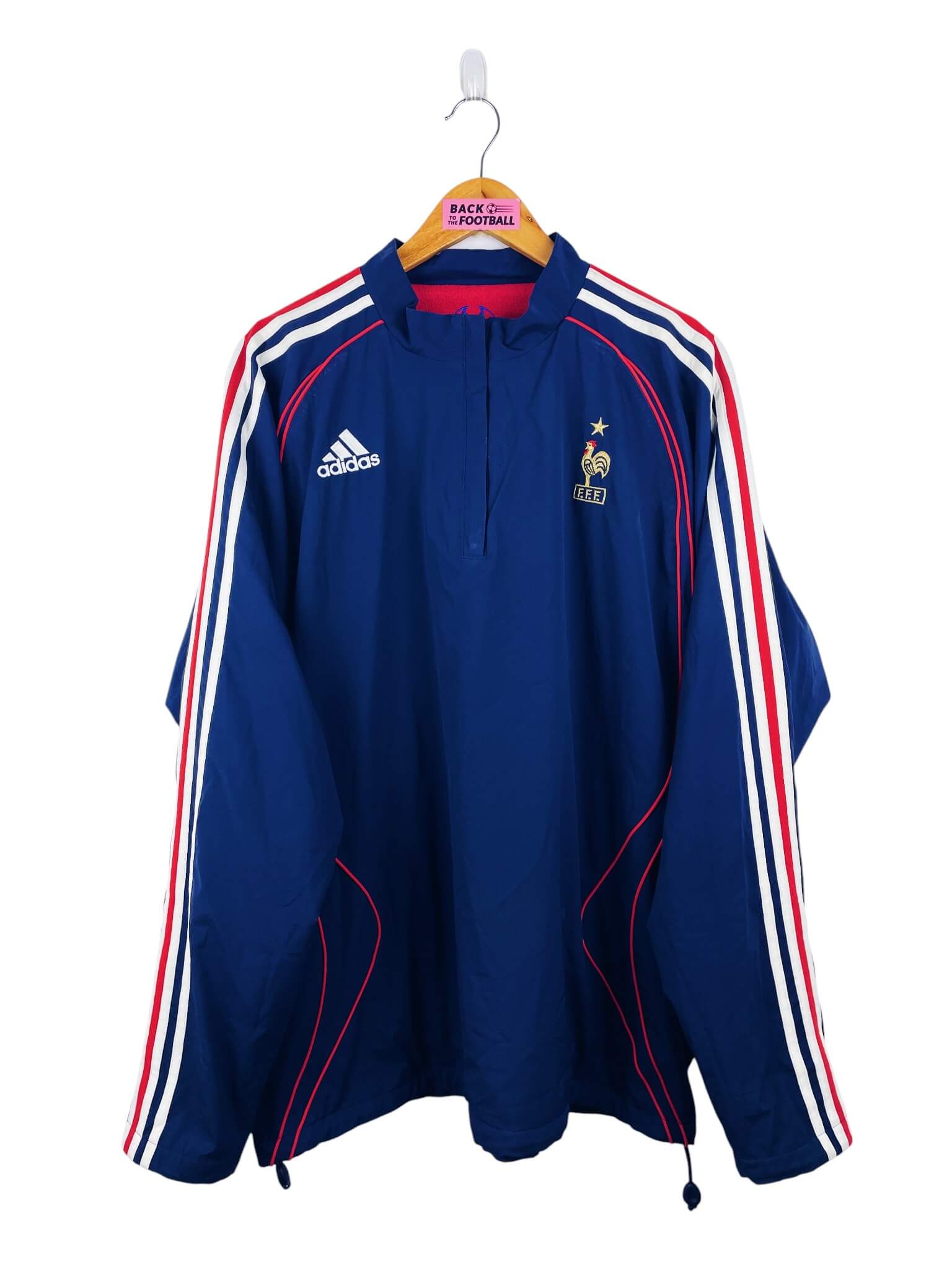 La veste : veste vintage de l’équipe de France 2006 réversible. Côté rouge : polaire, côté bleu : parka. A chaque fois l’écusson et le logo Adidas sont brodés. Très belle veste rétro de la France !